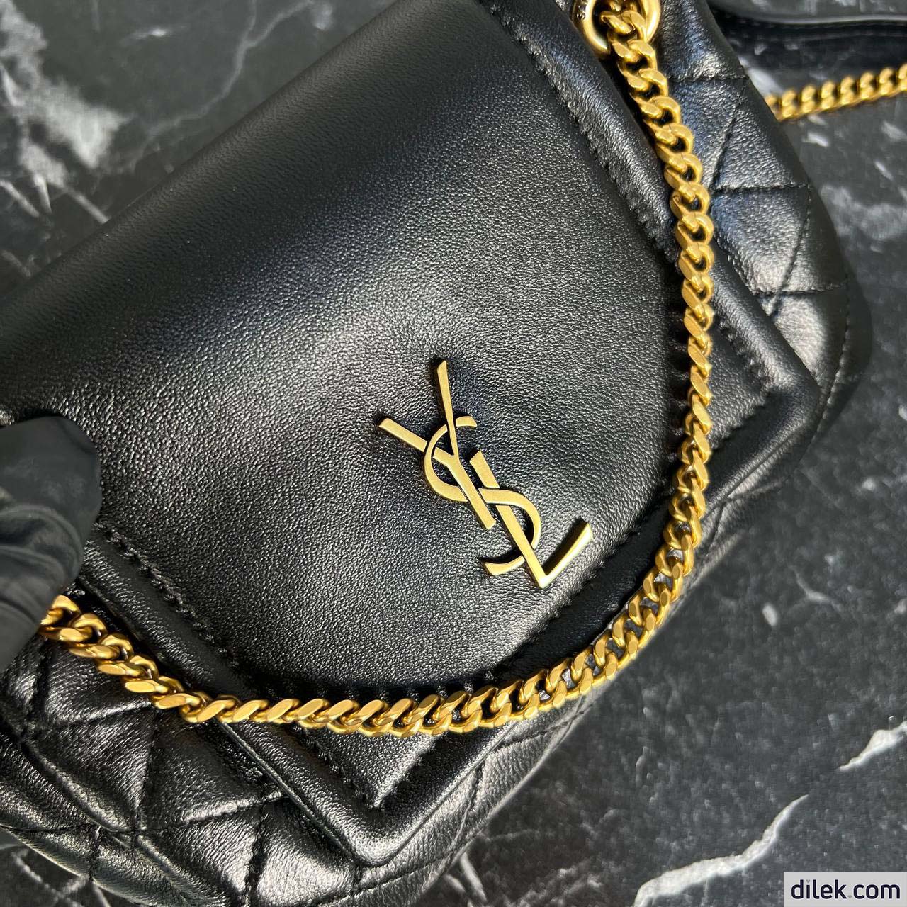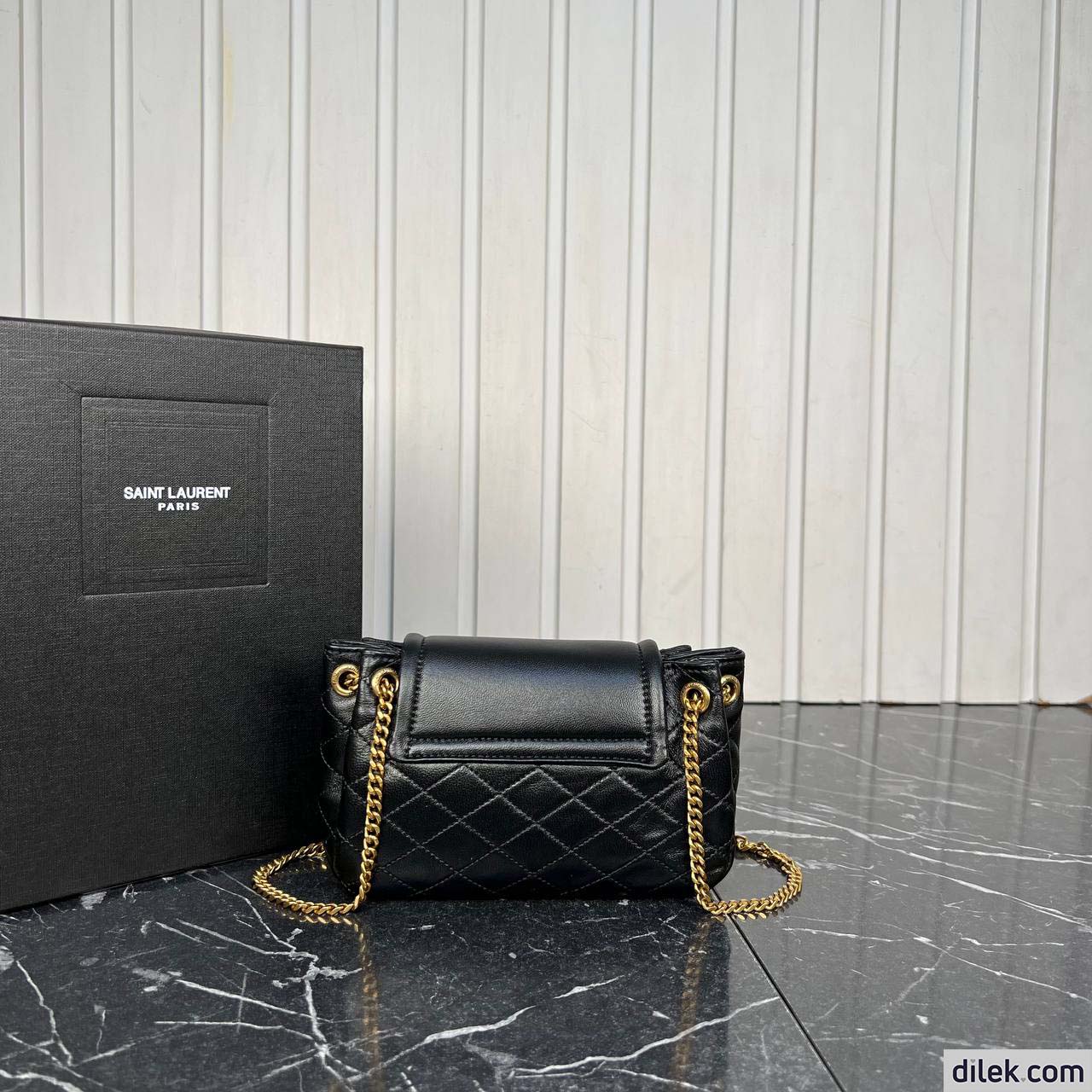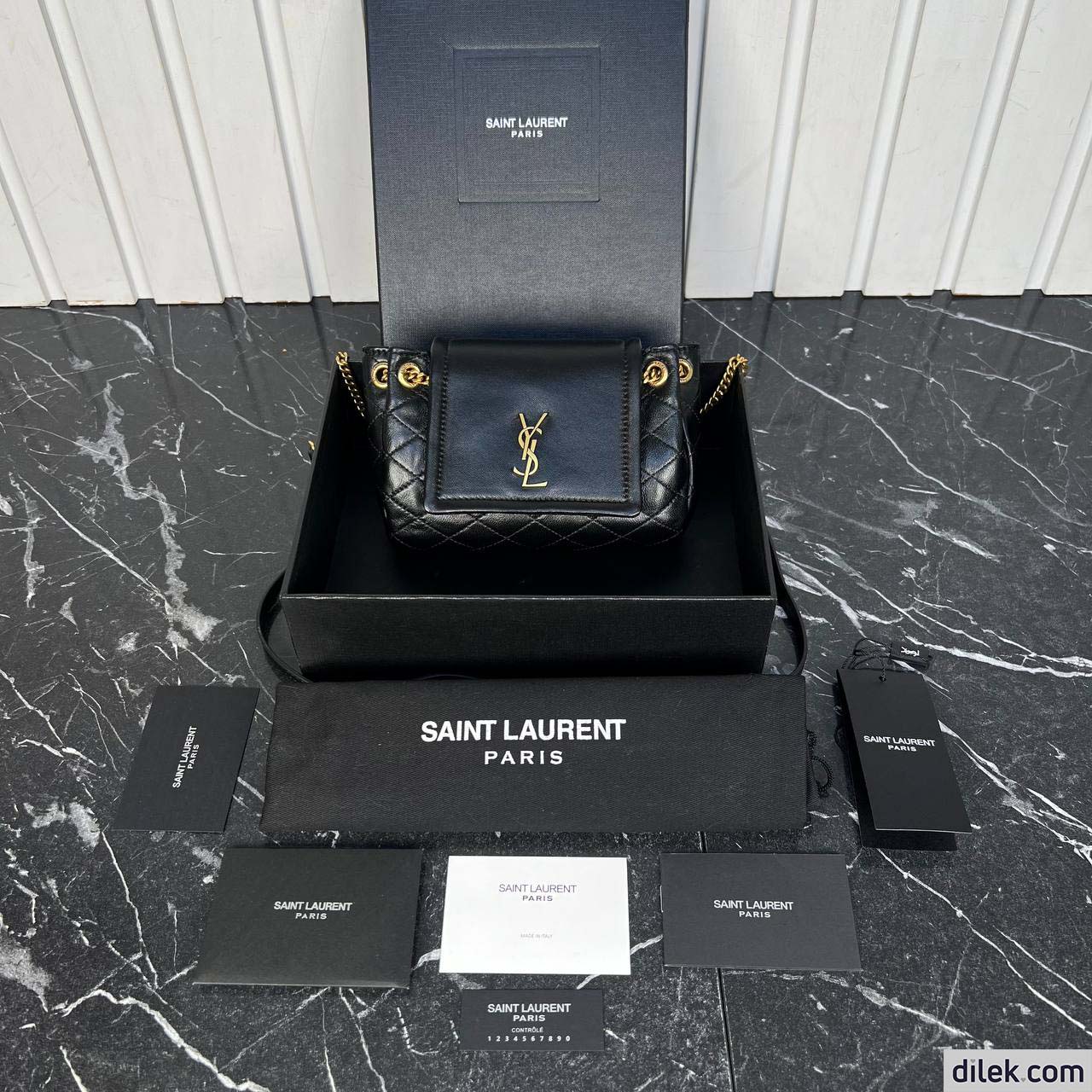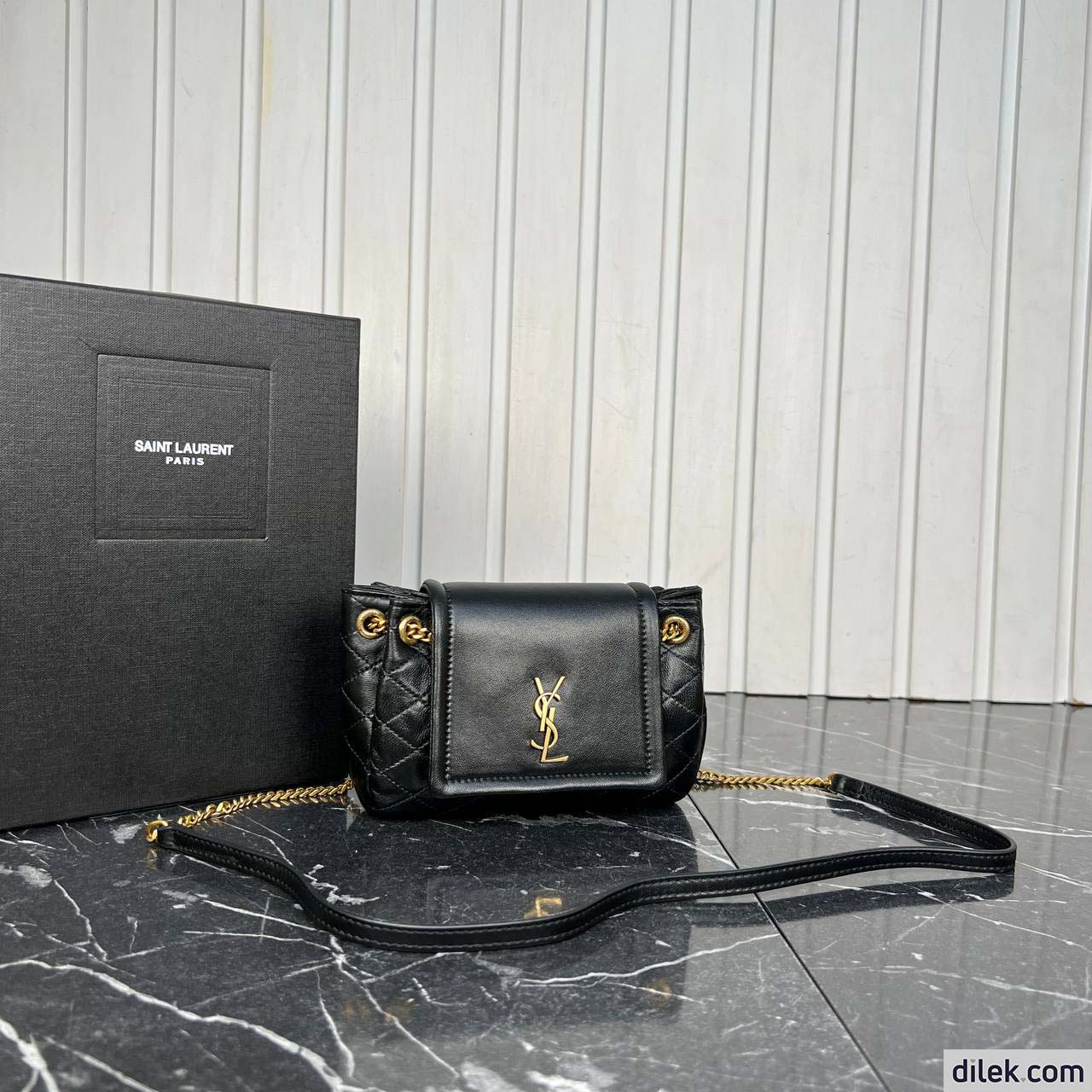 Nolita bag with front flap decorated with metal cassandre, featuring diamond-quilted overstitching and a chain and leather strap that can be worn two ways.