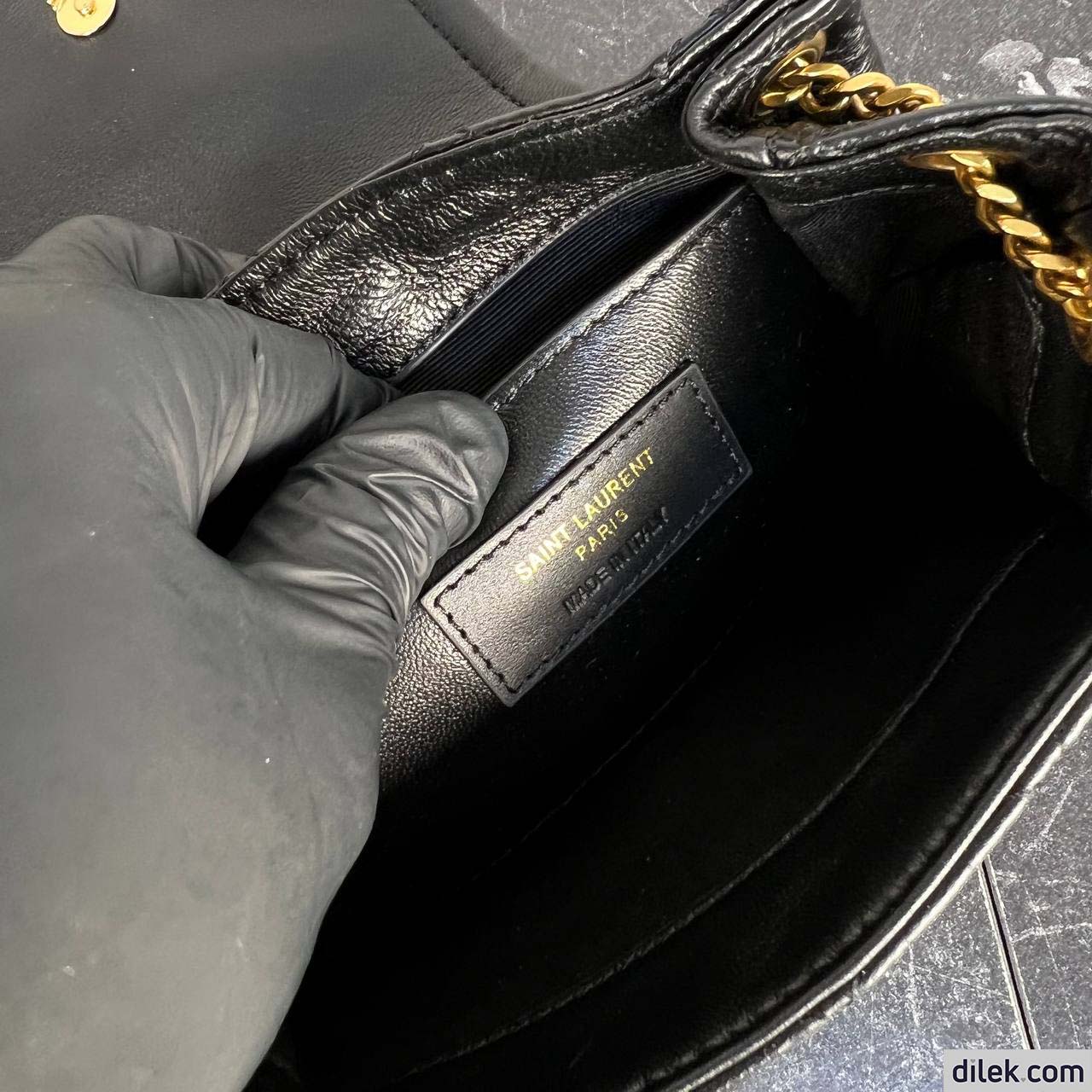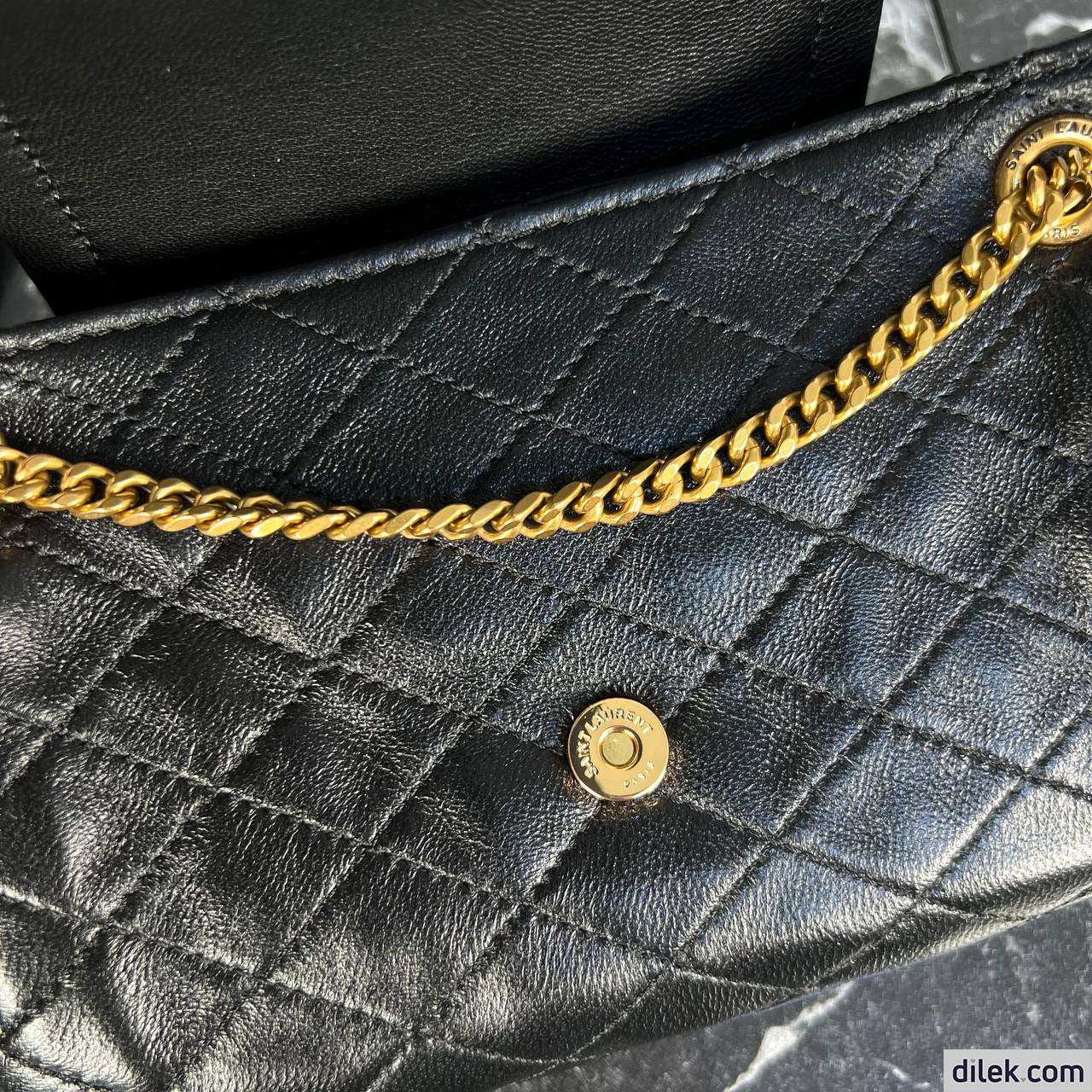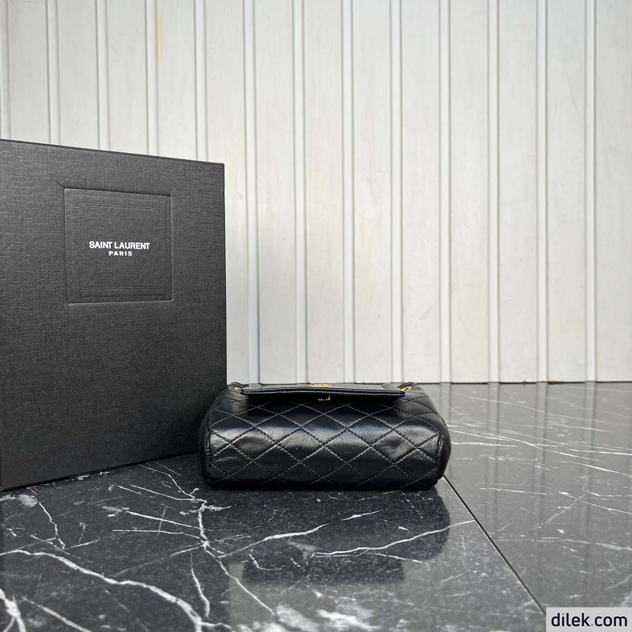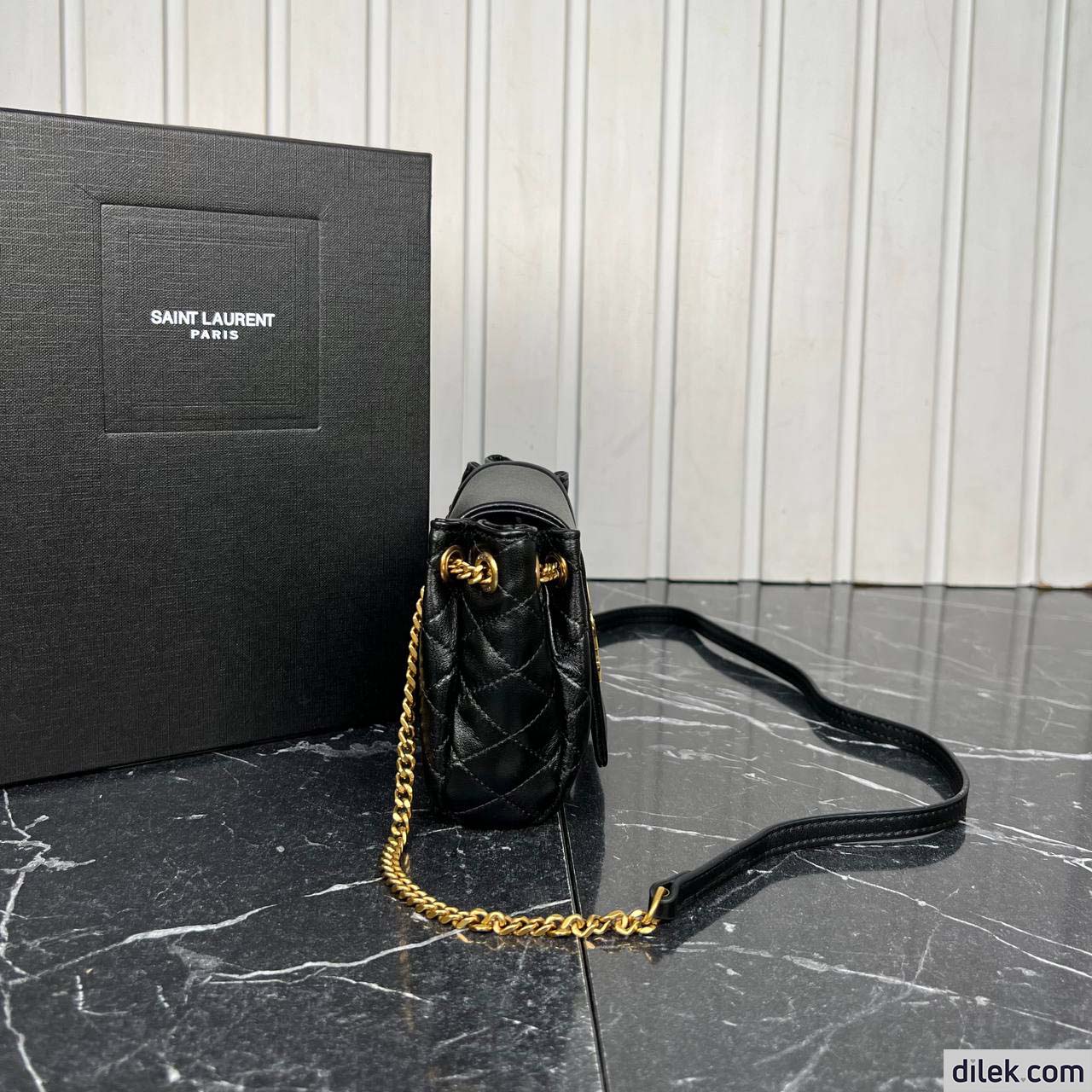 Nolita bag with front flap decorated with metal cassandre, featuring diamond-quilted overstitching and a chain and leather strap that can be worn two ways.
