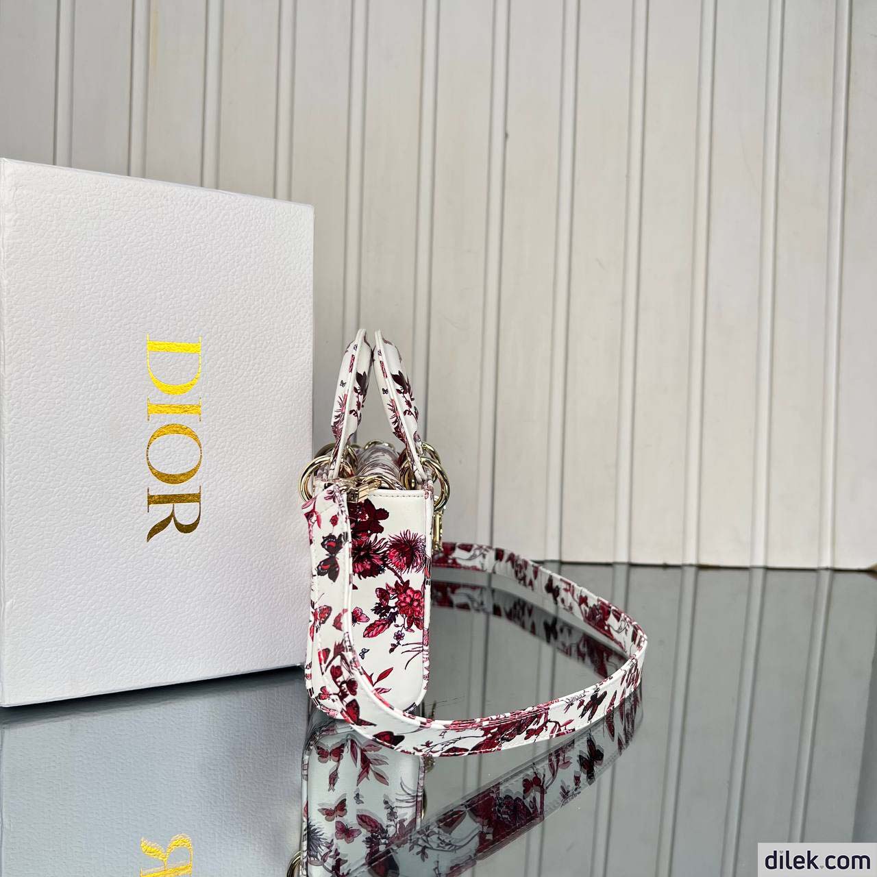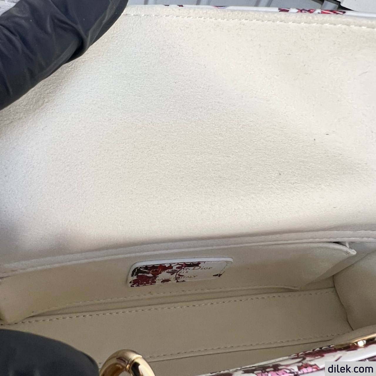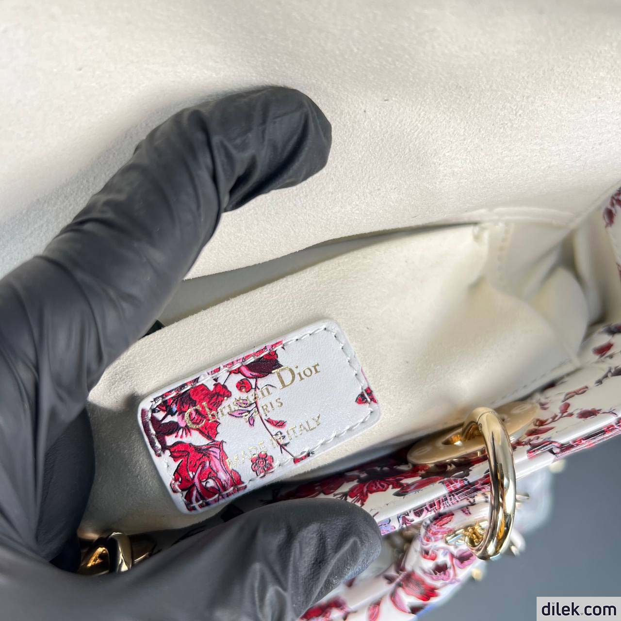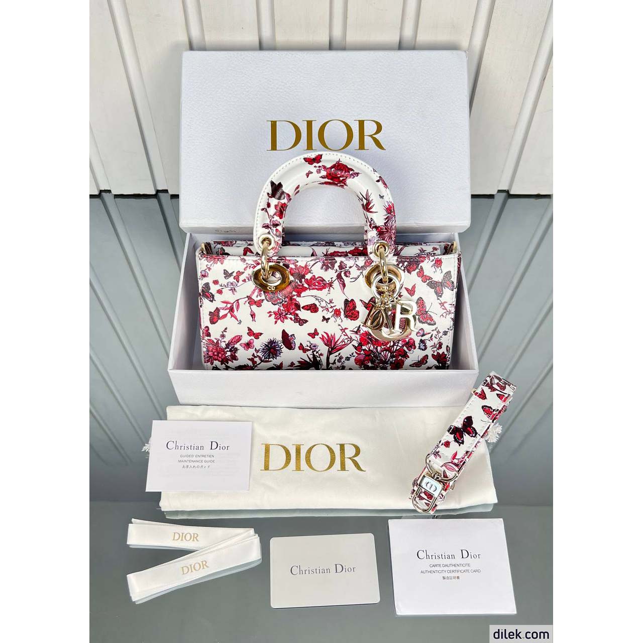 The Lady D-Joy bag captures the House's vision of elegance and beauty by showcasing the iconic streamlined aesthetic of the Lady Dior line. Constructed in calfskin, the bag is embroidered with the ecru multicolor Dior 4 Saisons Ete Soleil motif by Pietro Ruffo, celebrating the season's signature sun theme with a bucolic summery design punctuated by the words, Le soleil brillant, l'ete celebre sa joie sans fin. Pale gold-finish metal D.I.O.R. charms enhance and illuminate the silhouette. Featuring one removable chain strap and another adjustable and removable leather strap, the small Lady D-Joy bag can be carried by hand, worn over the shoulder or crossbody as a daily companion.
