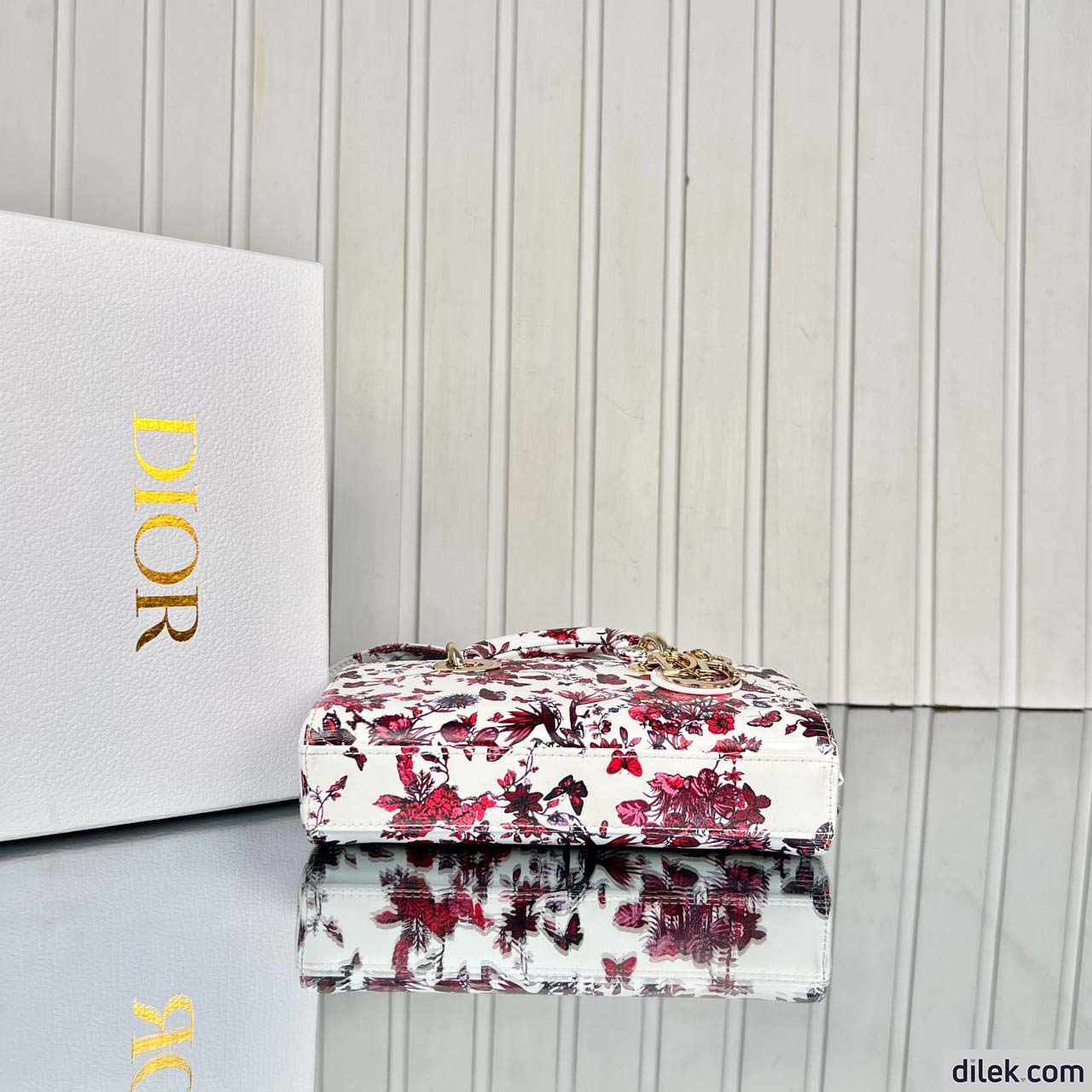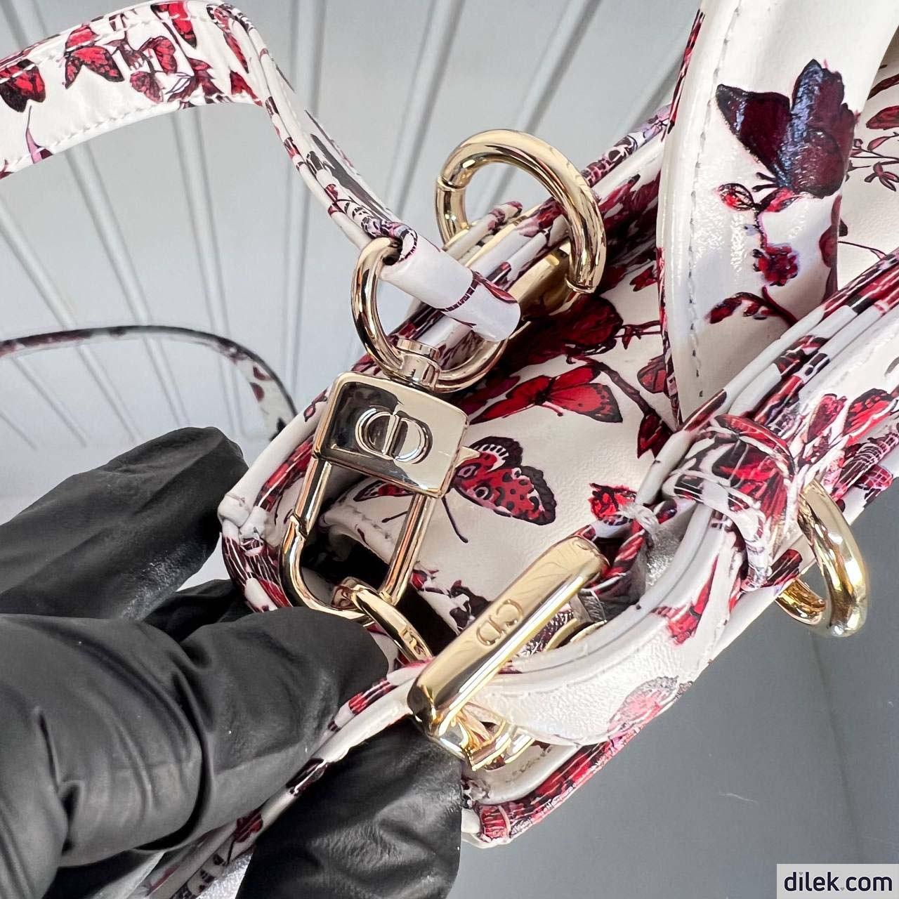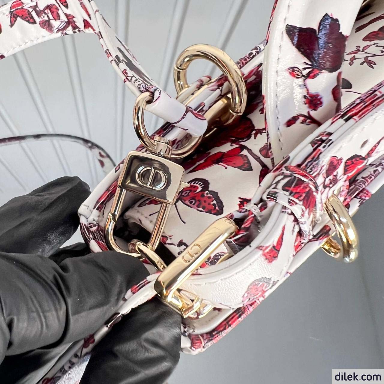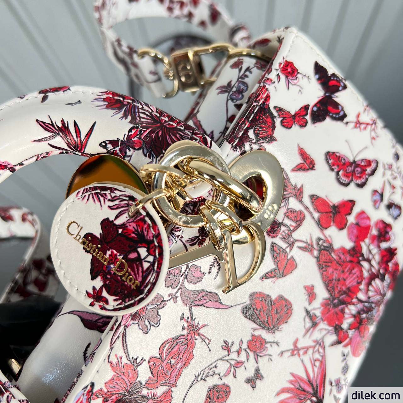 The Lady D-Joy bag captures the House's vision of elegance and beauty by showcasing the iconic streamlined aesthetic of the Lady Dior line. Constructed in calfskin, the bag is embroidered with the ecru multicolor Dior 4 Saisons Ete Soleil motif by Pietro Ruffo, celebrating the season's signature sun theme with a bucolic summery design punctuated by the words, Le soleil brillant, l'ete celebre sa joie sans fin. Pale gold-finish metal D.I.O.R. charms enhance and illuminate the silhouette. Featuring one removable chain strap and another adjustable and removable leather strap, the small Lady D-Joy bag can be carried by hand, worn over the shoulder or crossbody as a daily companion.