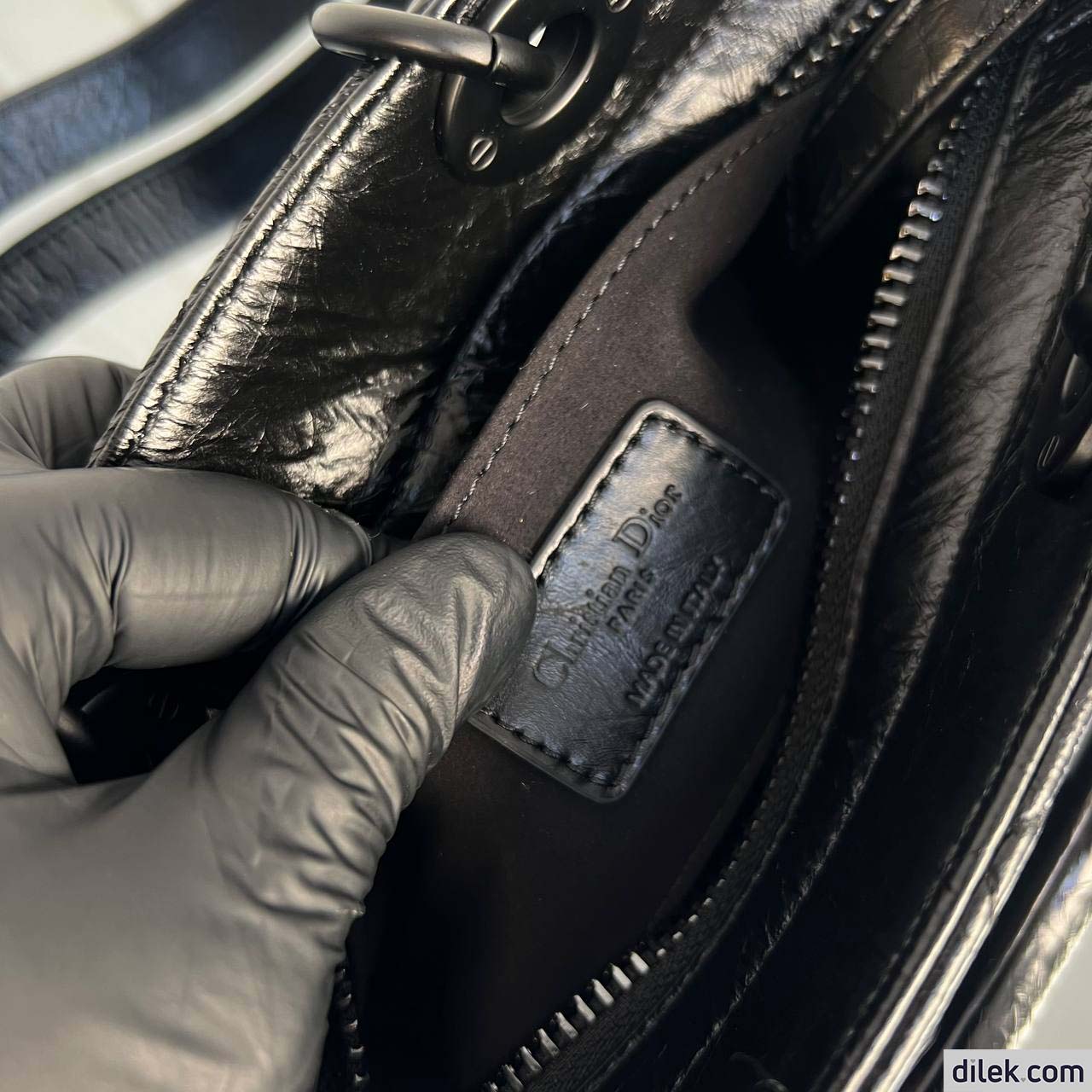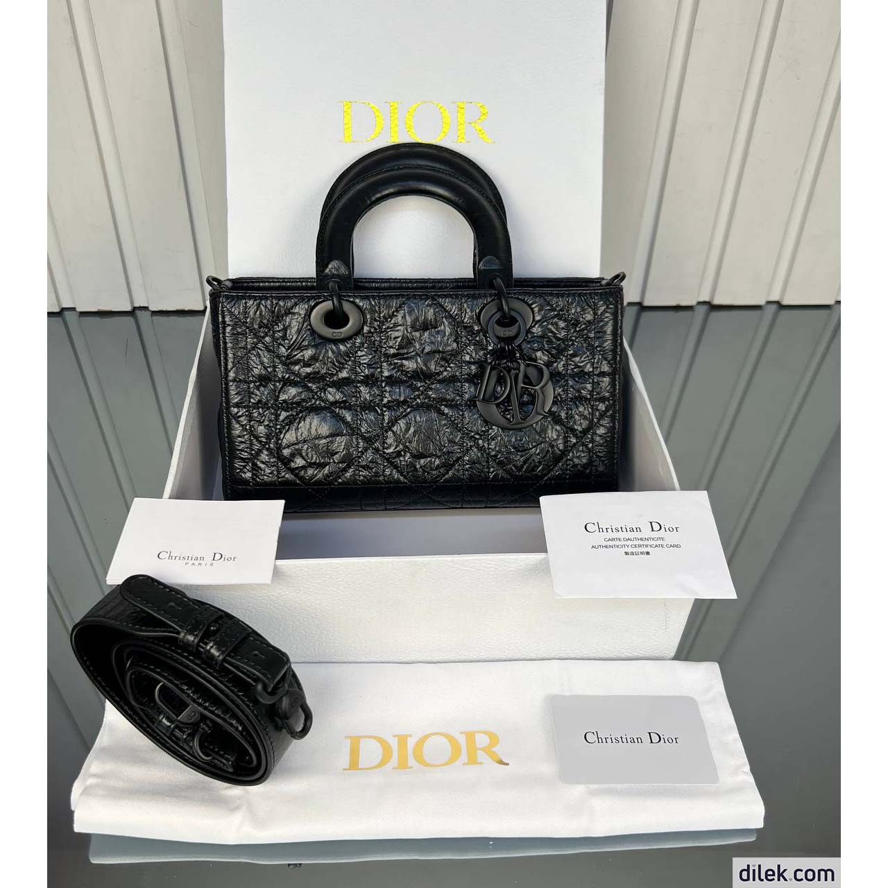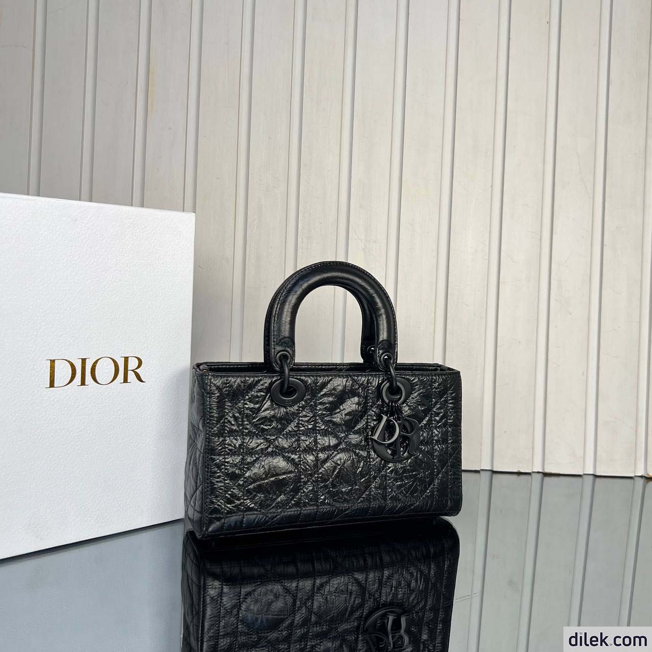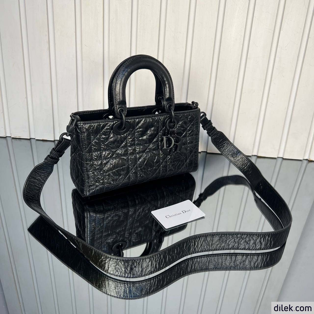New for the season and appearing in the Spring-Summer 2024 Fashion Show, the Lady D-Sire My ABCDior bag draws inspiration from the iconic elegance of the Lady Dior design. Reimagined with a casual style for an urban look, the black crinkled calfskin is accented by Macrocannage topstitching, while tonal ultra-matte metal D.I.O.R. charms lend a modern touch. Showcasing a shoulder strap that can be personalized by adding symbolic badges, the unique medium bag can be carried by hand or worn crossbody.