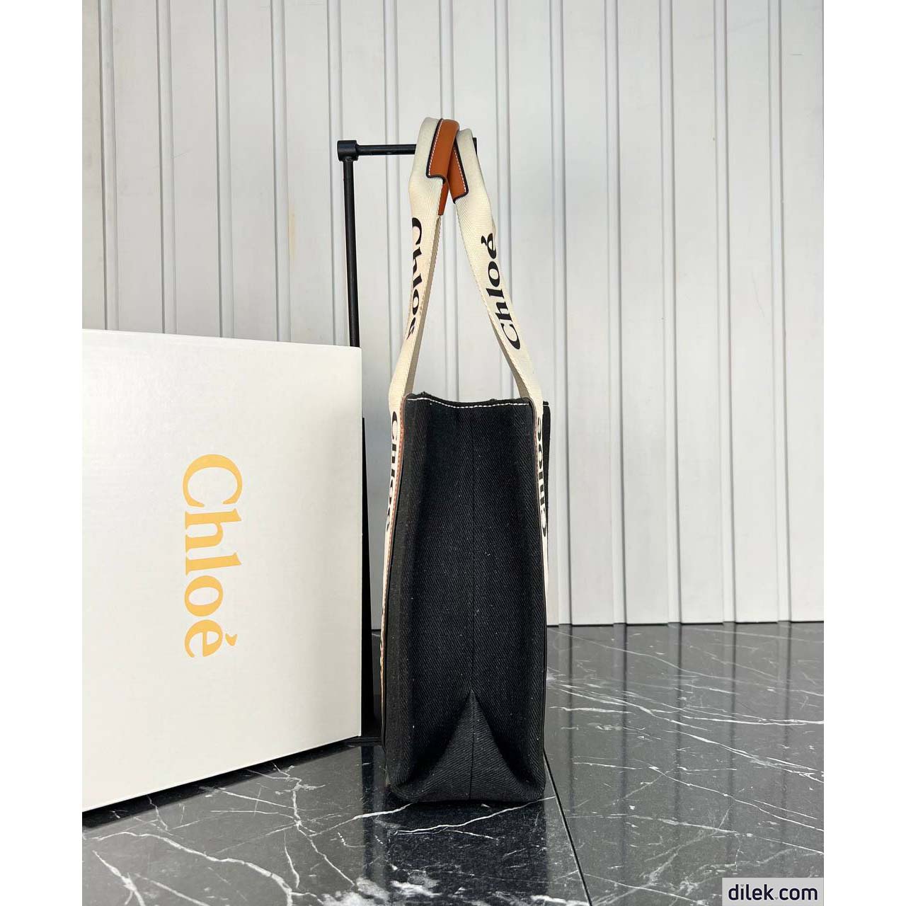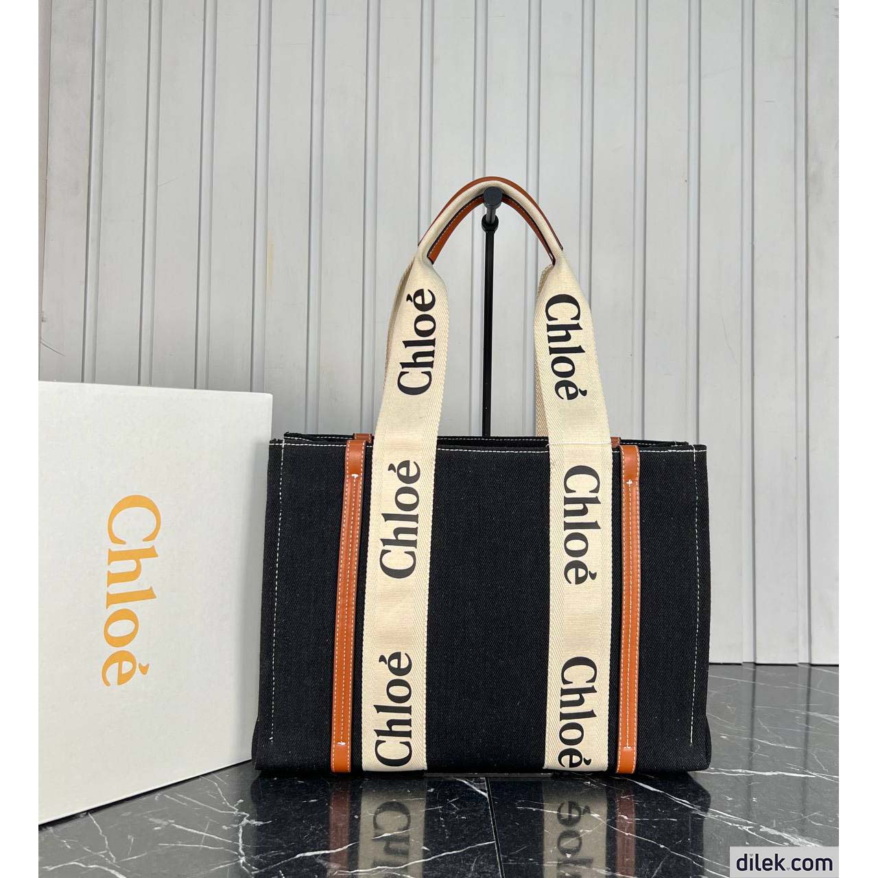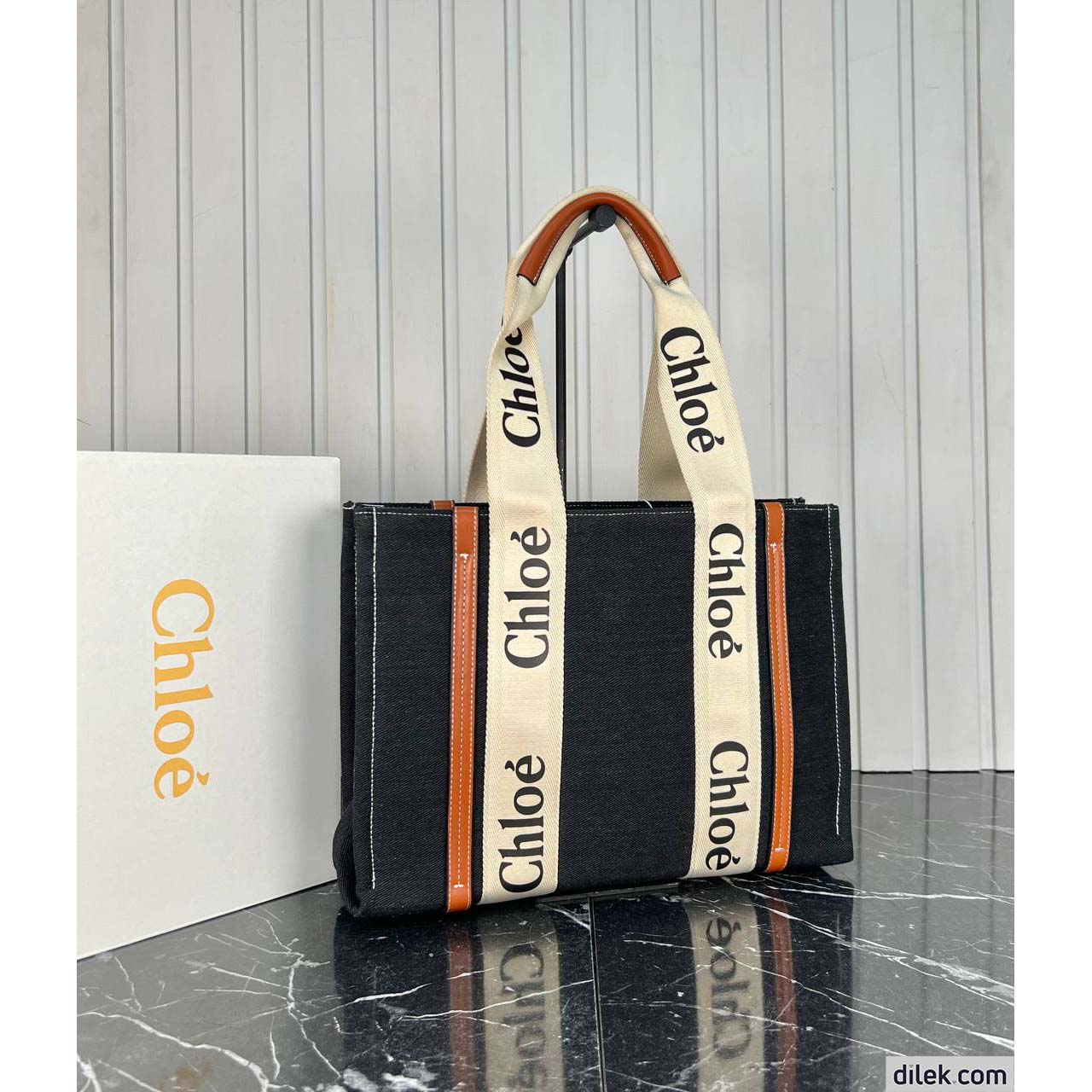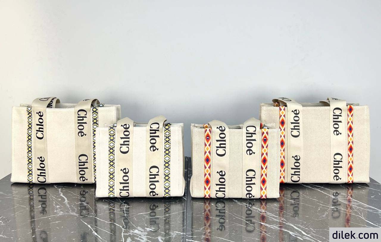 Crafted from lower-impact linen canvas detailed with shiny calfskin strips, this medium Woody tote bag is a spacious bag with a strong summer attitude. The roomy inside compartment includes a practical flat pocket. The bag's modern lines are emphasized by the contrasting vertical leather strips and the signature Chloé logo ribbon. Carry this tote bag comfortably on the shoulder.