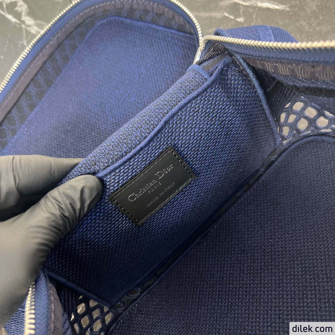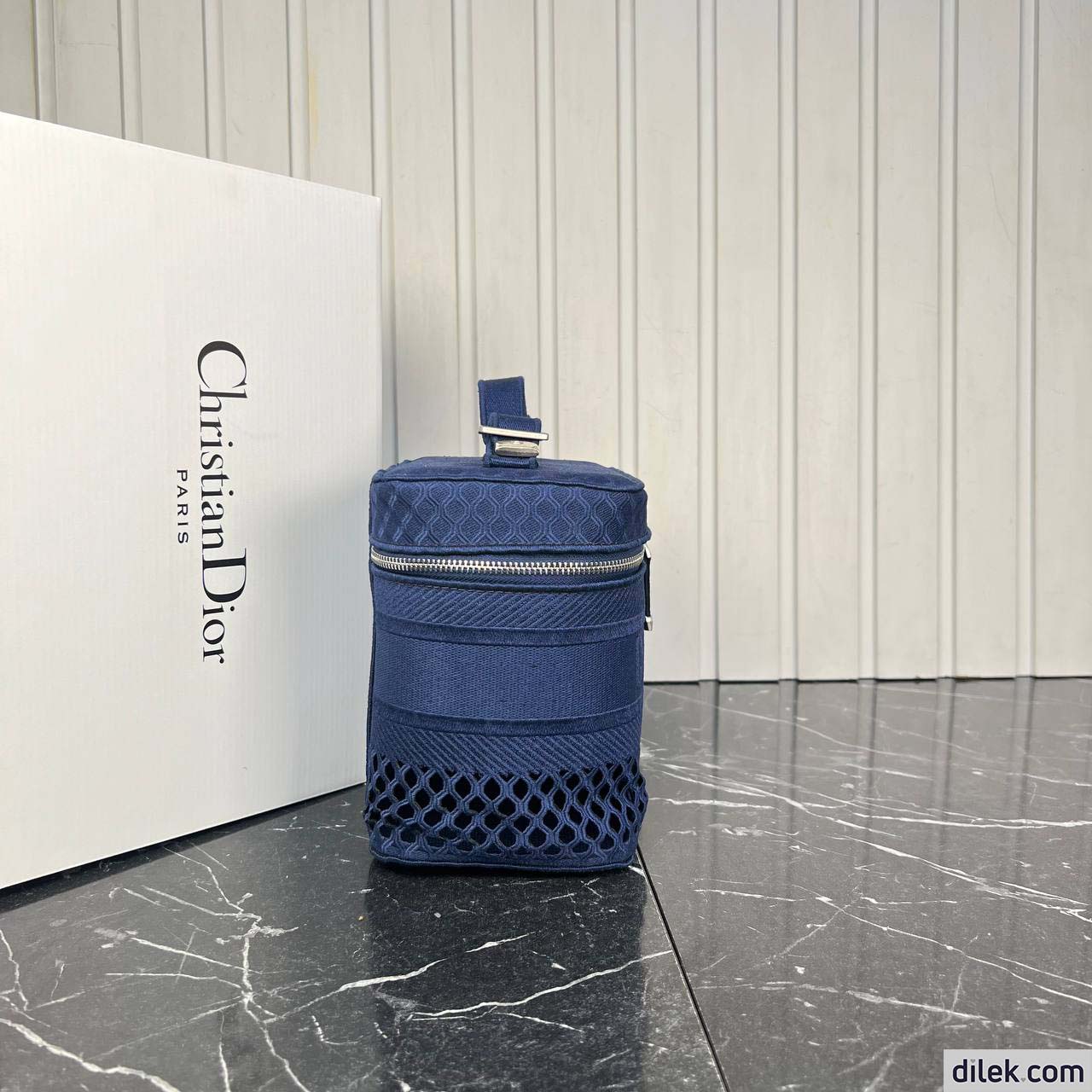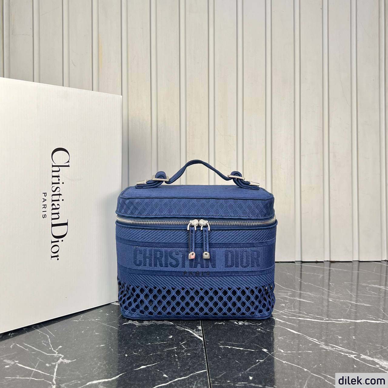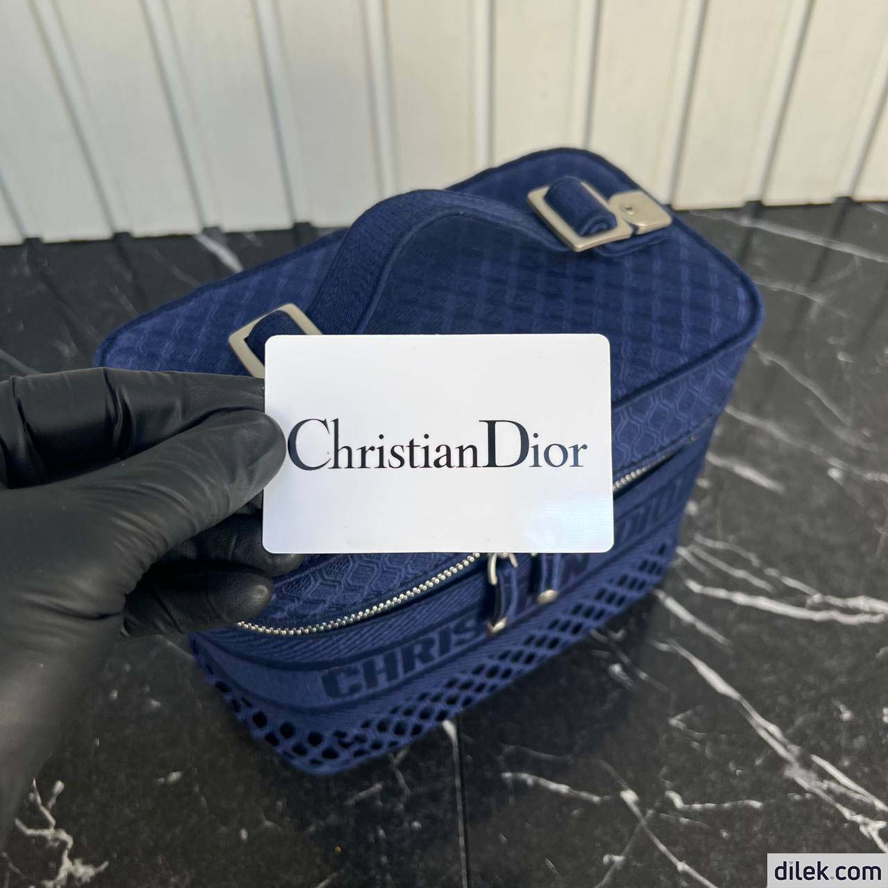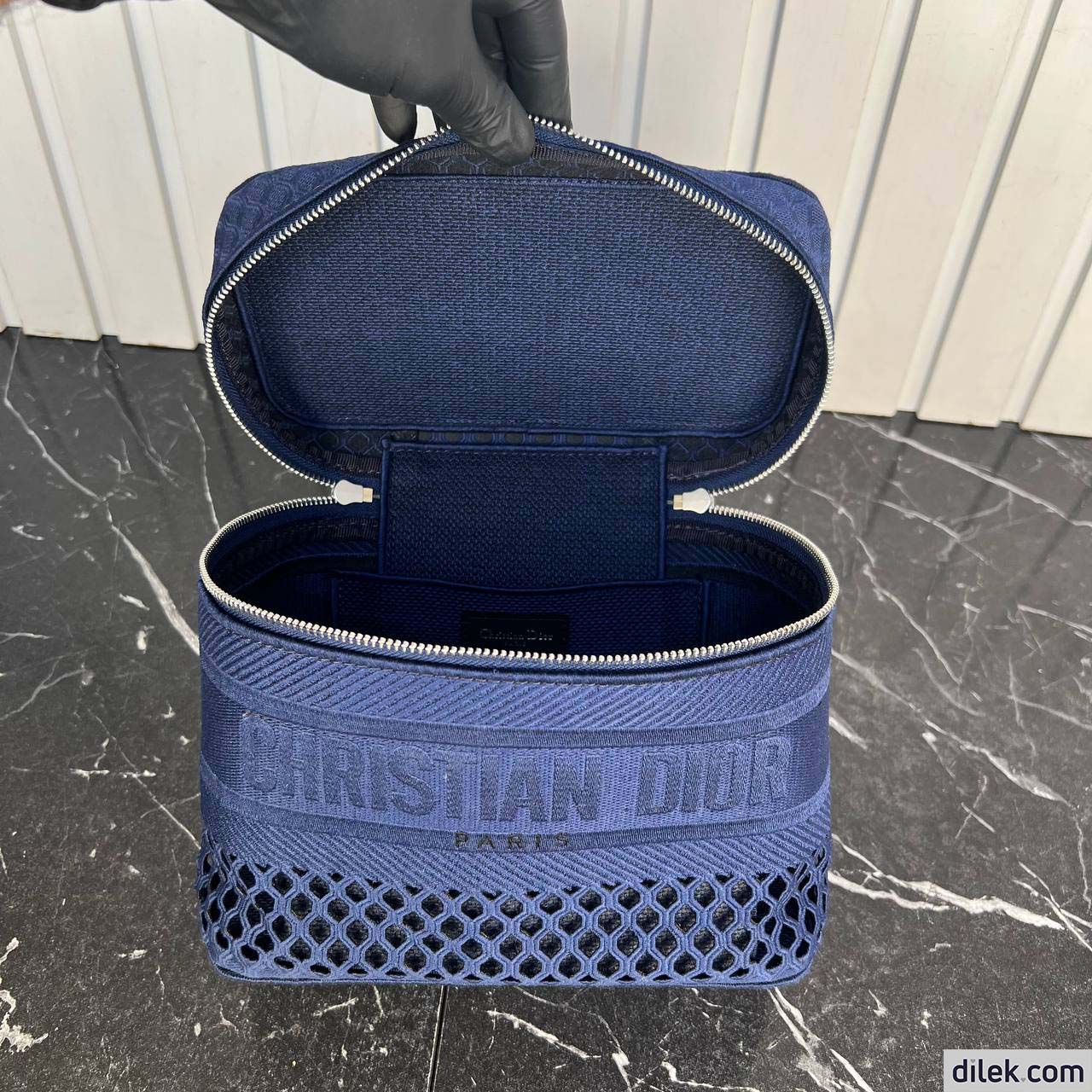 The DiorTravel vanity case is offered with a fully embroidered blue Dior Oblique motif and is embellished with the Christian Dior Paris signature on the front. The design is completed by a tonal embroidered removable and adjustable shoulder strap. The small shape is a prime example of Dior savoir-faire and is the ideal travel companion. The accessory may be coordinated with other DiorTravel creations.