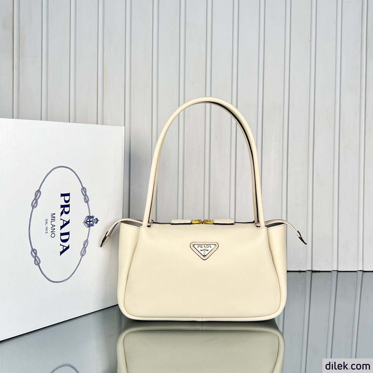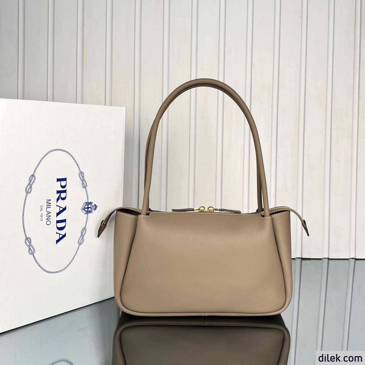 This bag with a sophisticated, contemporary design features simple yet refined details, brightened by the metal hardware. The versatile style has sleek, minimalist lines emphasized by the buttery feel of soft grain leather. The accessory, an expression of exceptional artisanal know-how, is decorated with the iconic enameled metal triangle logo.