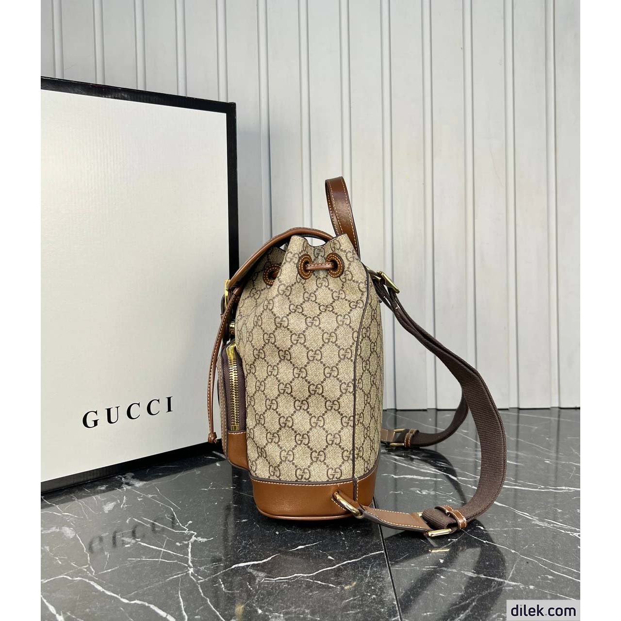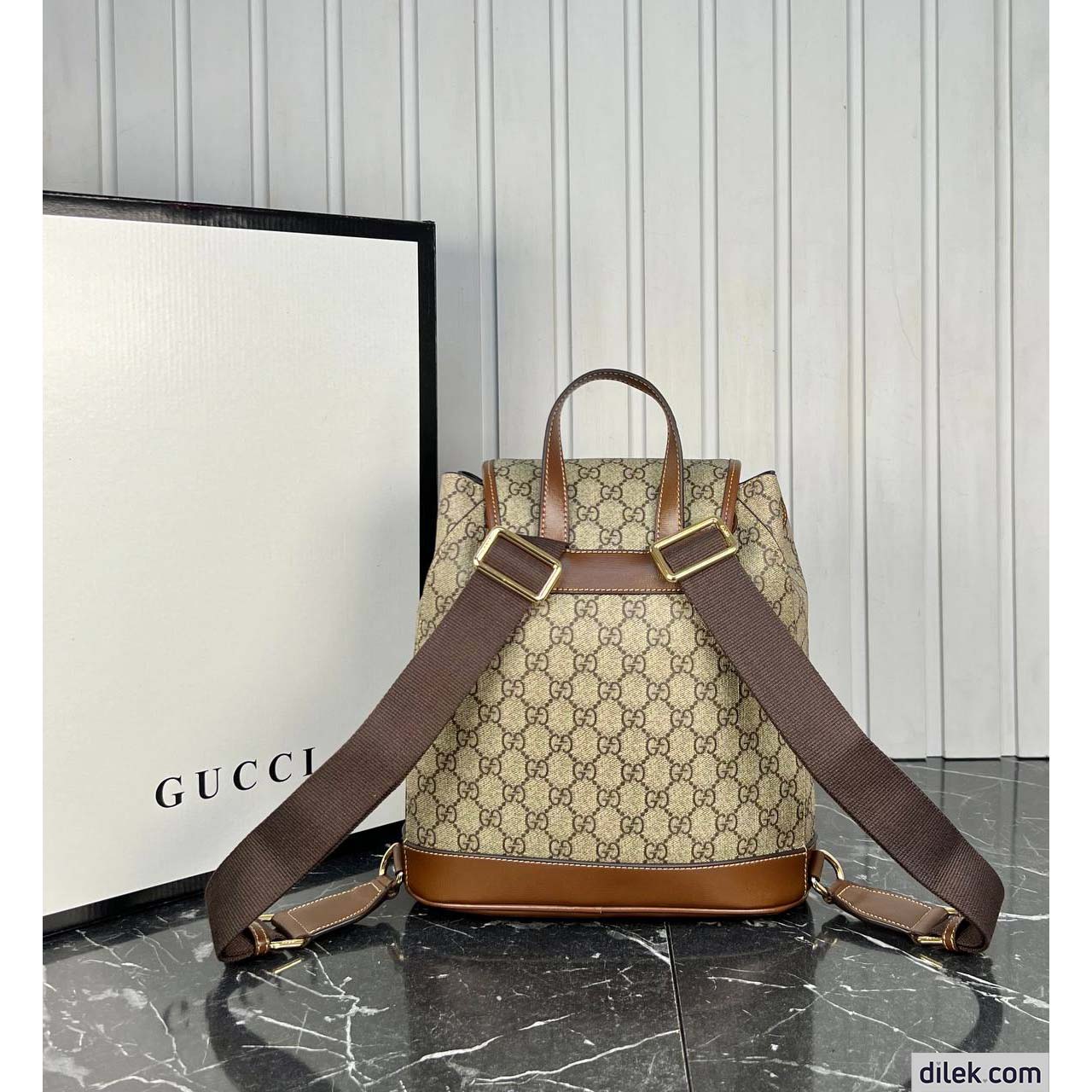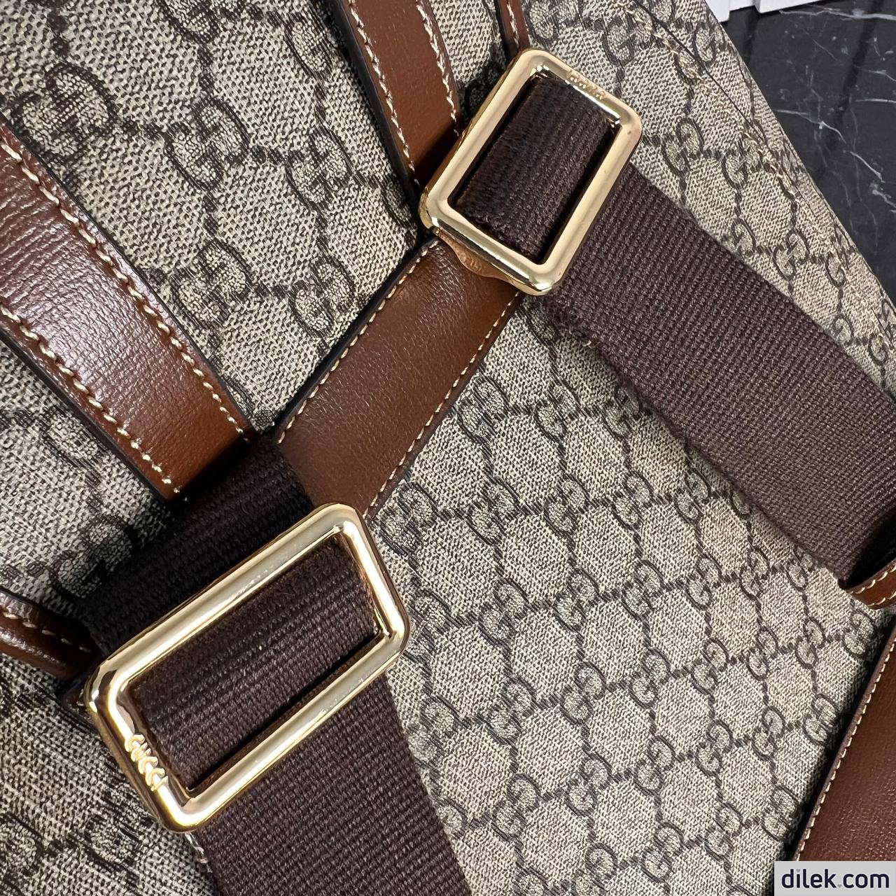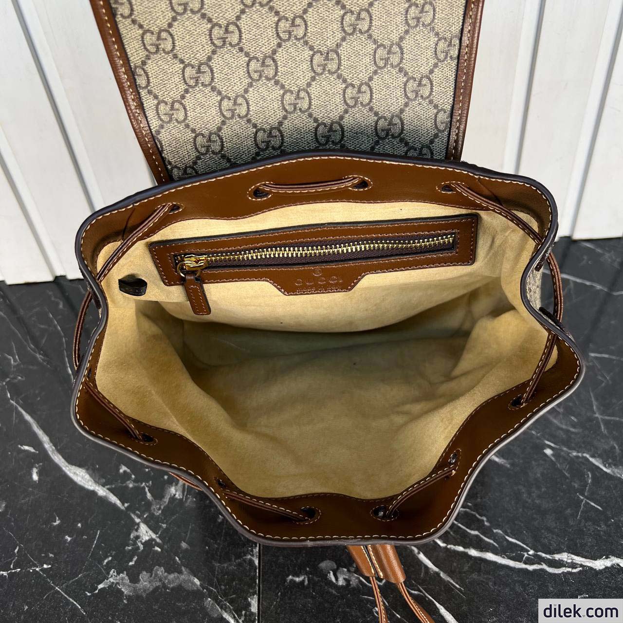 Materials, colors and House codes come together to infuse styles with a vintage feel. Here, this backpack is crafted from beige and ebony GG Supreme canvas with a brown leather trim. The style is completed by one of Gucci's most historic codes the Interlocking G.
