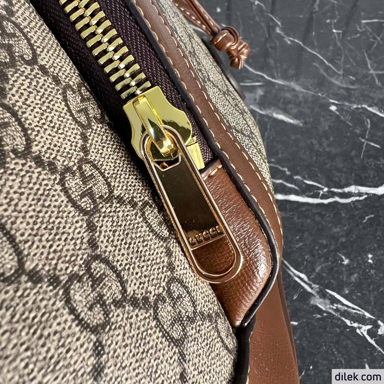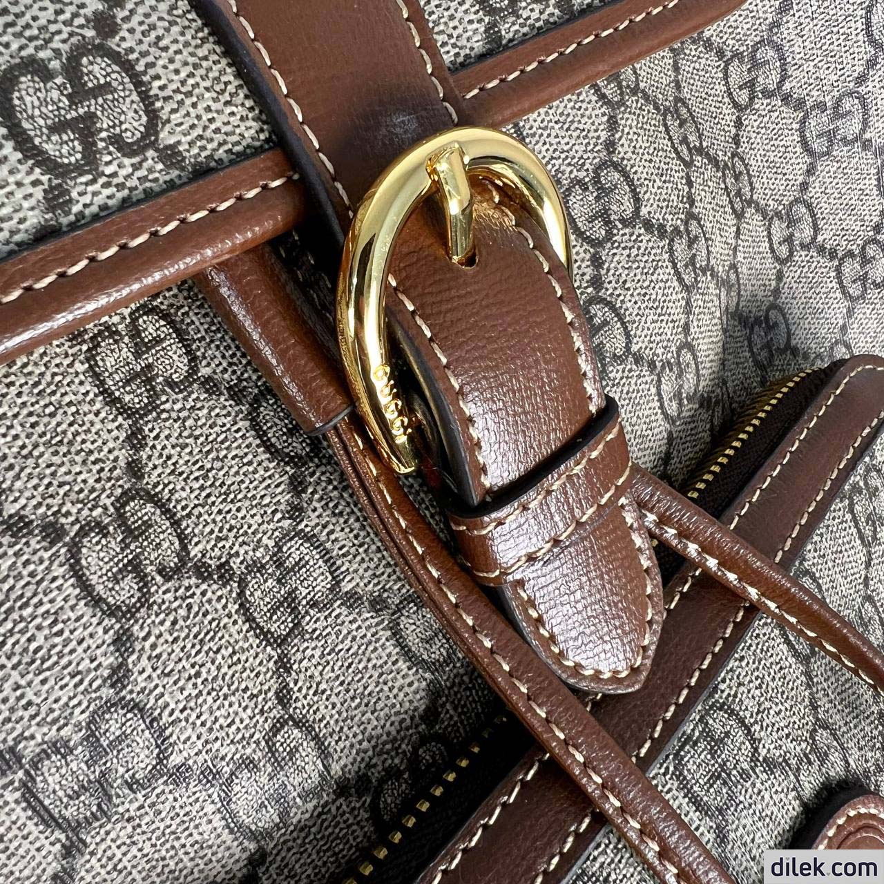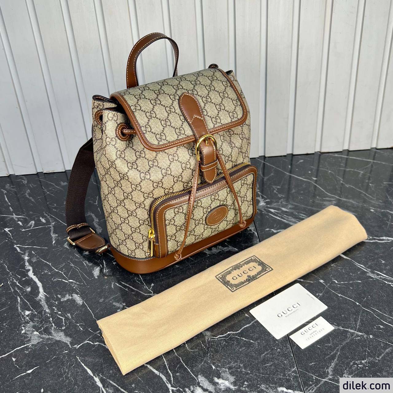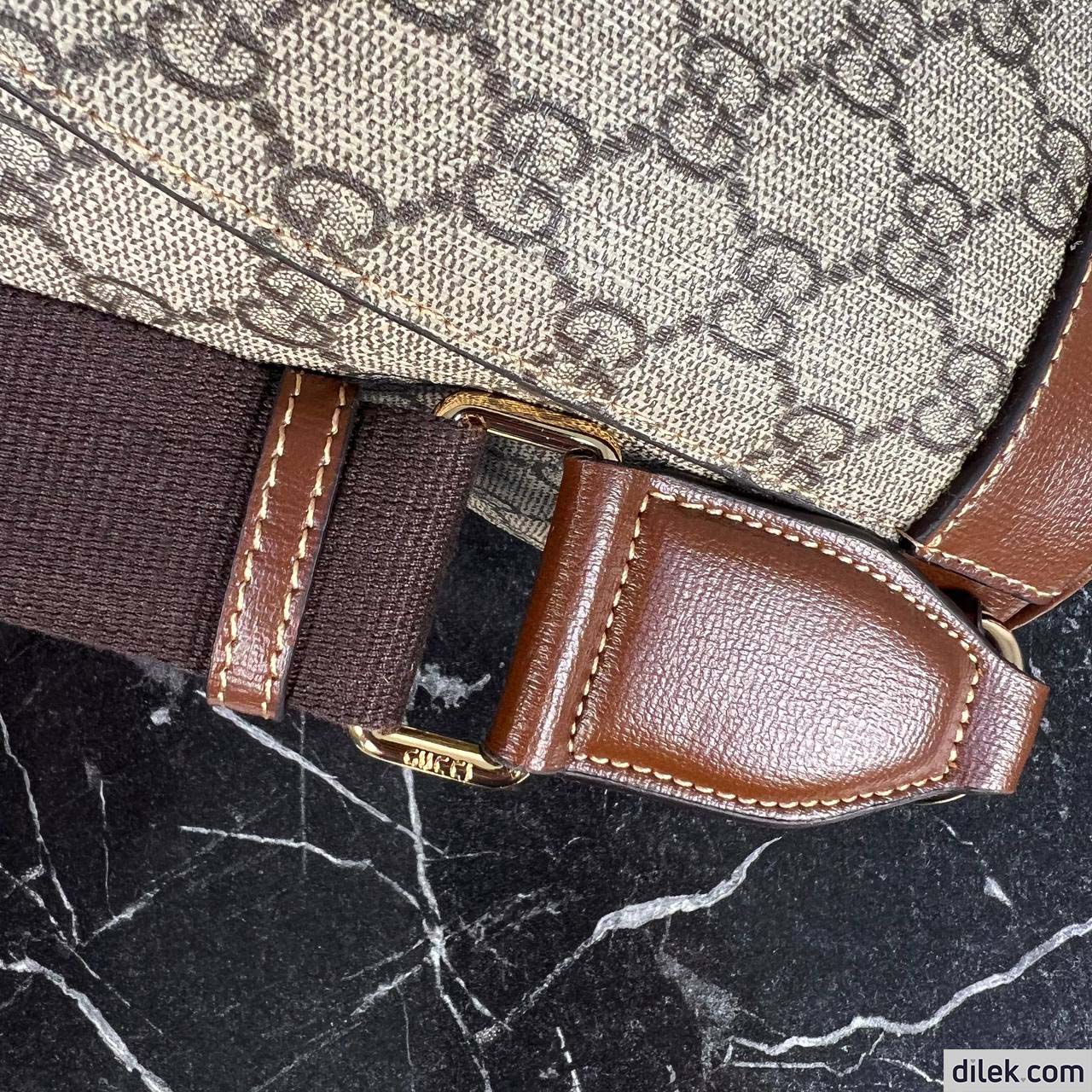 Materials, colors and House codes come together to infuse styles with a vintage feel. Here, this backpack is crafted from beige and ebony GG Supreme canvas with a brown leather trim. The style is completed by one of Gucci's most historic codes the Interlocking G.