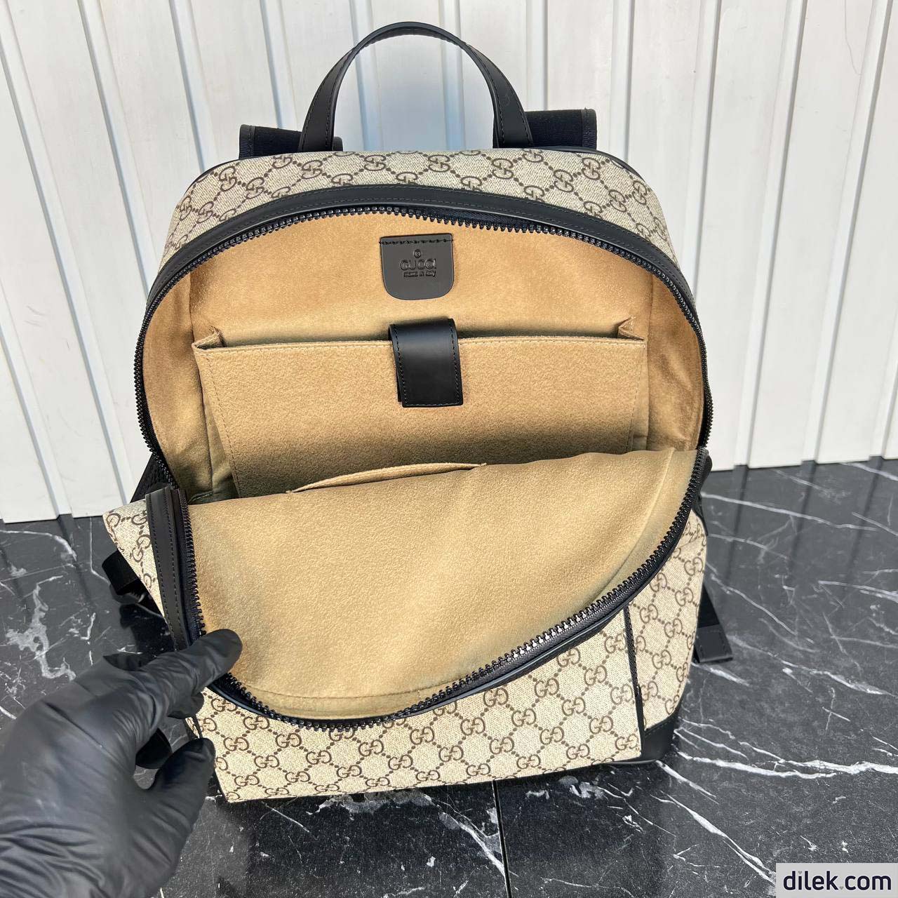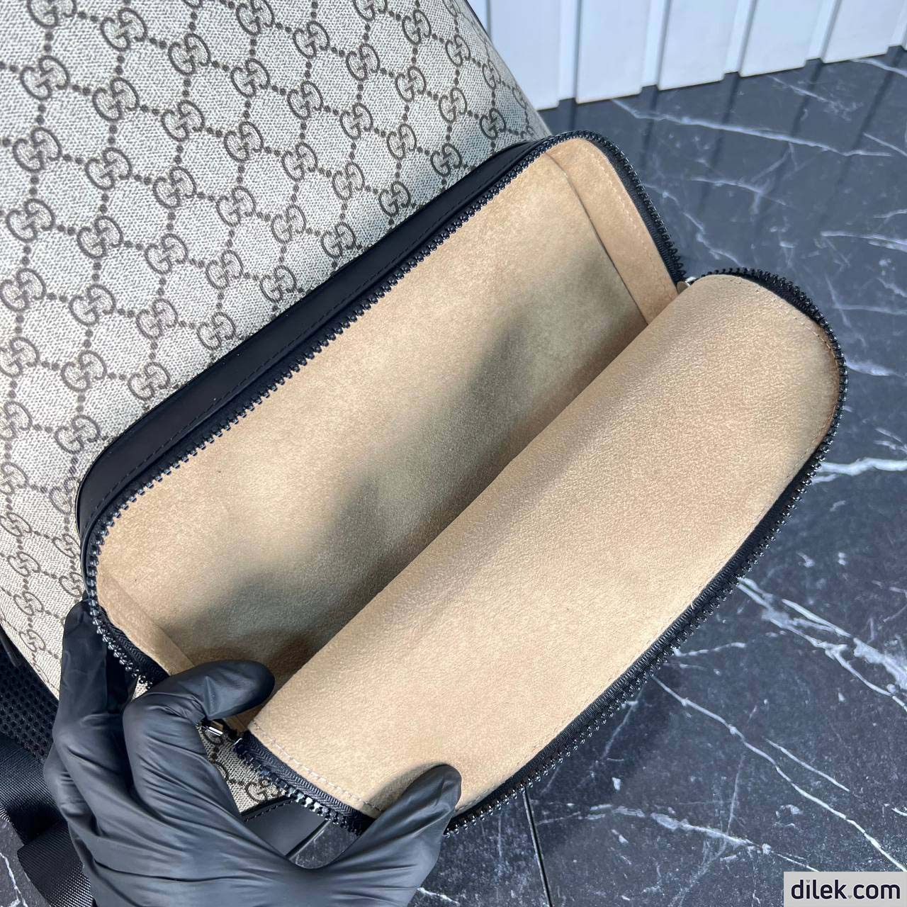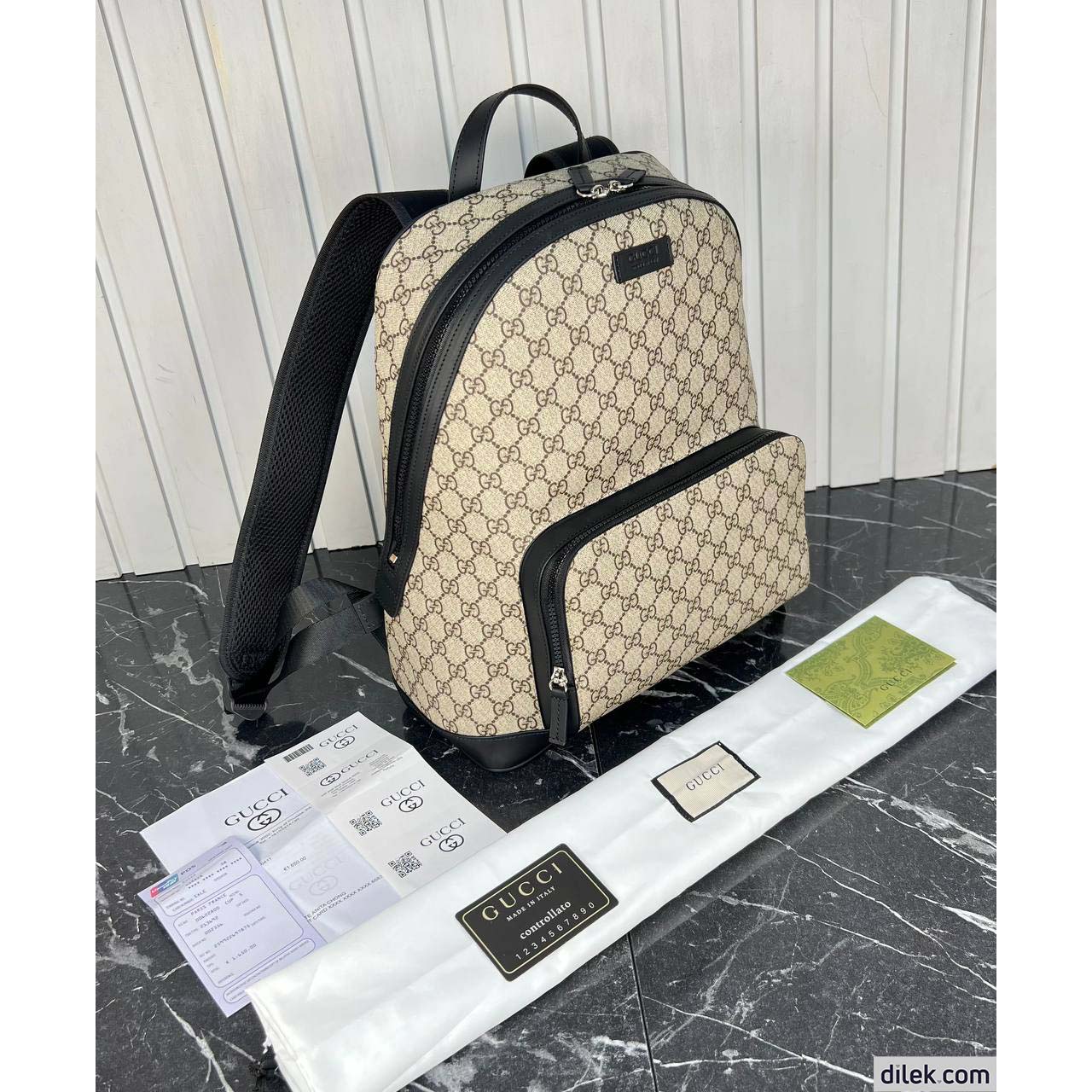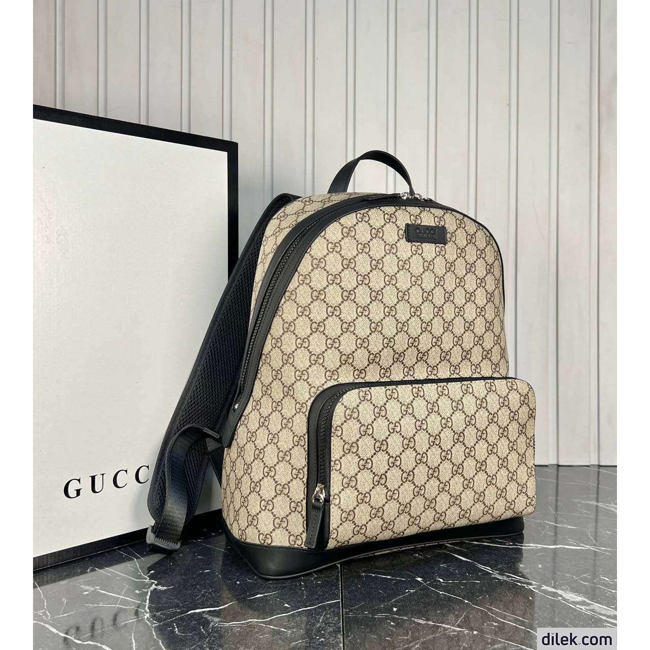 Gucci GG Supreme Monogram Medium Backpack. This stylish backpack is crafted of Gucci GG monogram coated canvas. The bag features an external pocket, adjustable nylon shoulder straps, and black leather trim with silver hardware. The top zipper opens to a spacious suede interior with patch pockets.