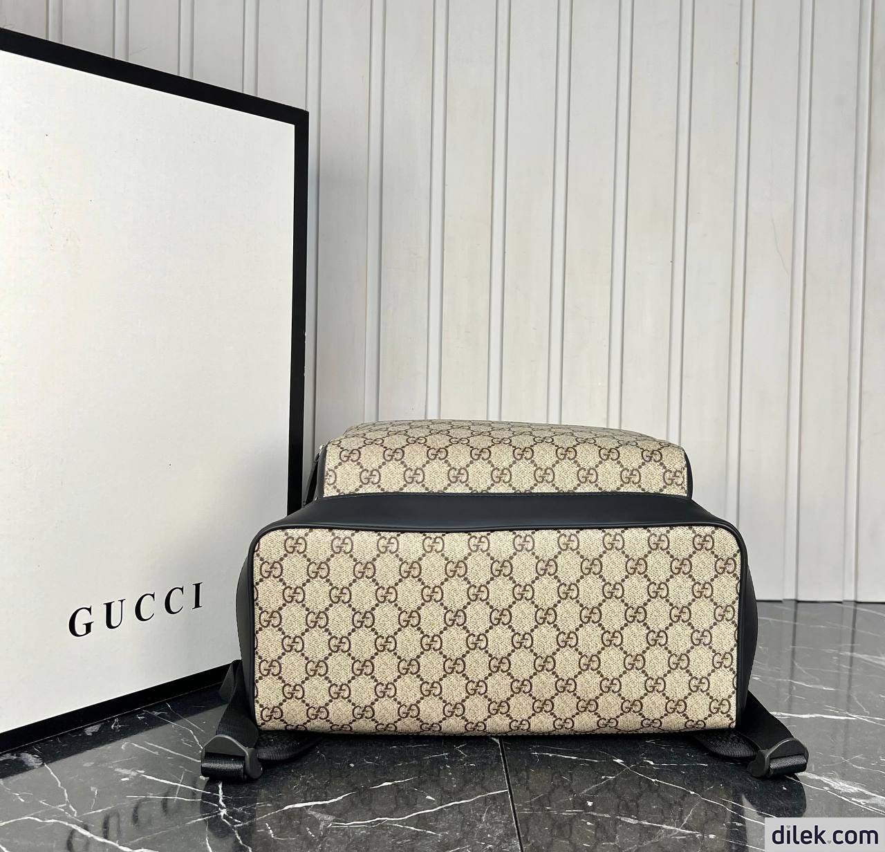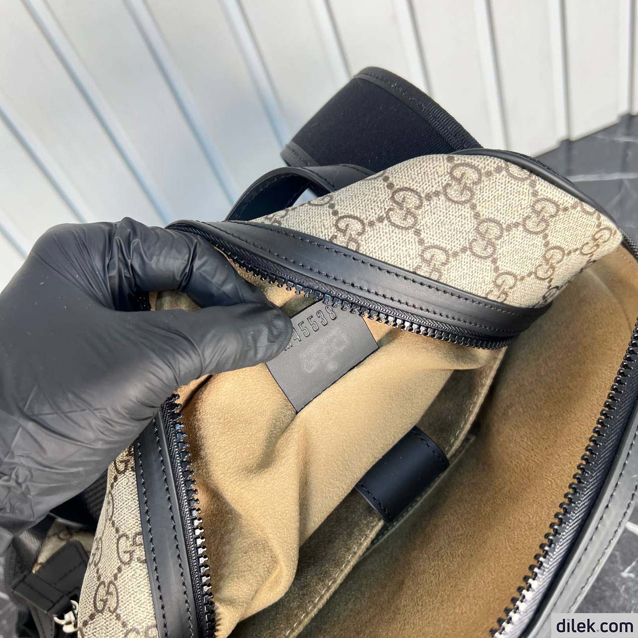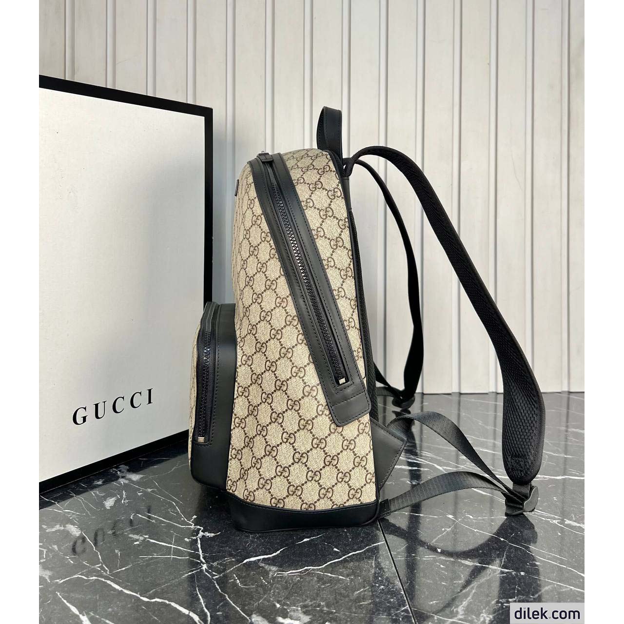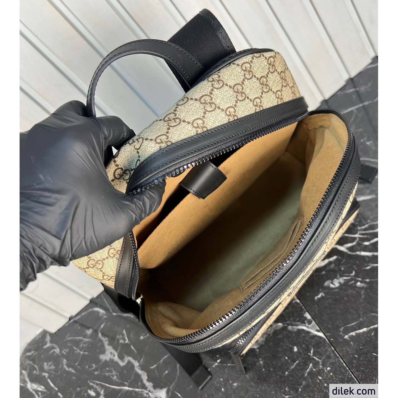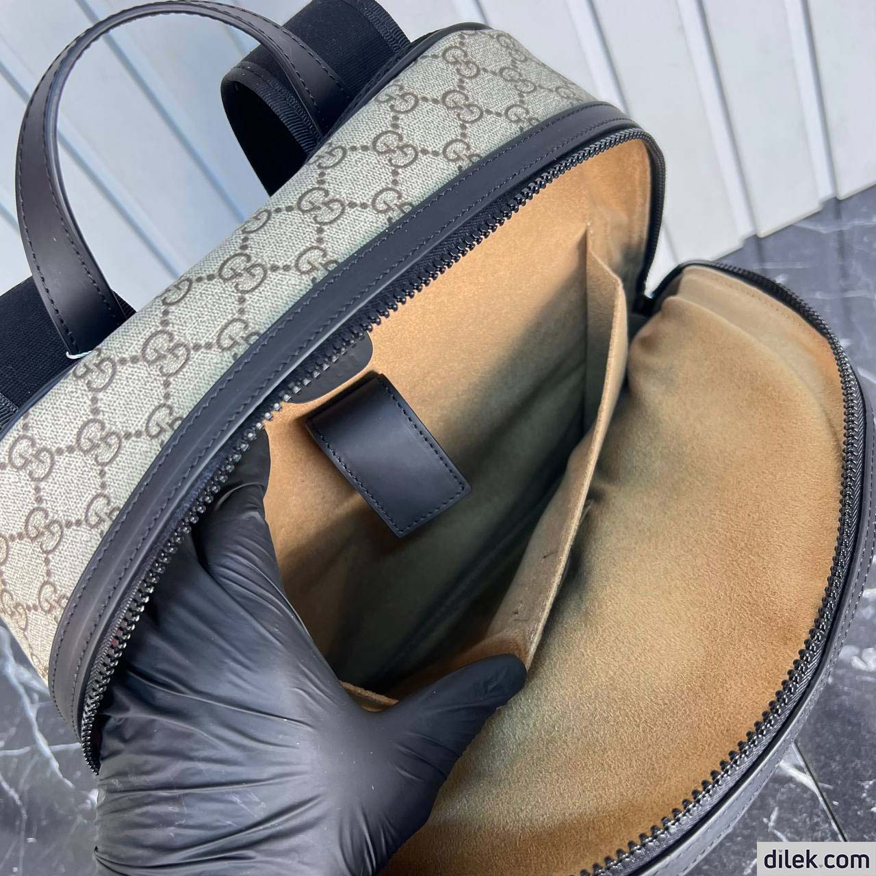 Gucci GG Supreme Monogram Medium Backpack. This stylish backpack is crafted of Gucci GG monogram coated canvas. The bag features an external pocket, adjustable nylon shoulder straps, and black leather trim with silver hardware. The top zipper opens to a spacious suede interior with patch pockets.