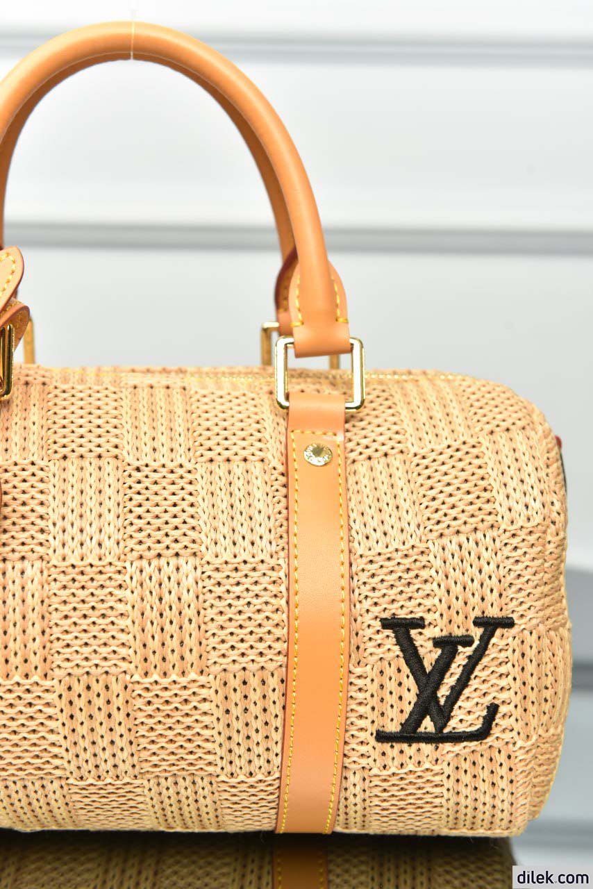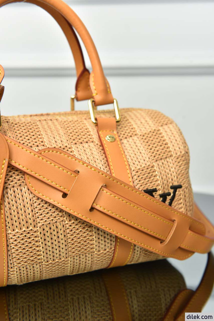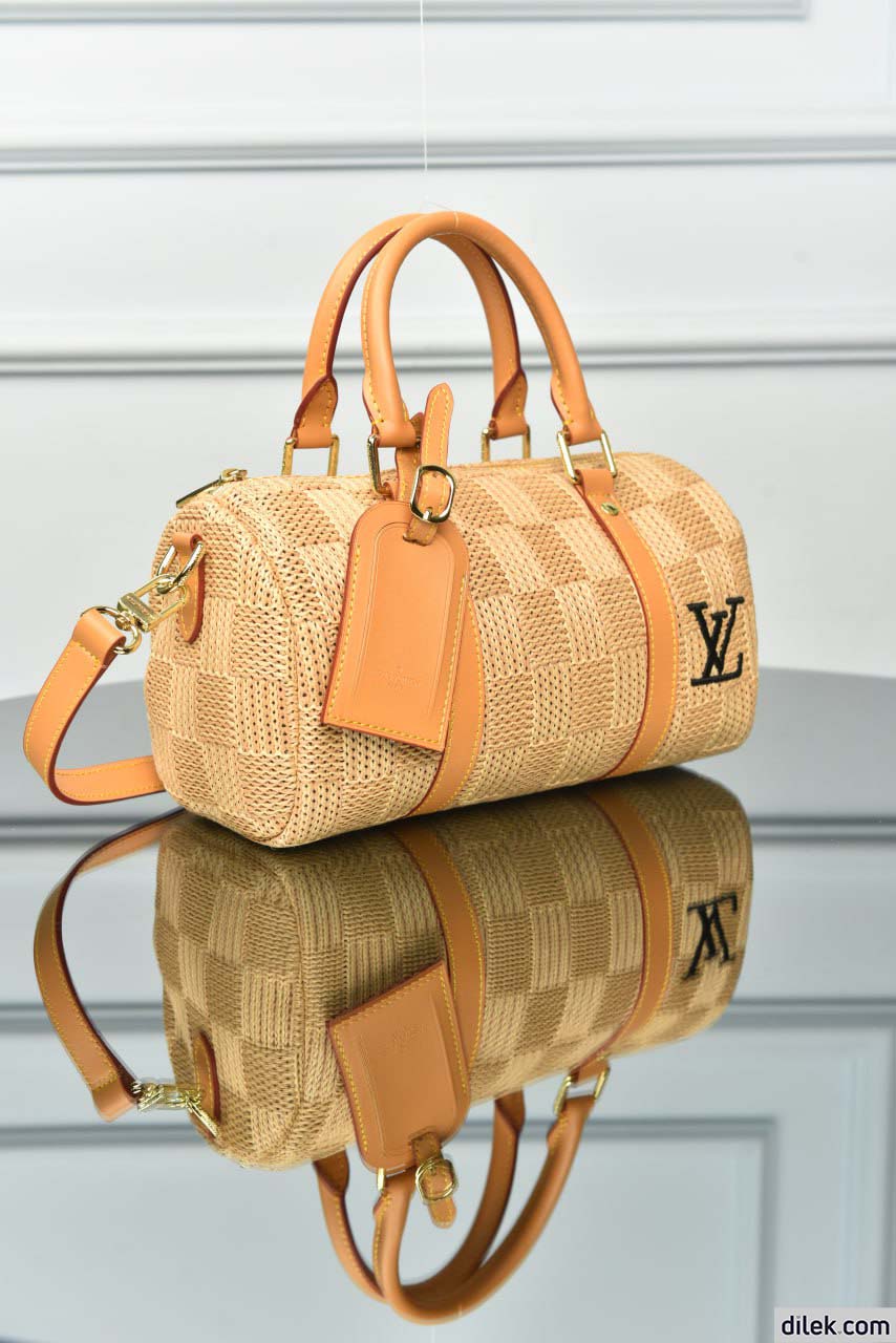 Showcasing the House’s superior craftsmanship, this Keepall Bandoulière 25 is hand-made from natural palm fibers; the shell of the bag taking about 40 hours to create. The woven Damier pattern is paired with natural leather trim, evoking the House's heritage design codes. It’s signed with hand-crafted black-raffia LV Initials.