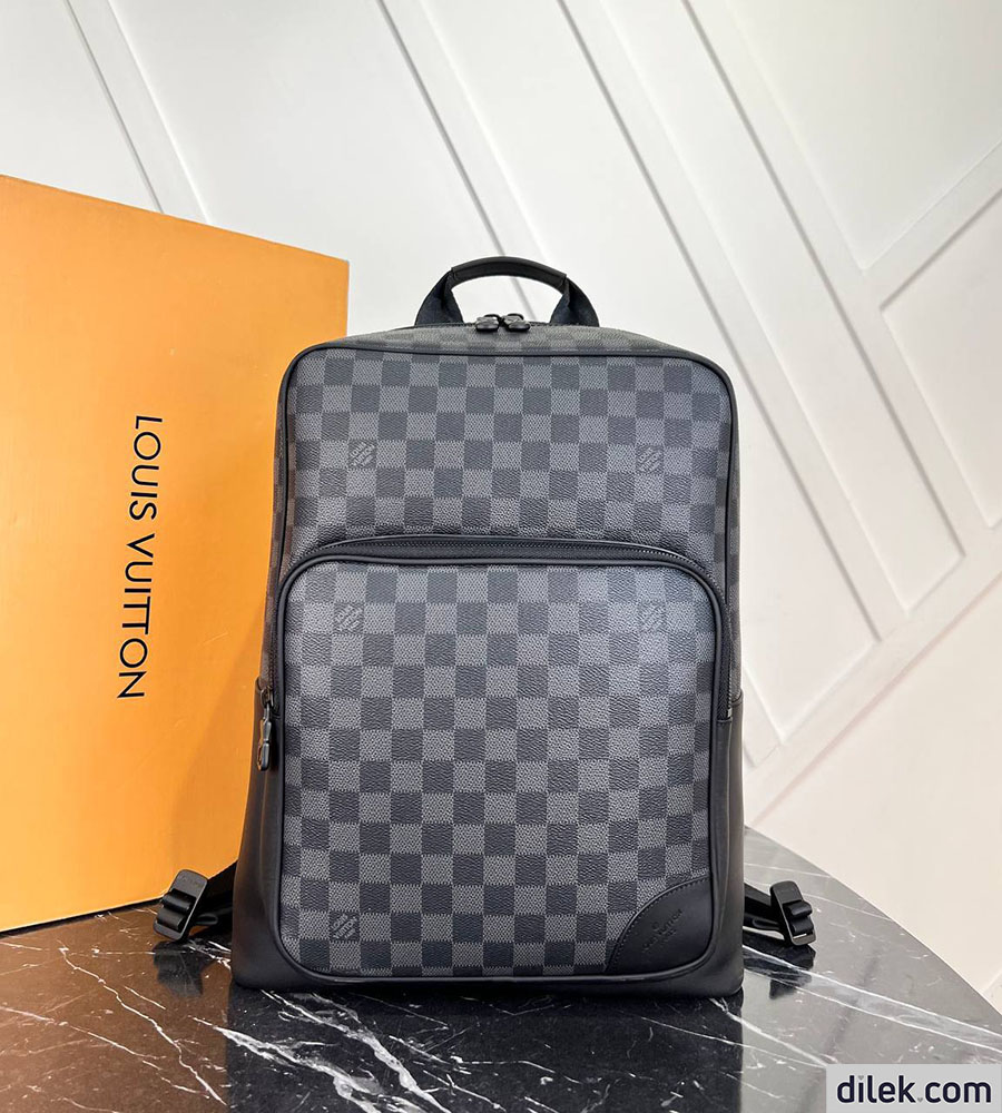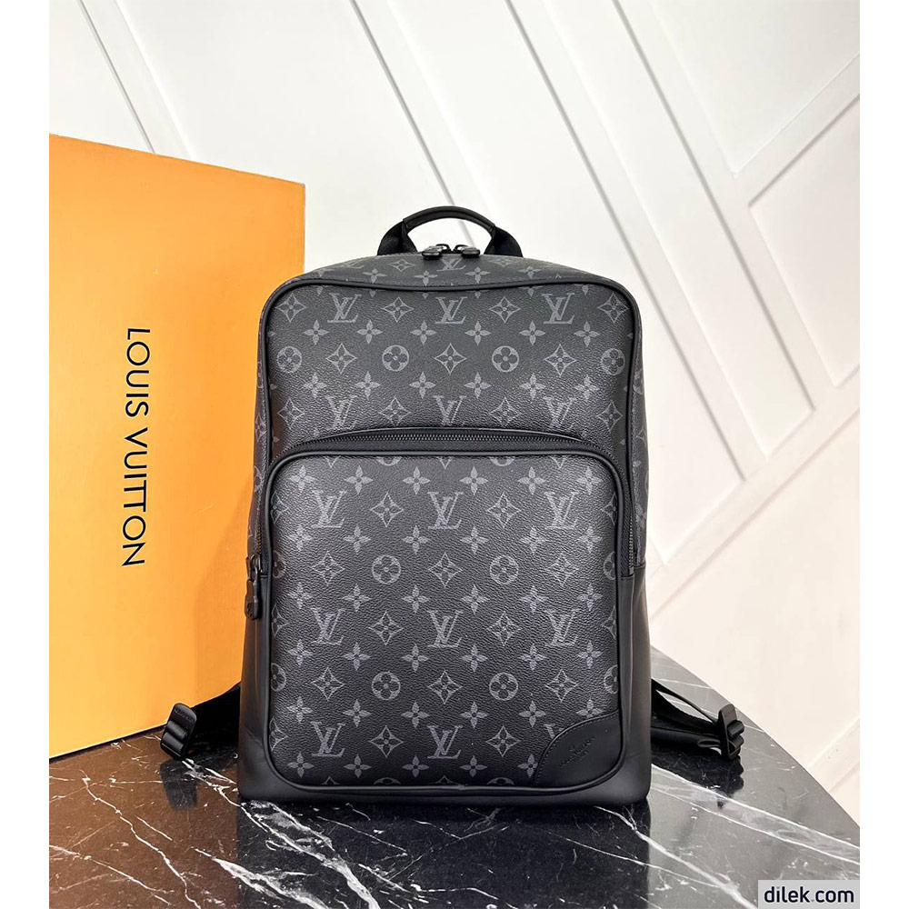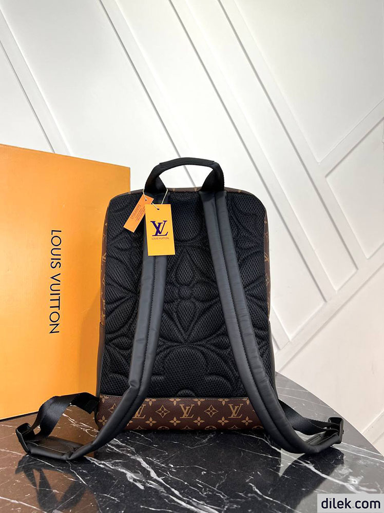 This stylish backpack is crafted of Louis Vuitton signature monogram coated canvas and features smooth black leather trim, a front zipper compartment, and adjustable black leather shoulder straps. The black wrap-around zippers open to a black fabric interior with patch pockets.