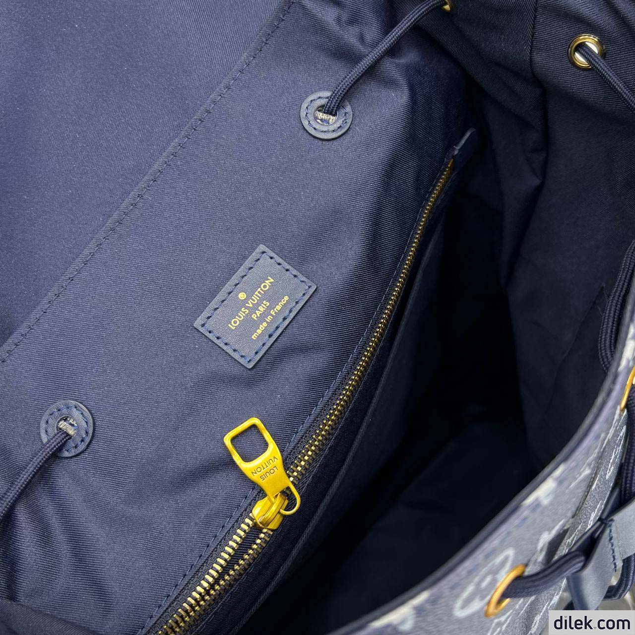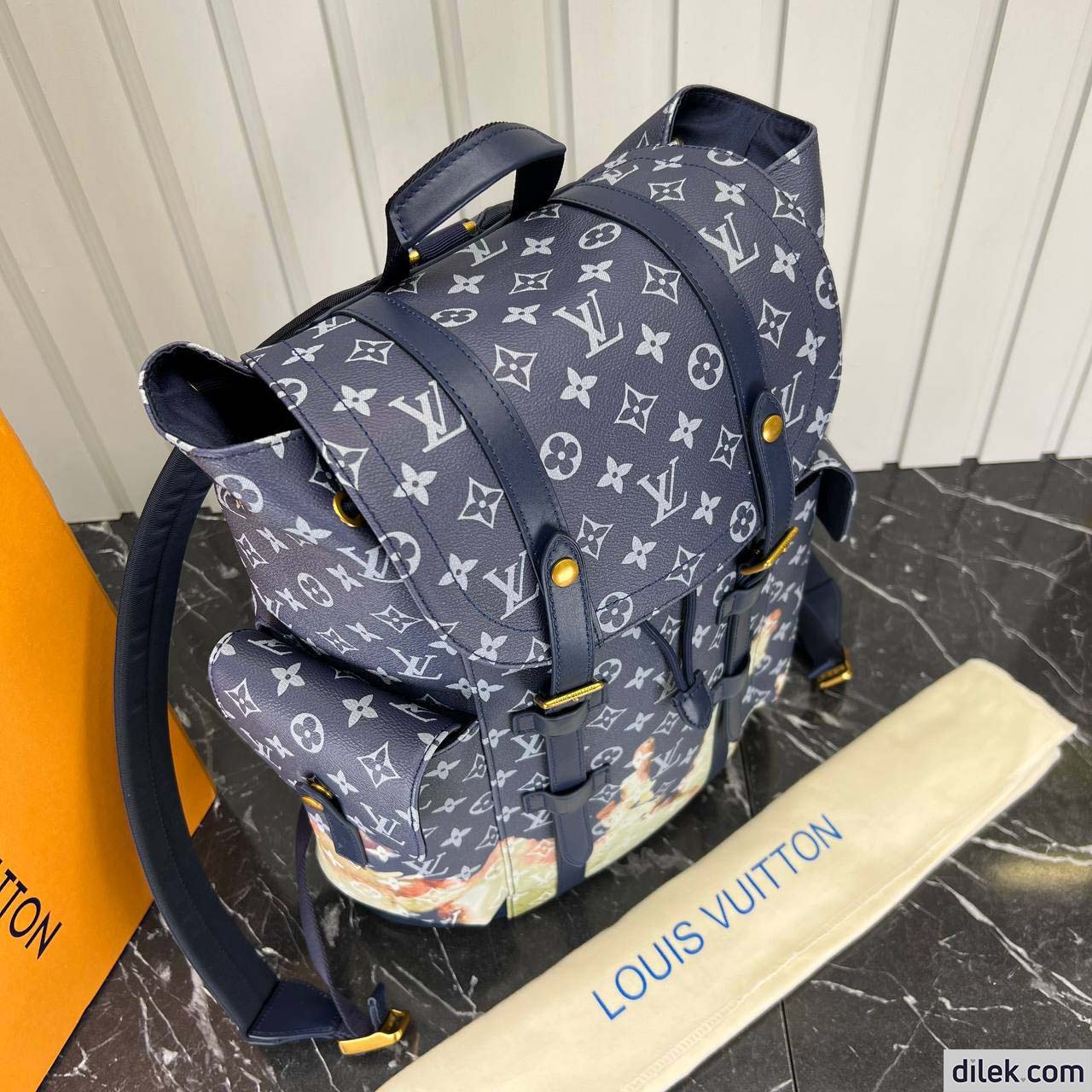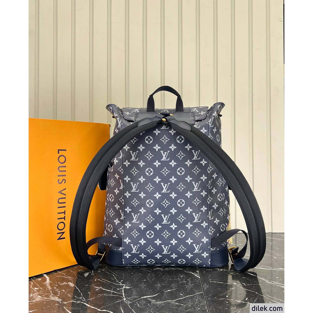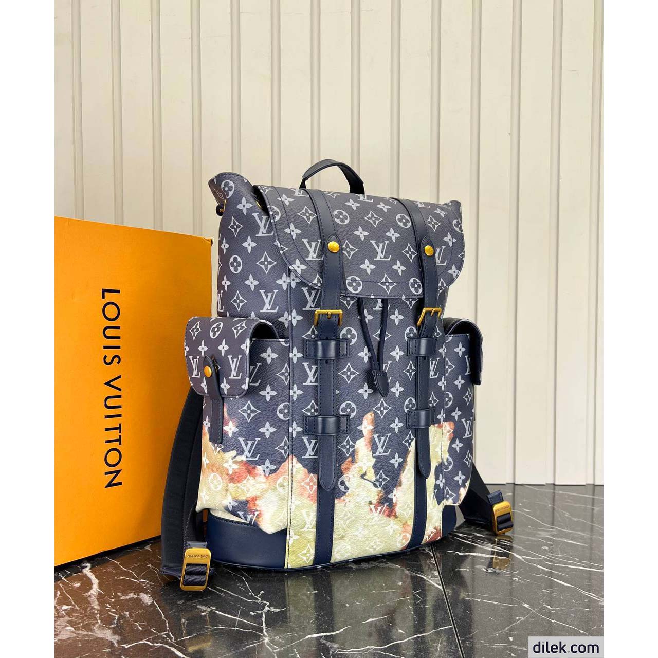 For Spring-Summer 2024, the Christopher backpack takes on a new look inspired by the edgy modernity of bleached denim. Deep blue Monogram canvas is combined with lighter shades in a pattern that evokes the contours of paper burned in a campfire. Both stylish and functional, it features an array of compartments including a special iPad pocket.