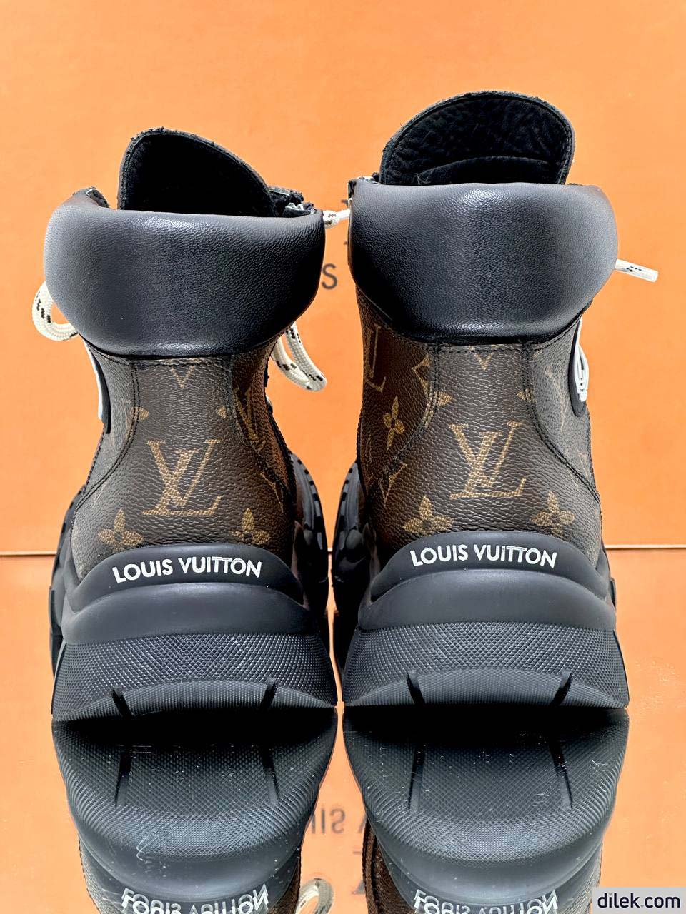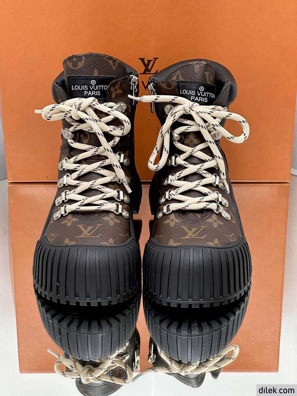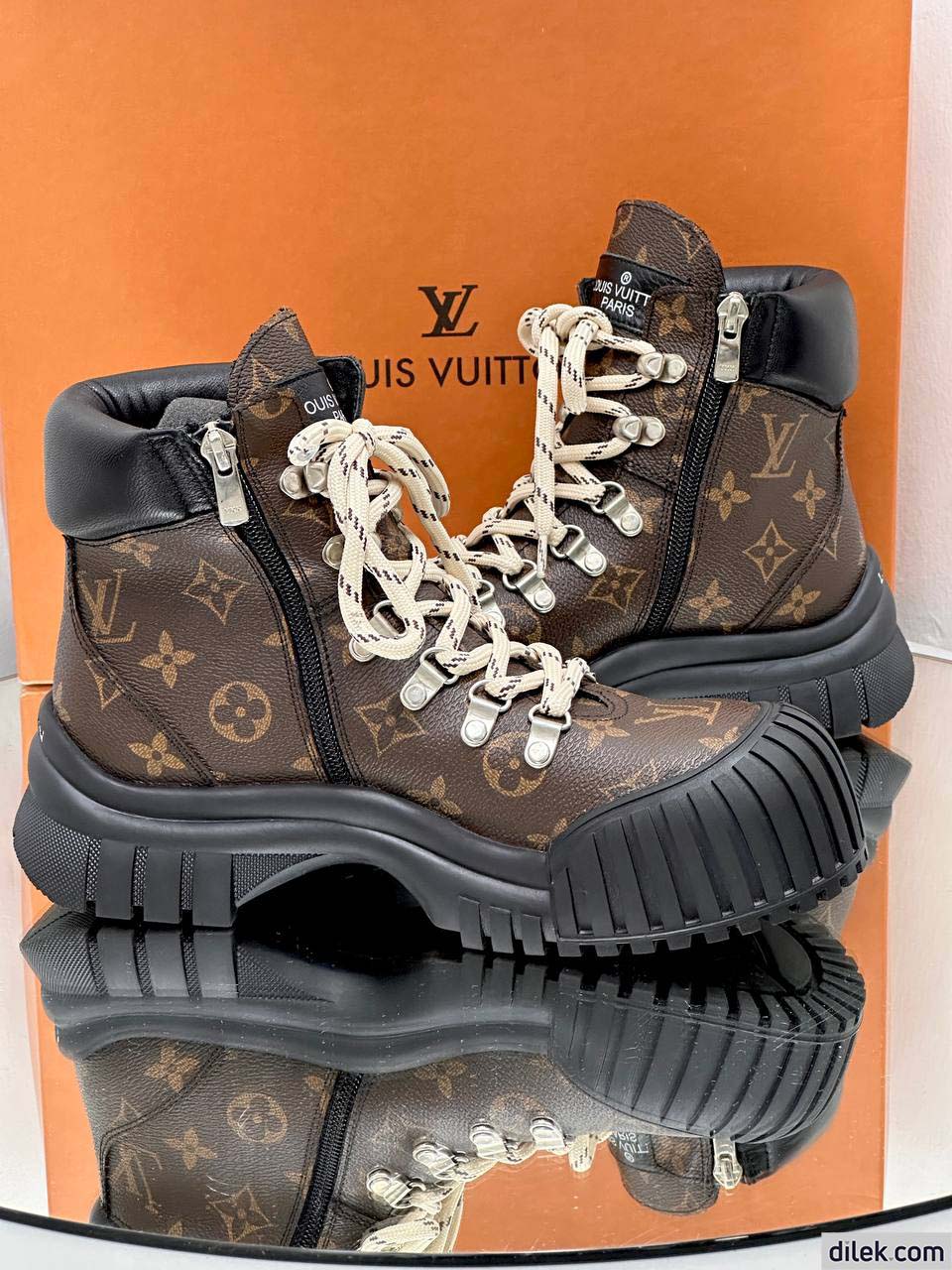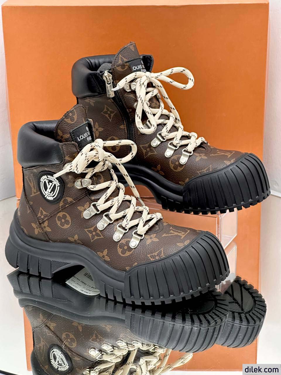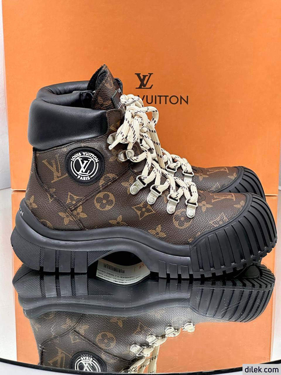 The Ruby flat ranger combines Louis Vuitton's iconic Monogram canvas with a tongue and collar in smooth calf leather. This versatile ankle boot balances masculine and feminine codes for a fashion-forward look. It is finished with technical, bicolor laces and a chunky yet lightweight rubber outsole, which adds extra height.