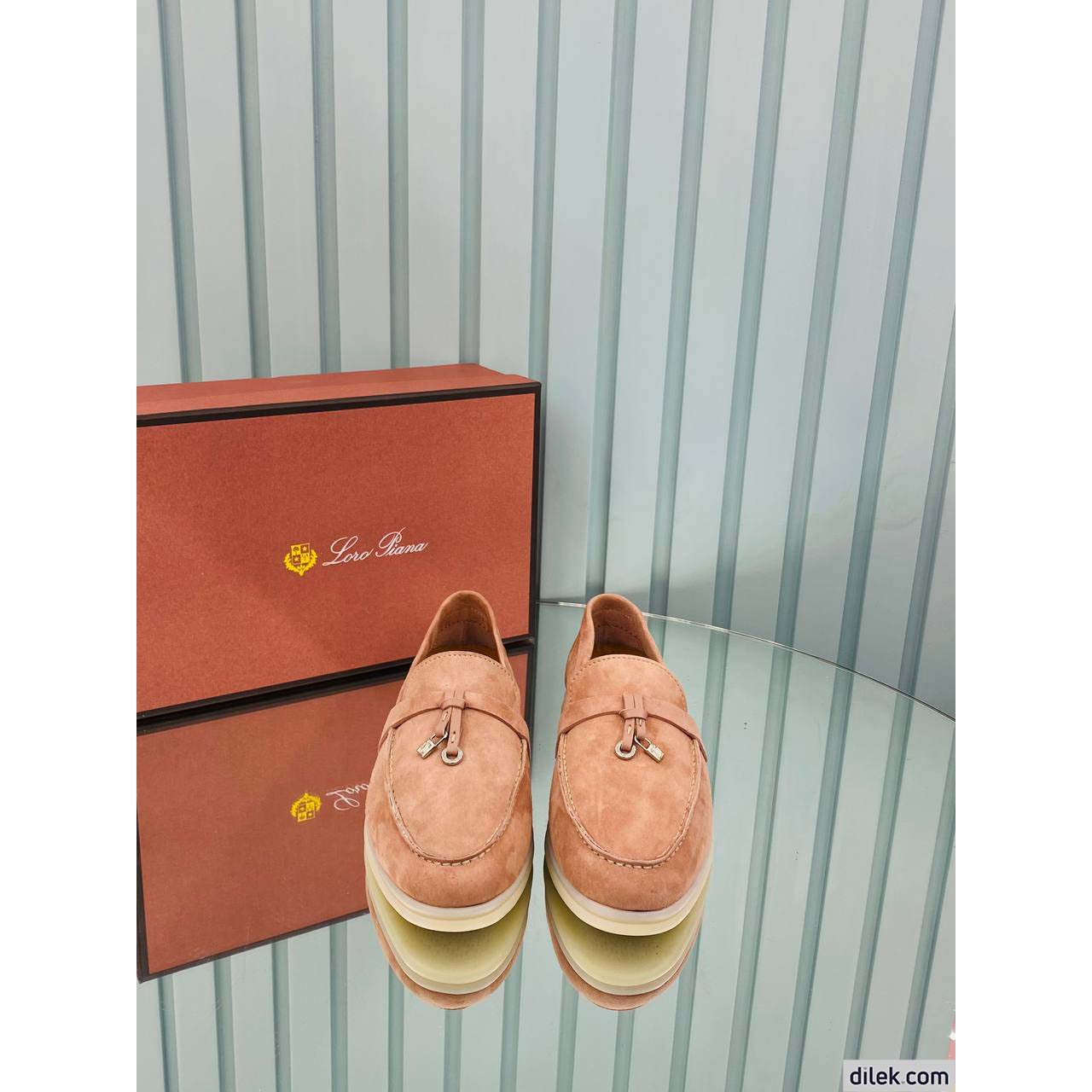 Iconic suede loafers with a light water-repellent, stain-resistant treatment. They feature soft Napa-leather piping and suede saddles with Loro Piana My Charms.
