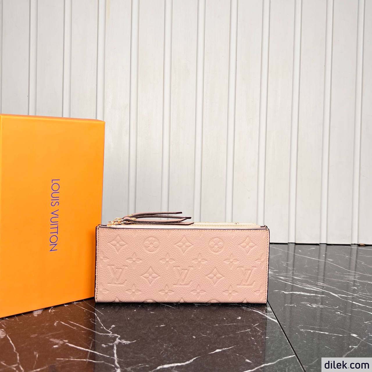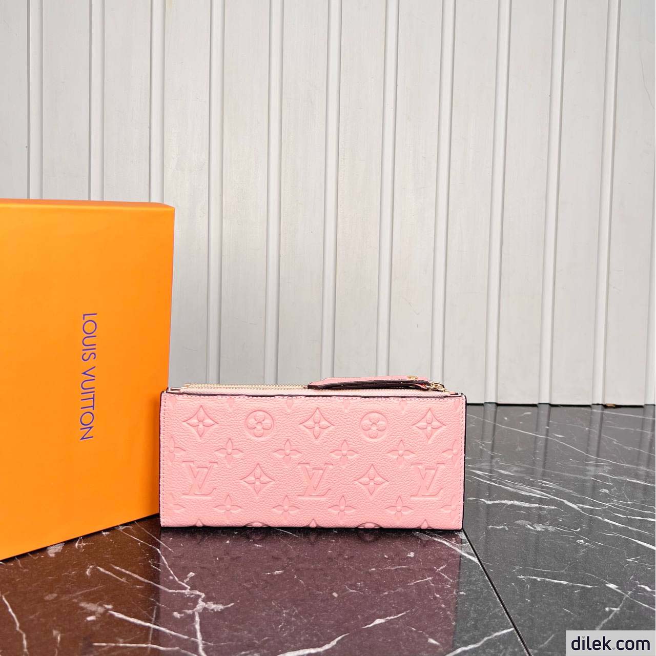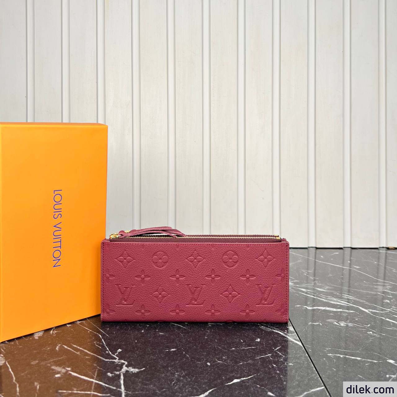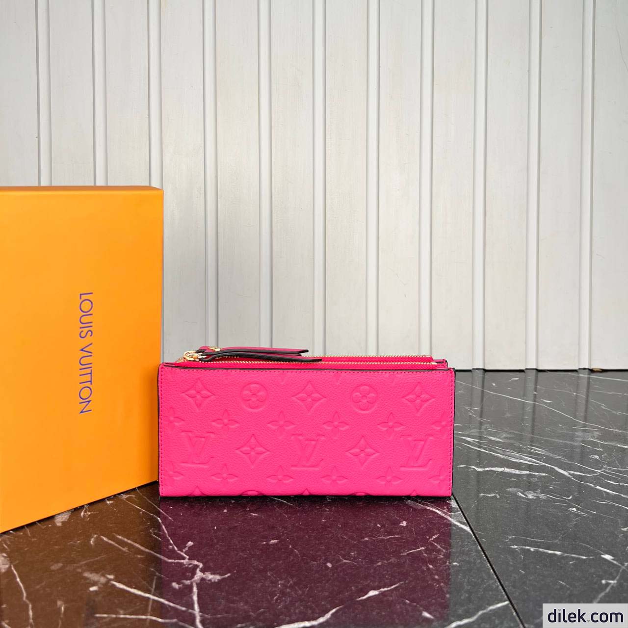 LOUIS VUITTON Monogram Adele Wallet in Fuchsia. This chic wallet is crafted of traditional Louis Vuitton monogram on toile canvas. It features a slim design, with dual zipper compartments. The wallet snaps open to a dark fuchsia cross-grain leather interior with card slots and patch pockets.