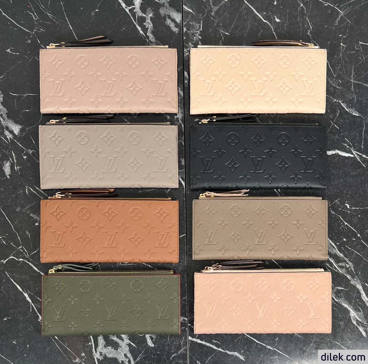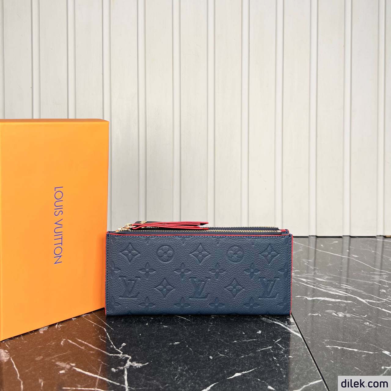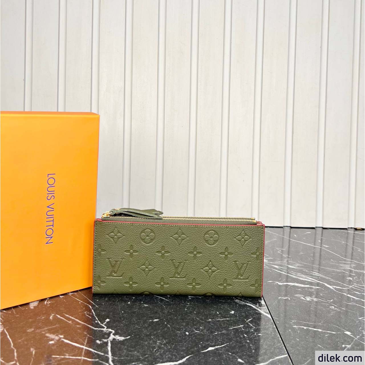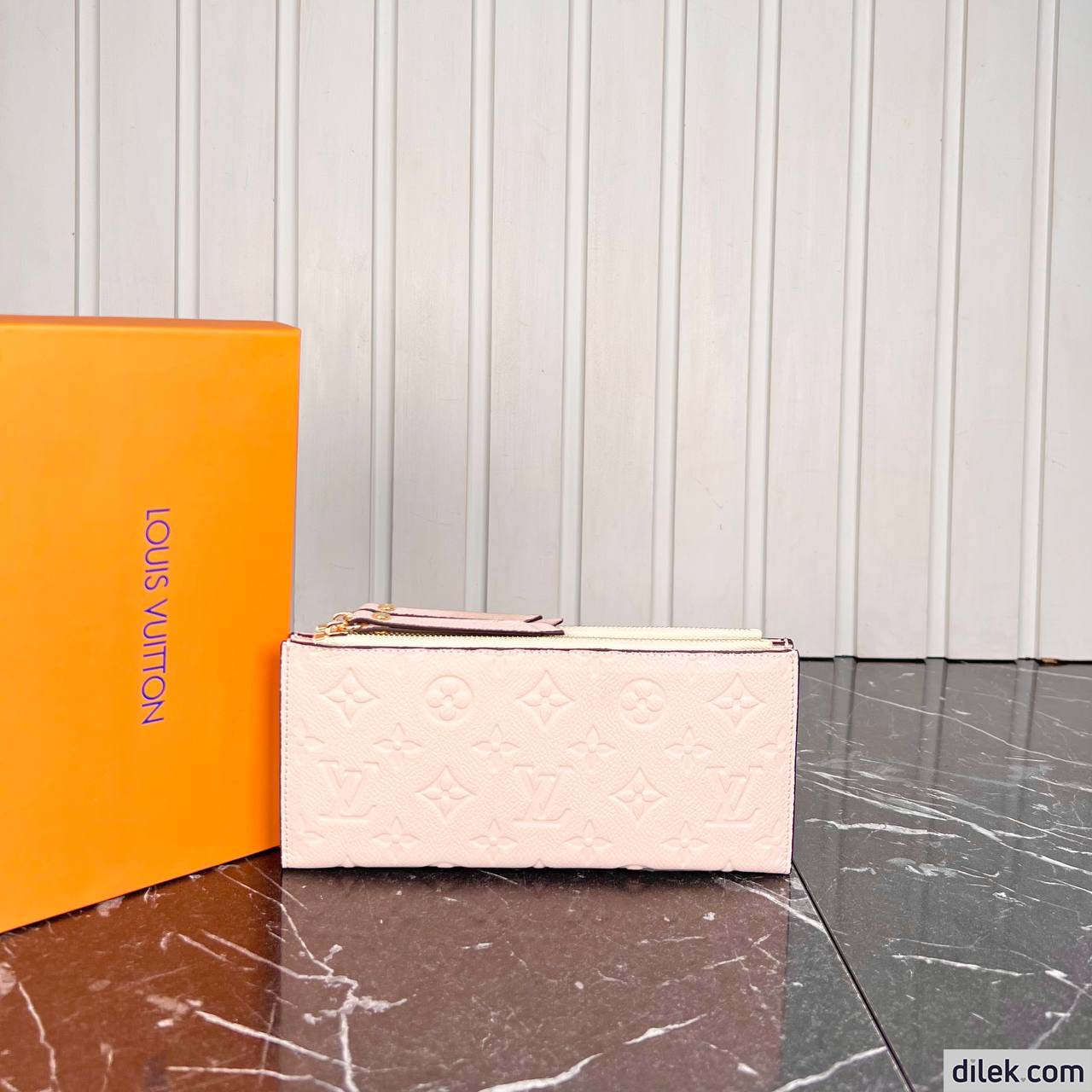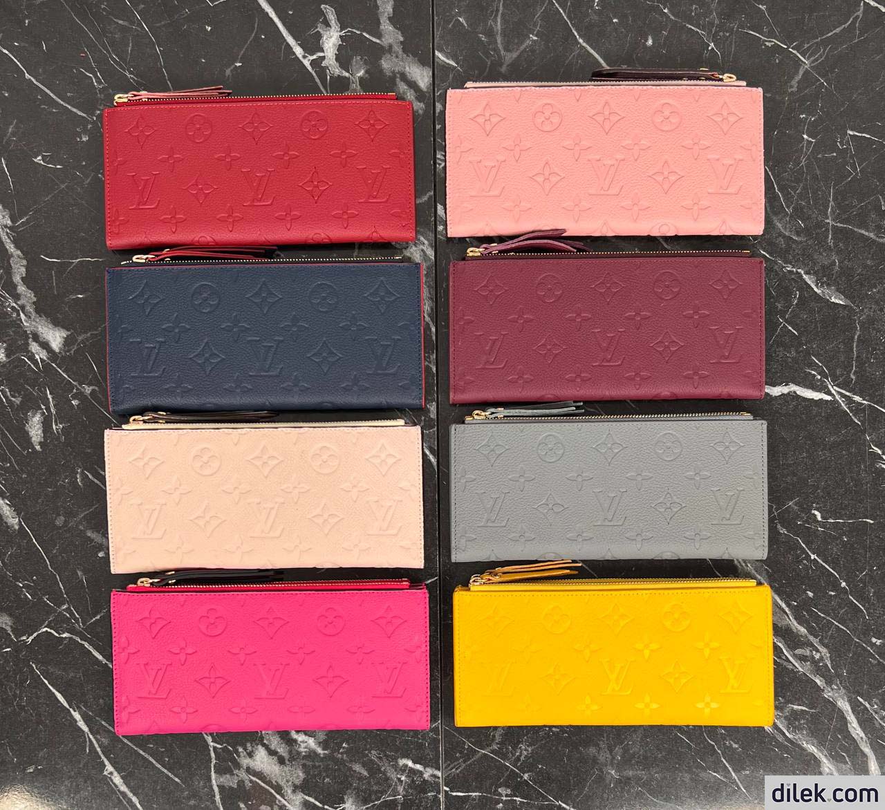 LOUIS VUITTON Monogram Adele Wallet in Fuchsia. This chic wallet is crafted of traditional Louis Vuitton monogram on toile canvas. It features a slim design, with dual zipper compartments. The wallet snaps open to a dark fuchsia cross-grain leather interior with card slots and patch pockets.