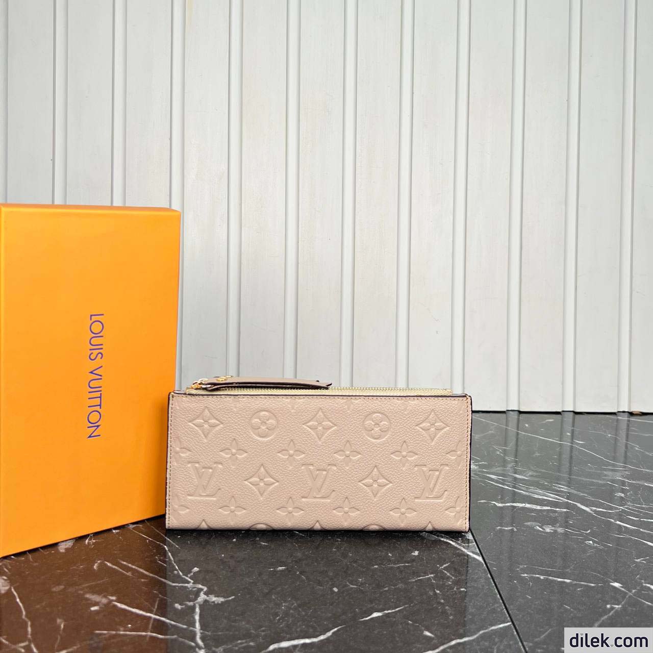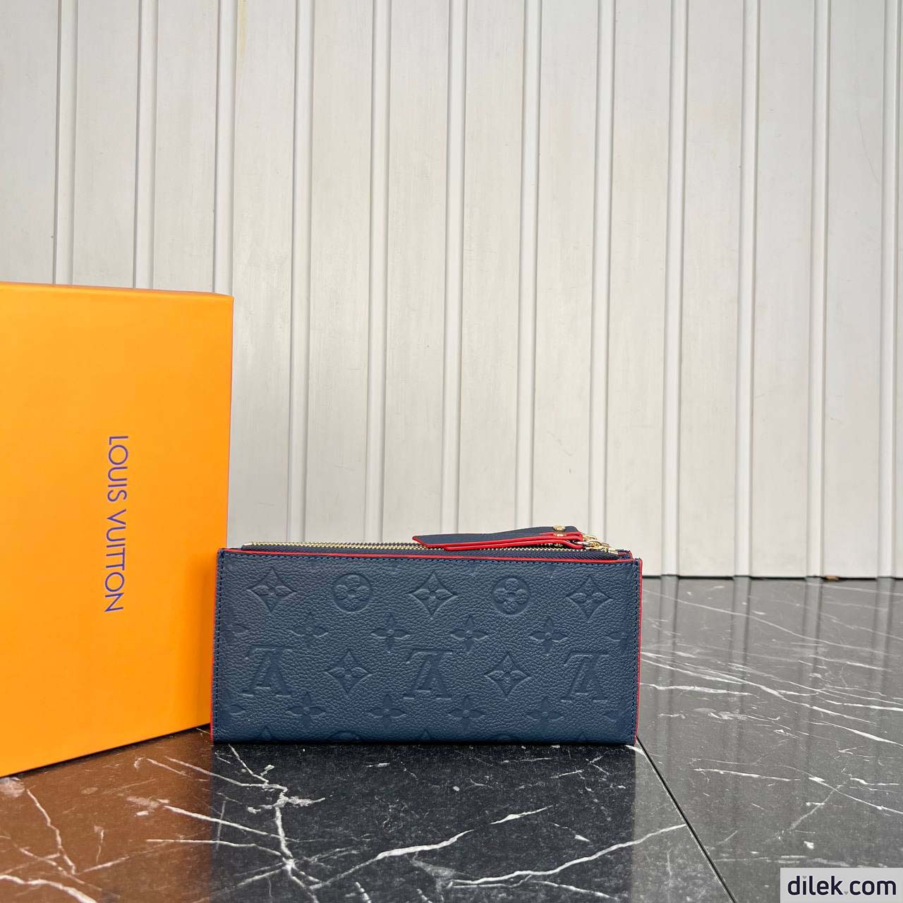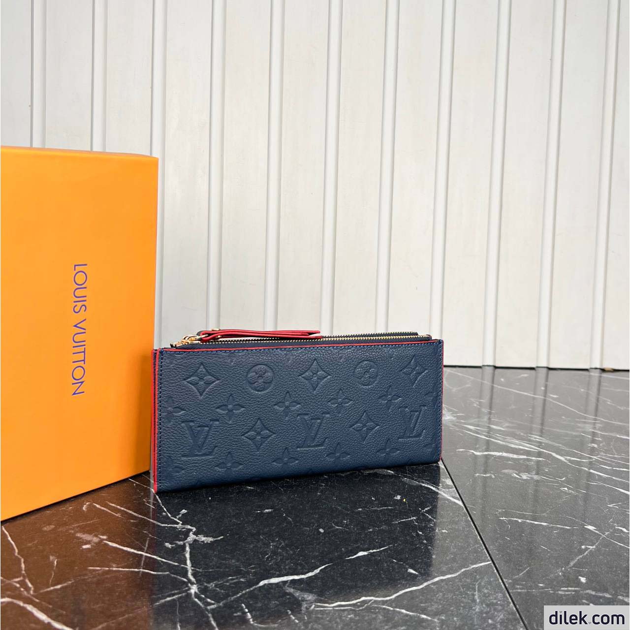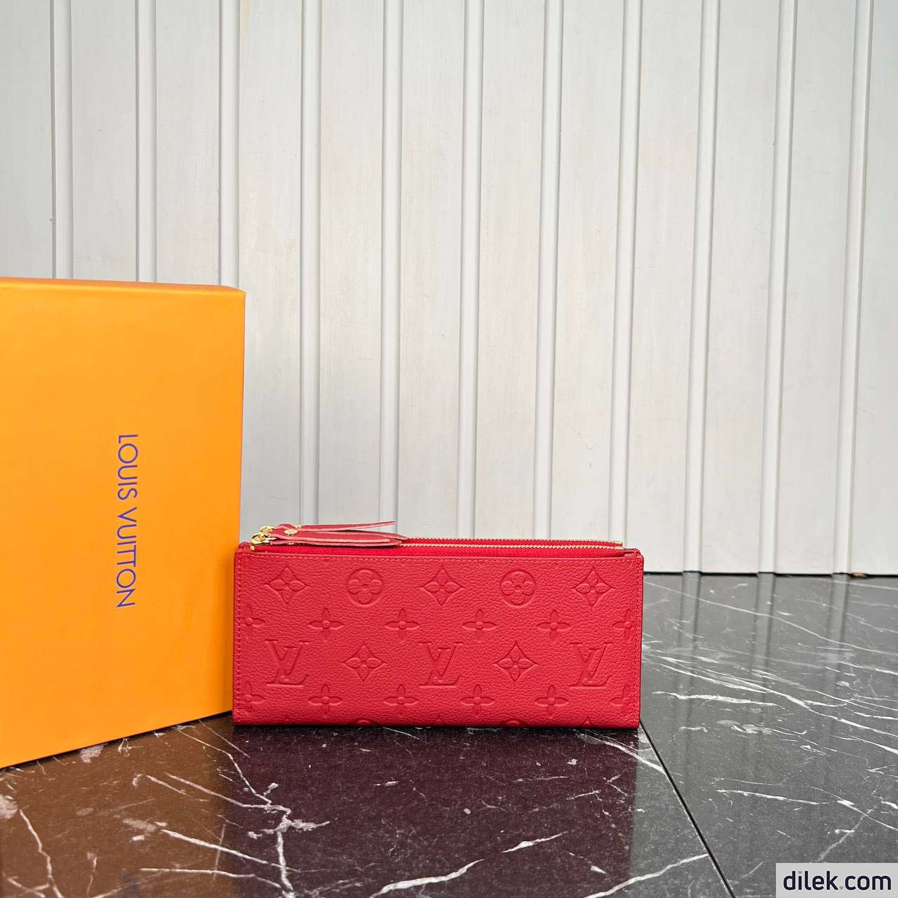 LOUIS VUITTON Monogram Adele Wallet in Fuchsia. This chic wallet is crafted of traditional Louis Vuitton monogram on toile canvas. It features a slim design, with dual zipper compartments. The wallet snaps open to a dark fuchsia cross-grain leather interior with card slots and patch pockets.