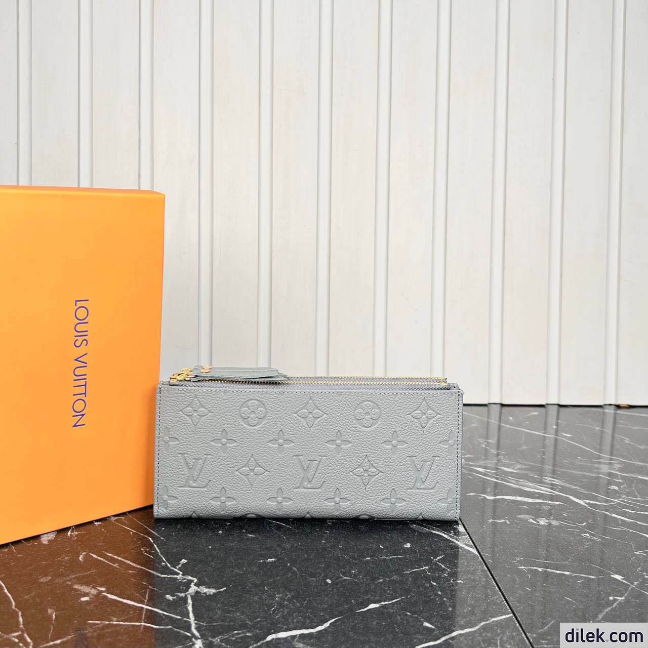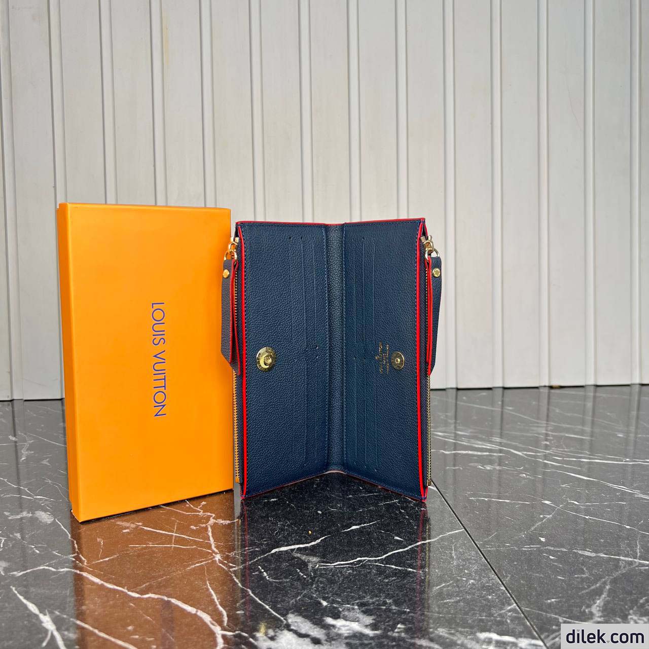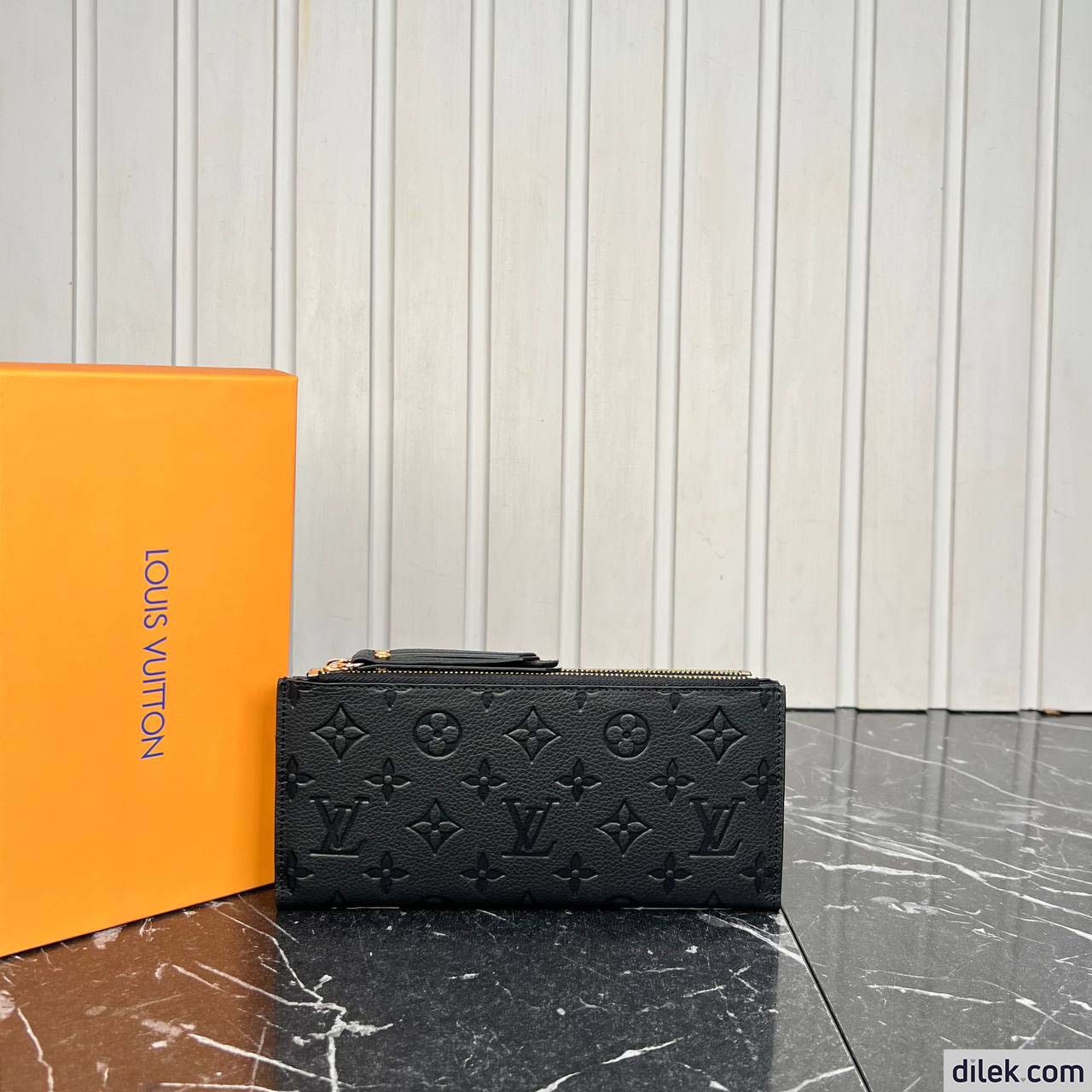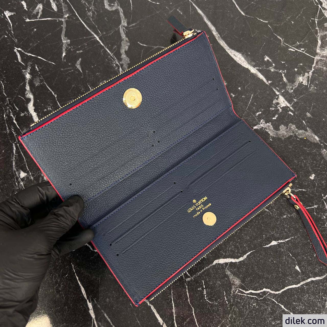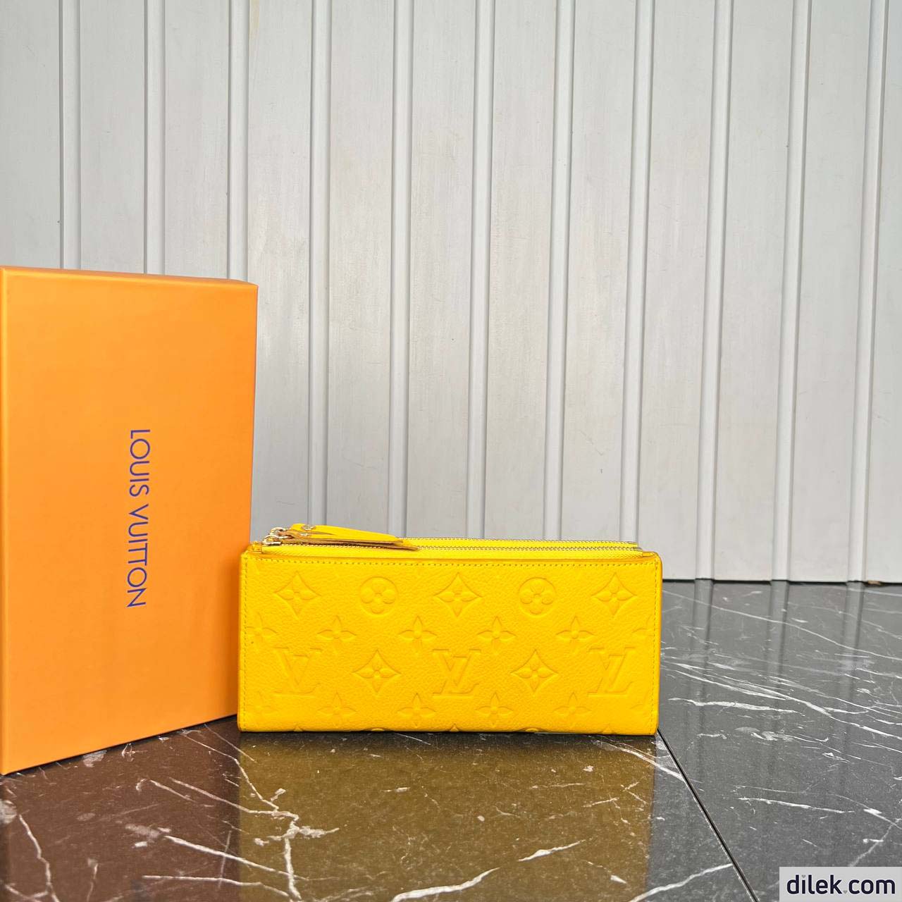 LOUIS VUITTON Monogram Adele Wallet in Fuchsia. This chic wallet is crafted of traditional Louis Vuitton monogram on toile canvas. It features a slim design, with dual zipper compartments. The wallet snaps open to a dark fuchsia cross-grain leather interior with card slots and patch pockets.