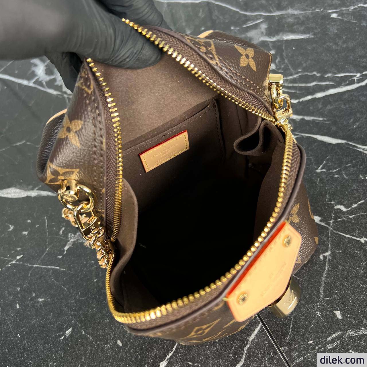 The Maison salutes its travel heritage with the Just In Case handbag. Made from Monogram canvas with natural cowhide-leather trim, this compact model keeps essentials smartphone, keys, makeup always close at hand. Detailed with a signature padlock and key bell, the bag is fitted with a leather-braided chain and a leather strap, both removable, for a variety of modern carry options.
