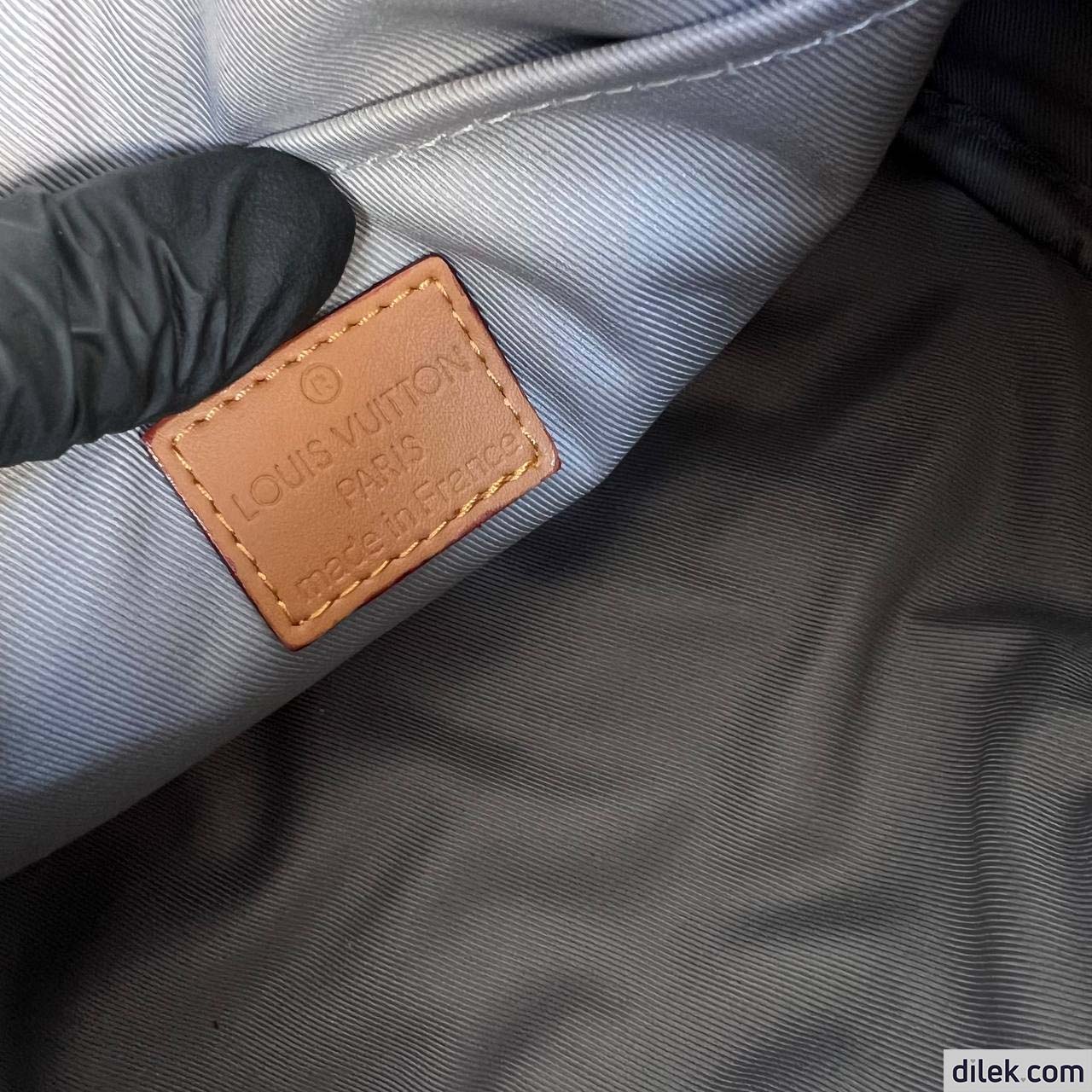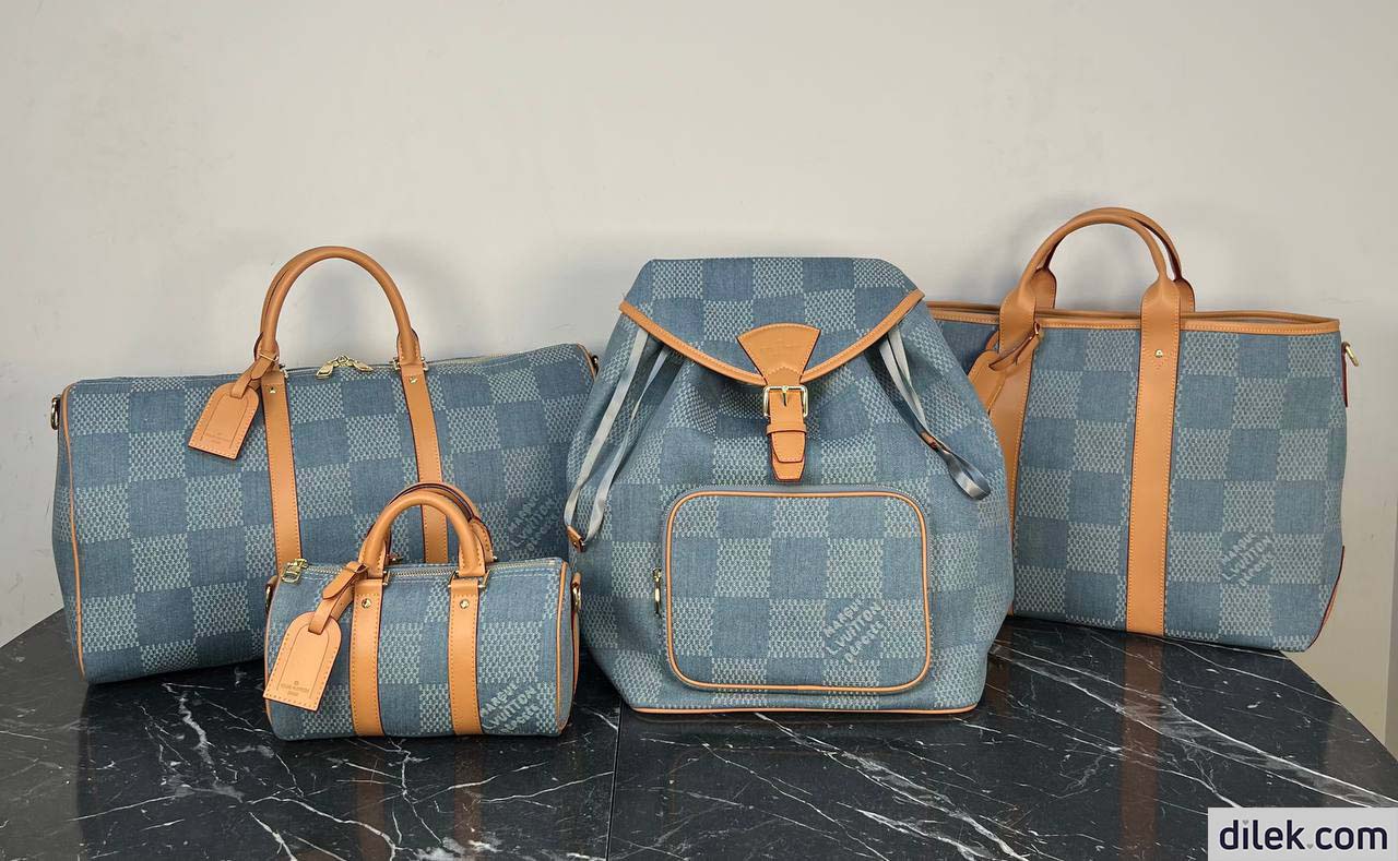 Pharrell Williams brings his Damier Denim 3D cotton canvas to the sporty Speedy 25 Bandoulière bag. To create this summery version of the House’s emblematic checked pattern, the cloth is cut, bleached, and dyed to obtain a faded aspect. An additional wash slightly shrinks the material, bringing out the subtle checkerboard in relief.