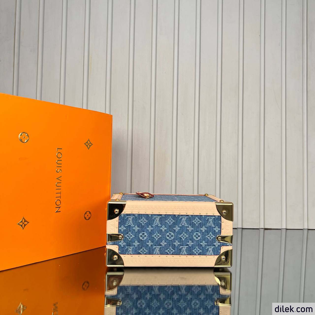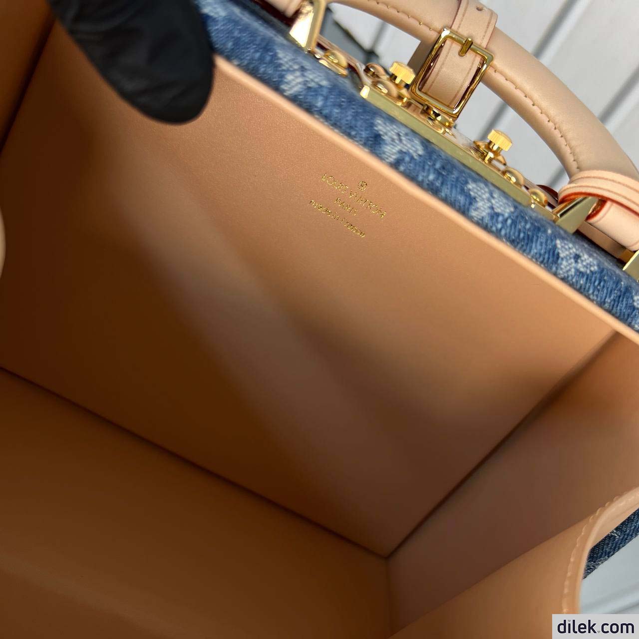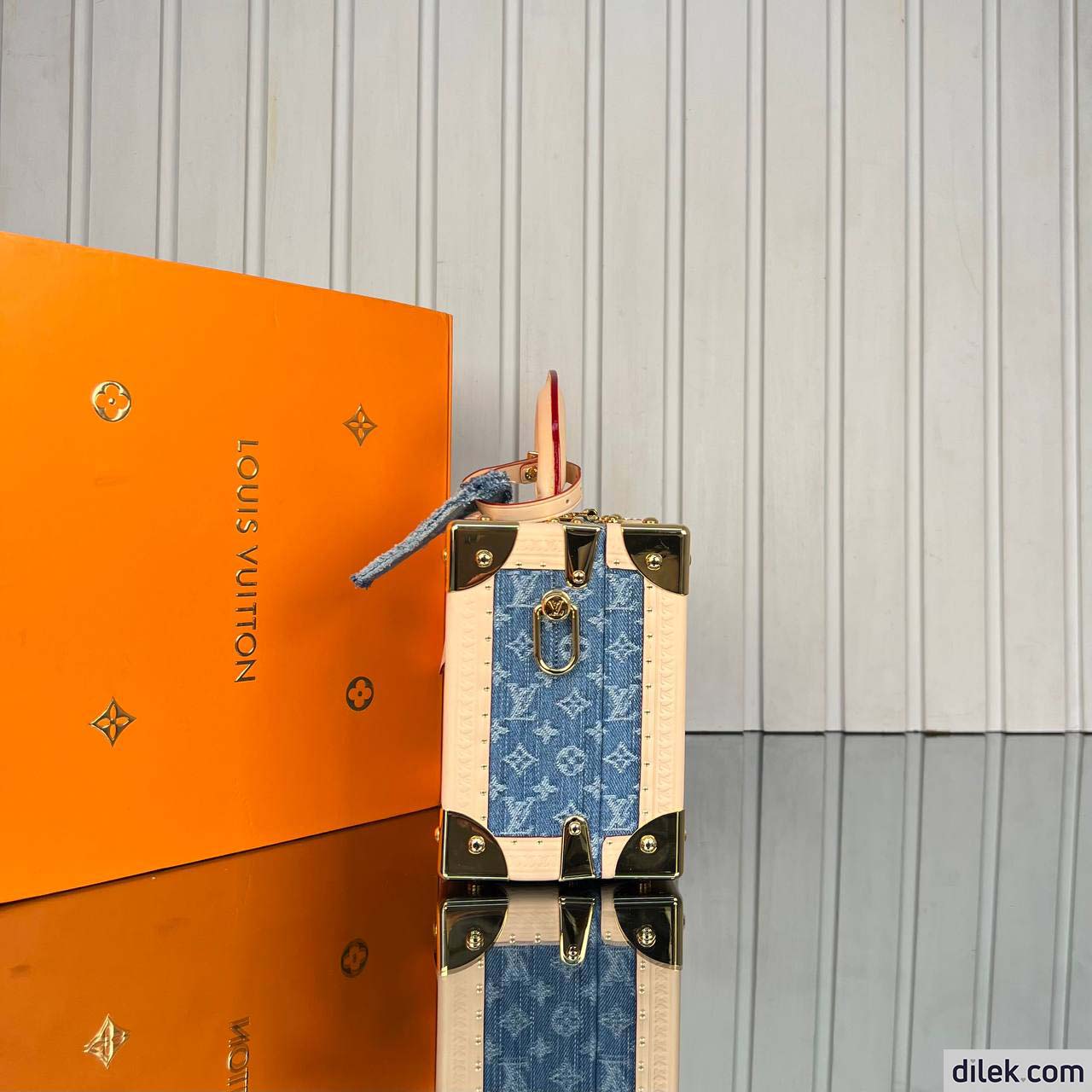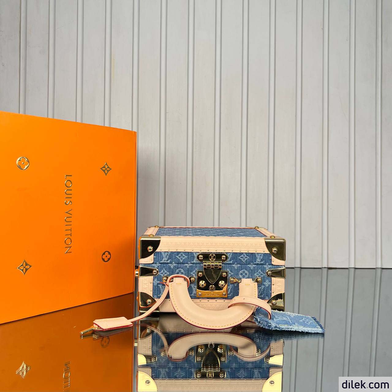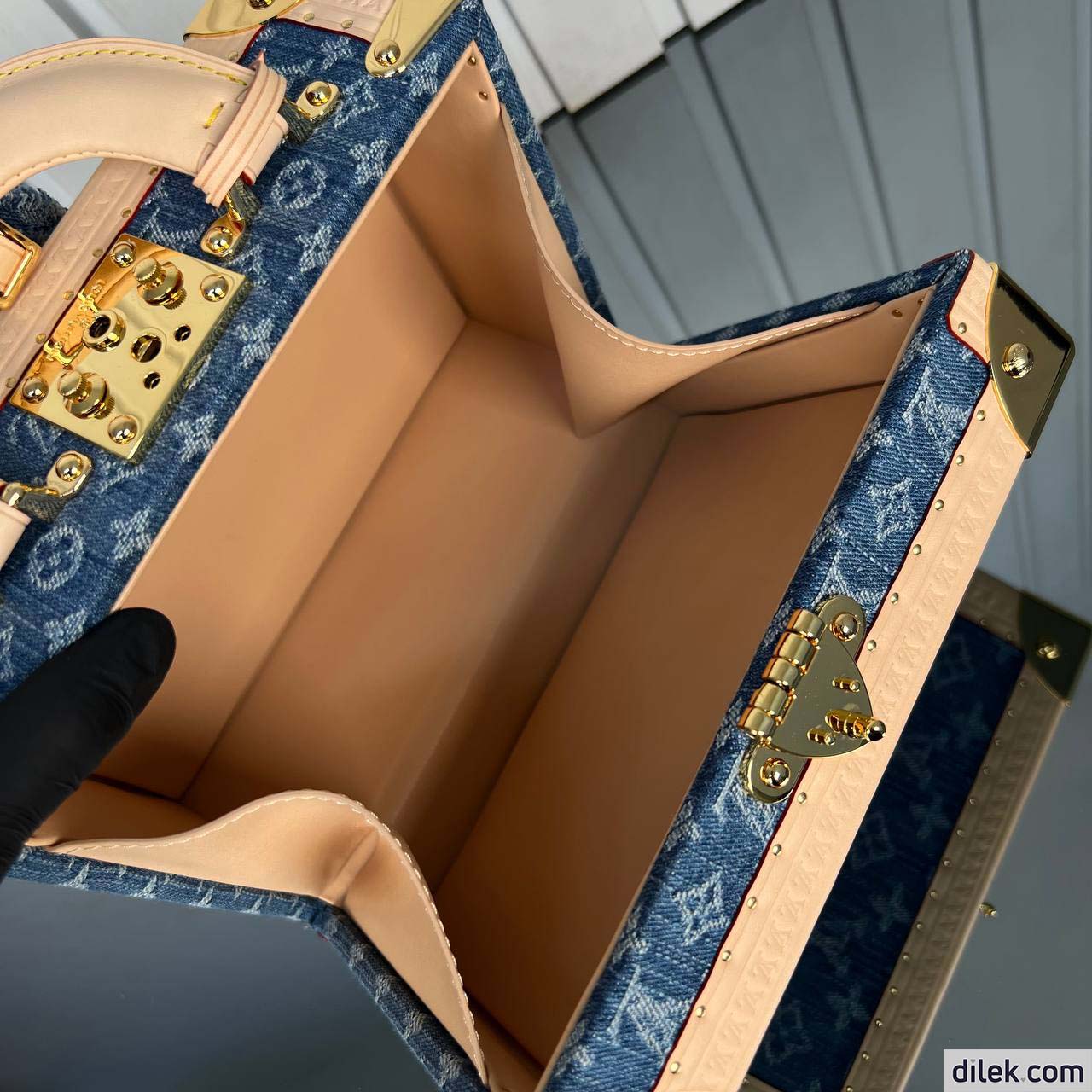The Petite Valise is offered in new Monogram Denim canvas with natural cowhide-leather on the top handle and ajustable strap. A miniaturised version of emblematic Louis Vuitton suitcases, with a top handle, the Petite Valise is the feminine Hardsided must-have.