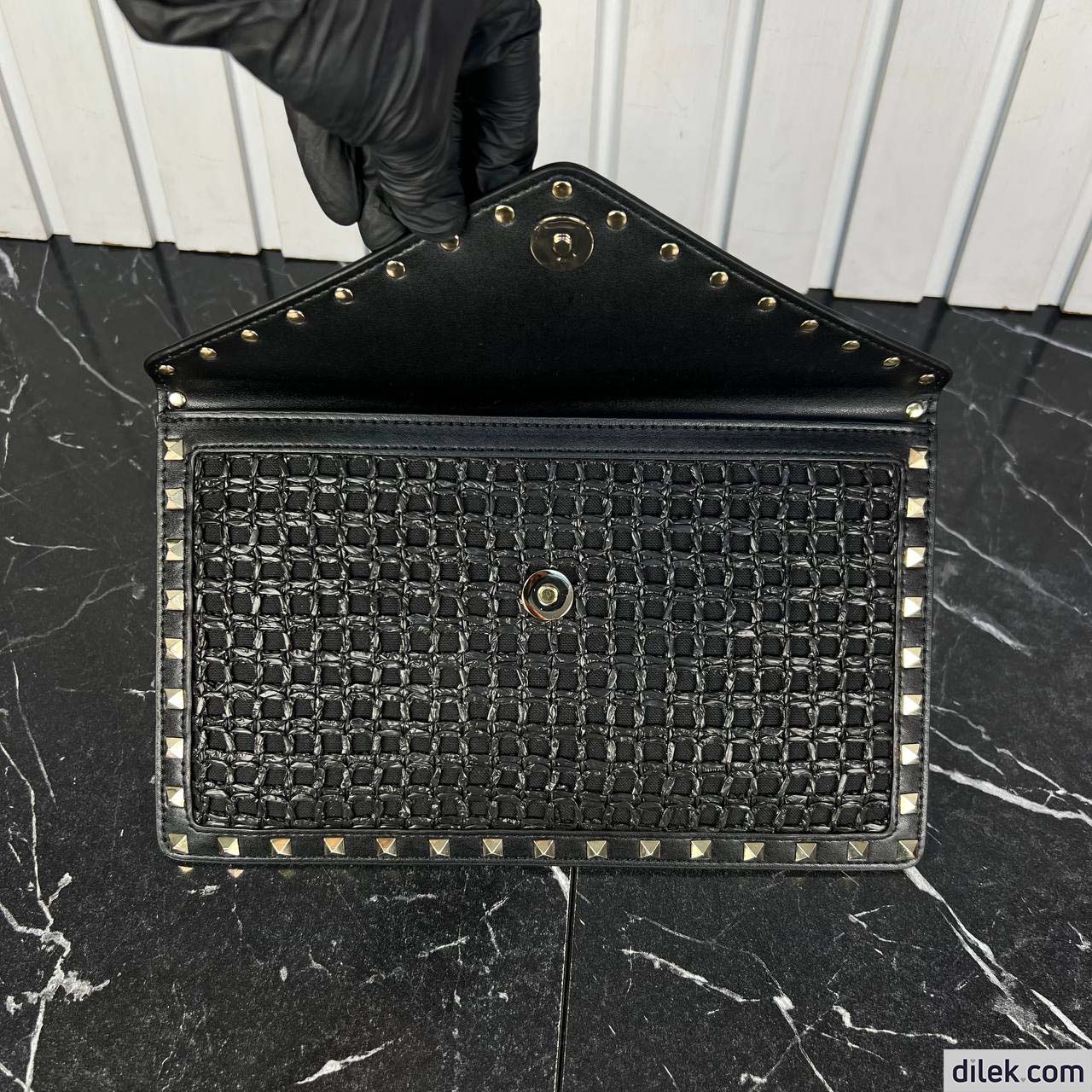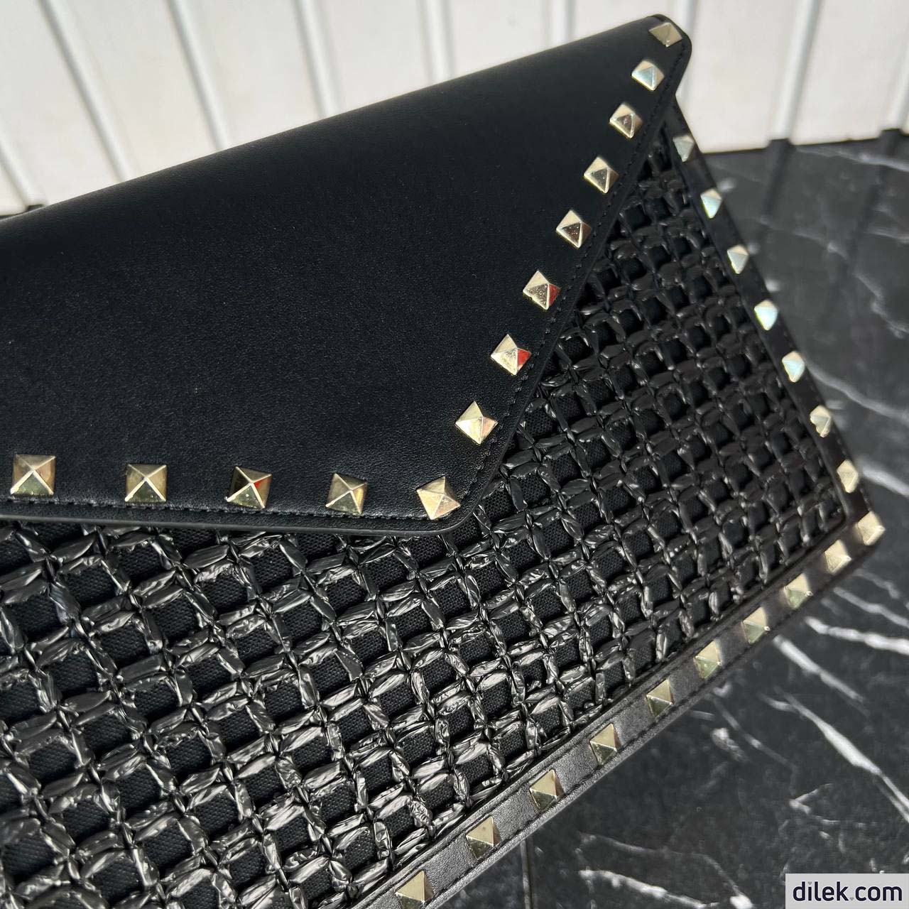 Valentino Garavani Rockstud clutch bag in synthetic raffia with leather details.