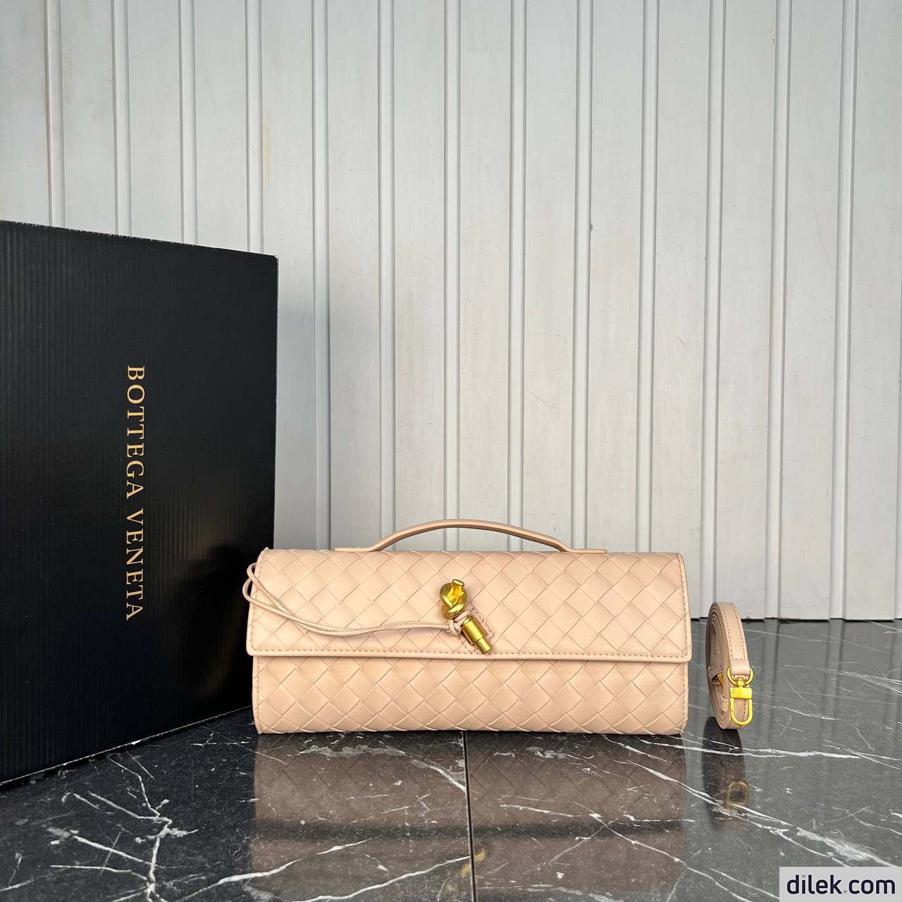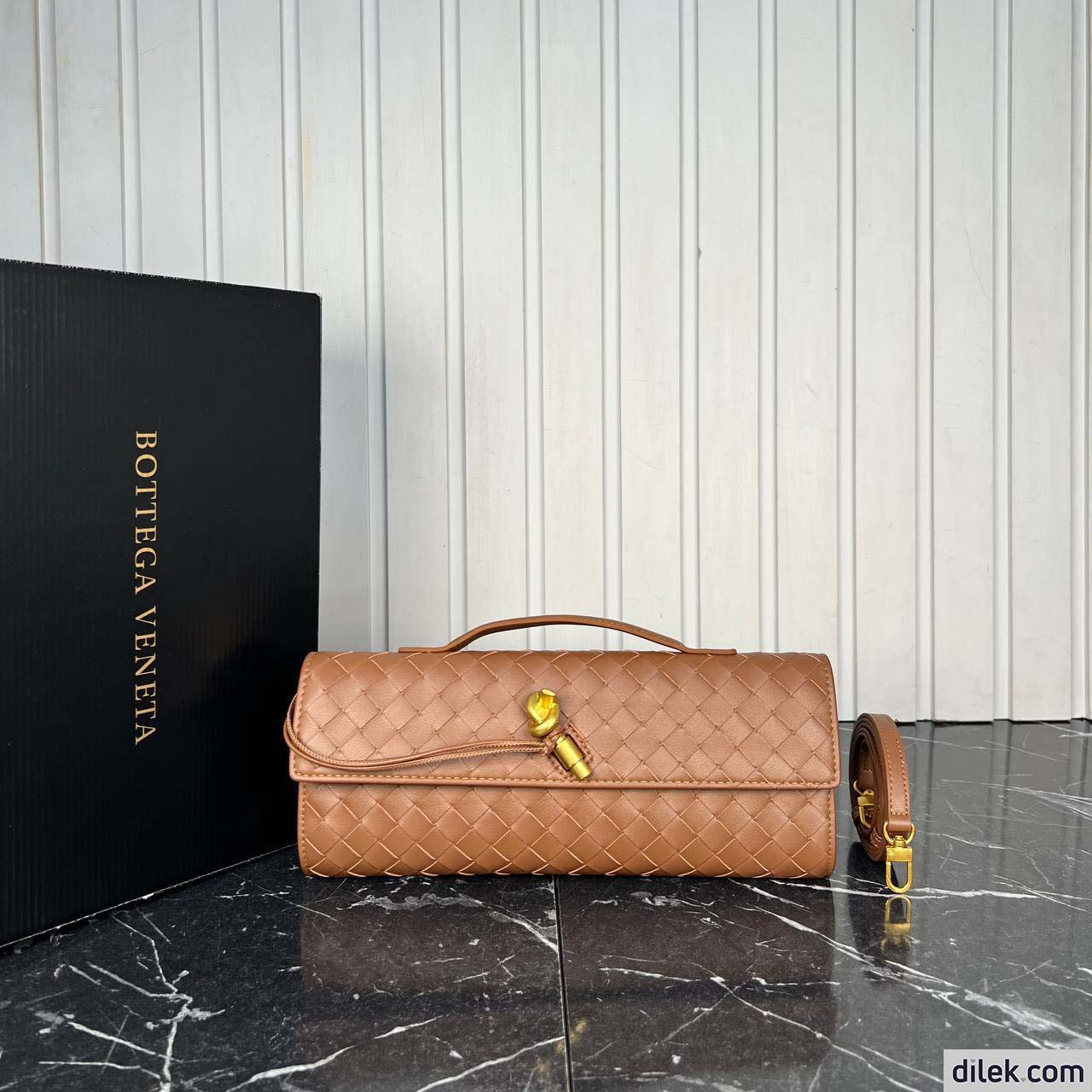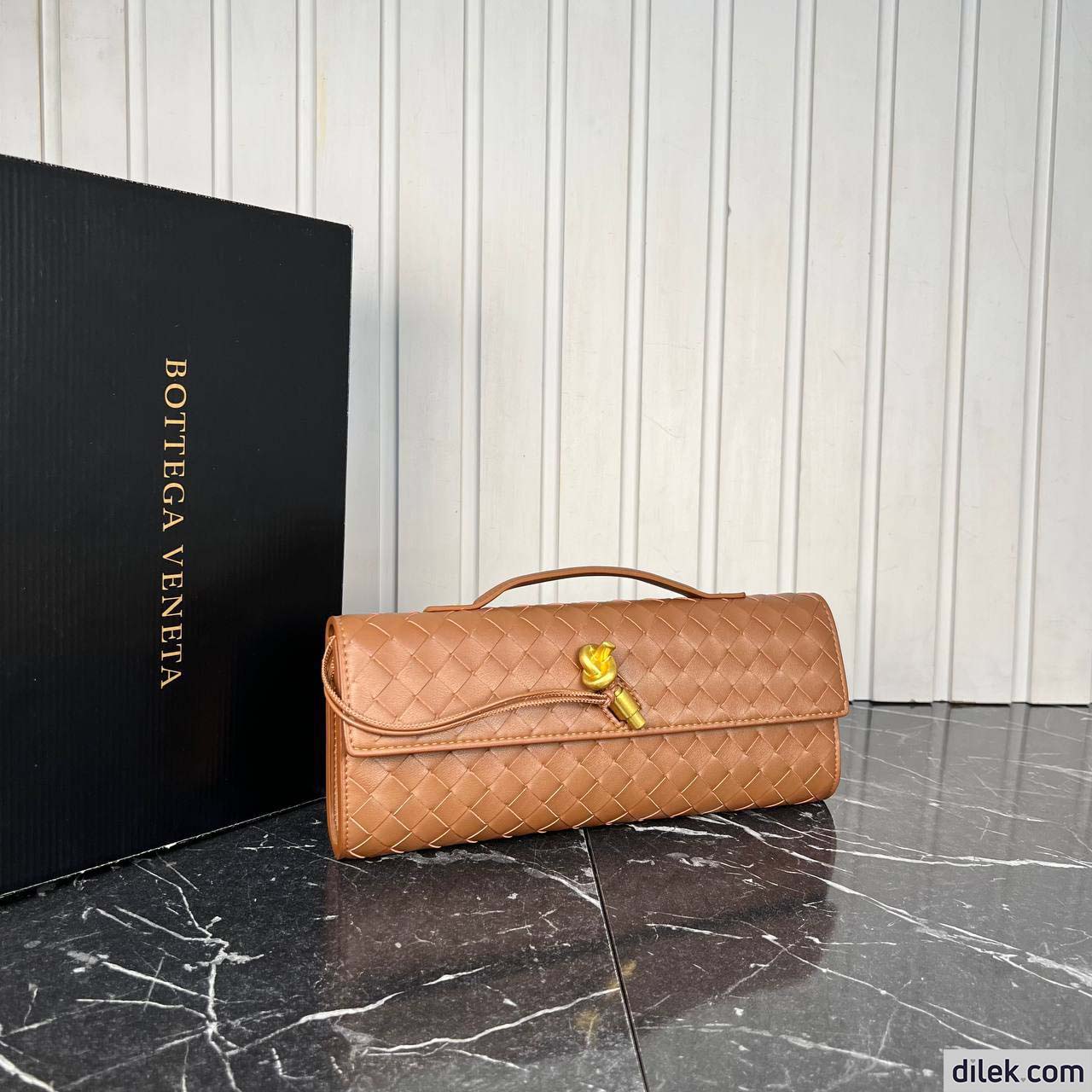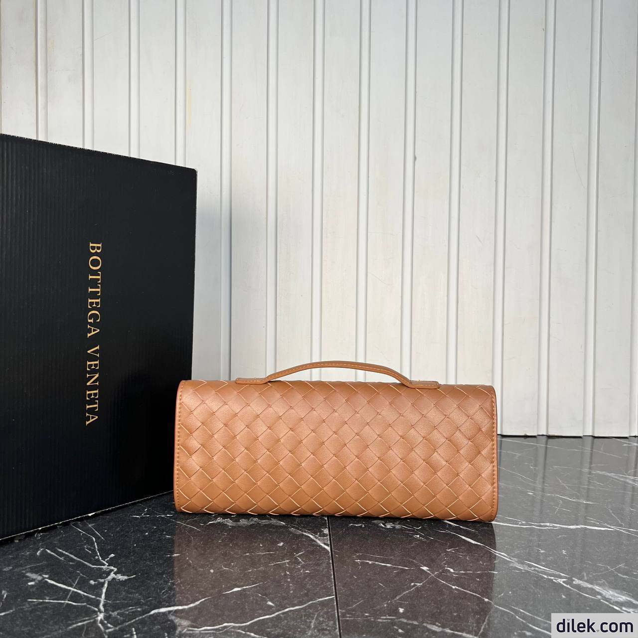 Top handle clutch in supple Intrecciato leather with signature knot closure.