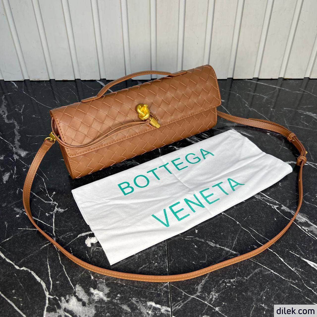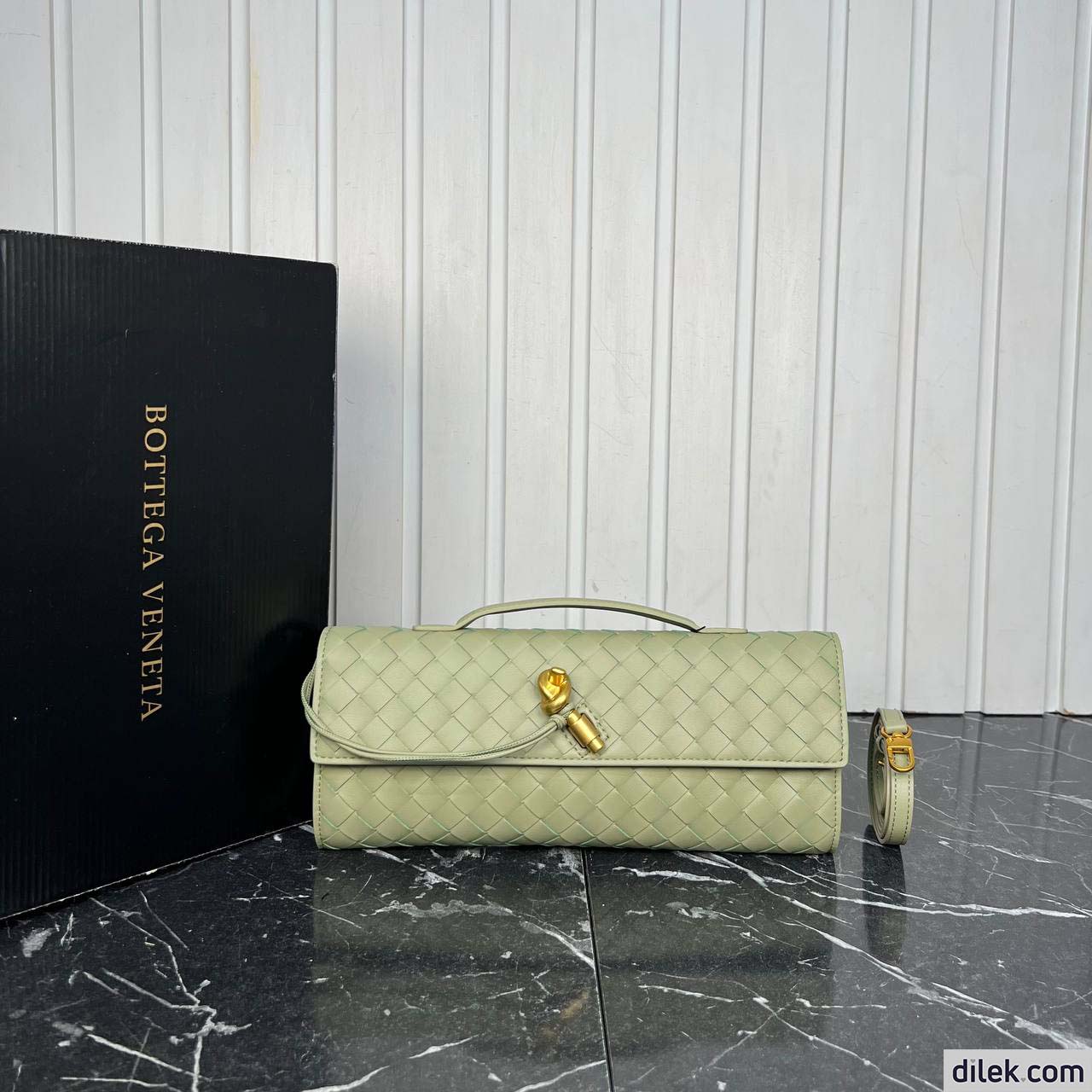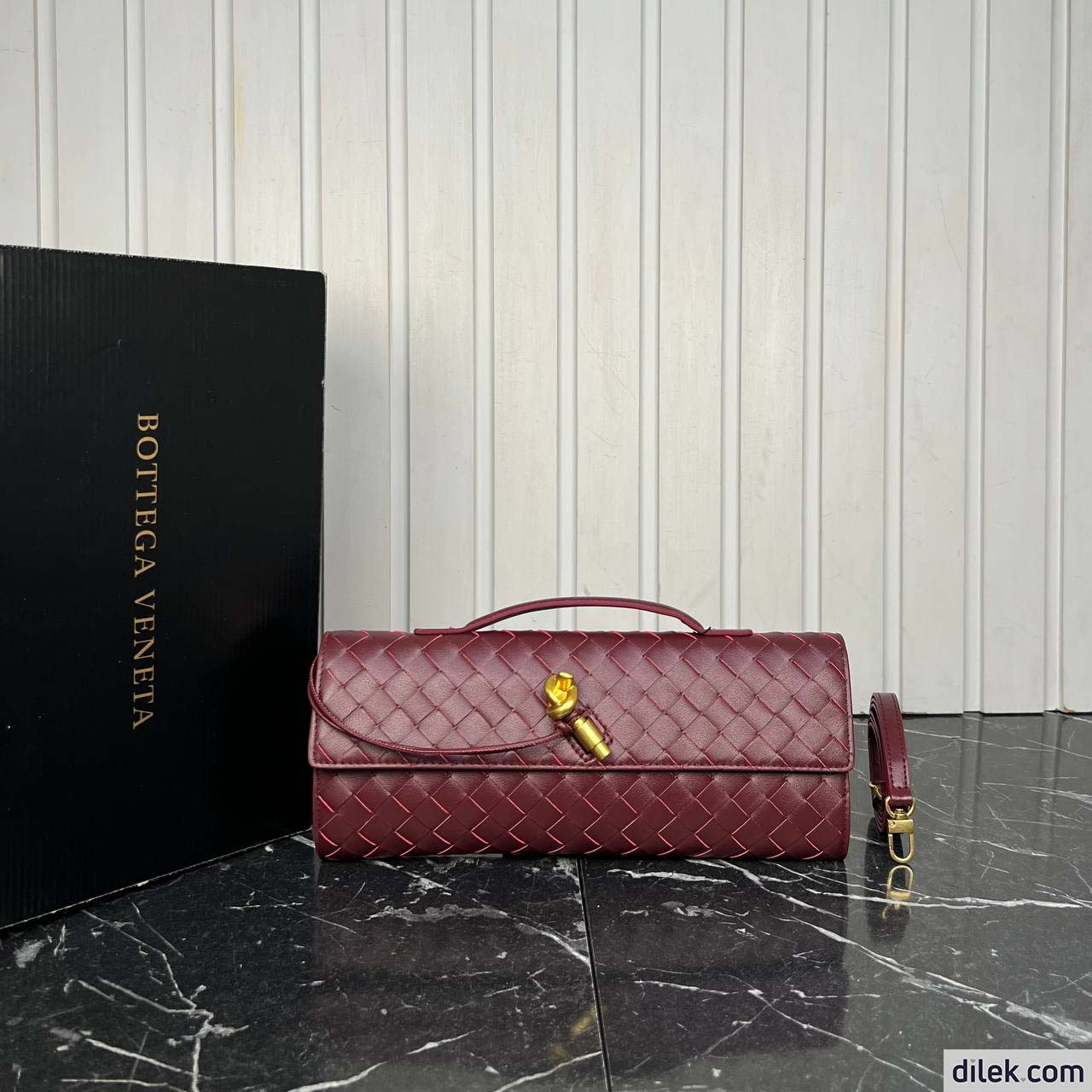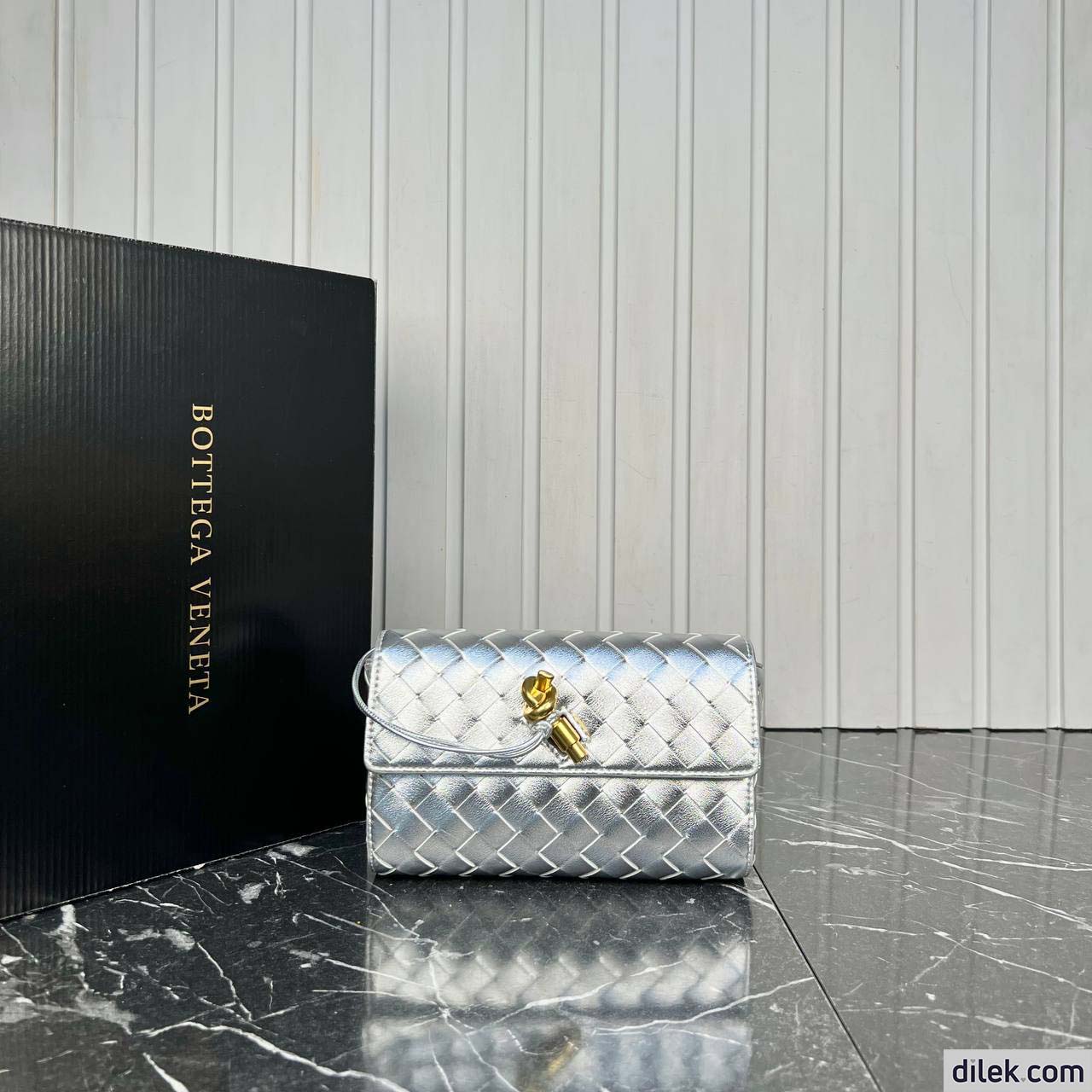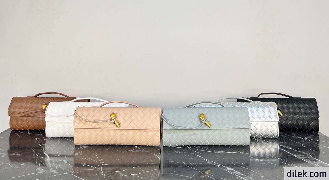 Top handle clutch in supple Intrecciato leather with signature knot closure.