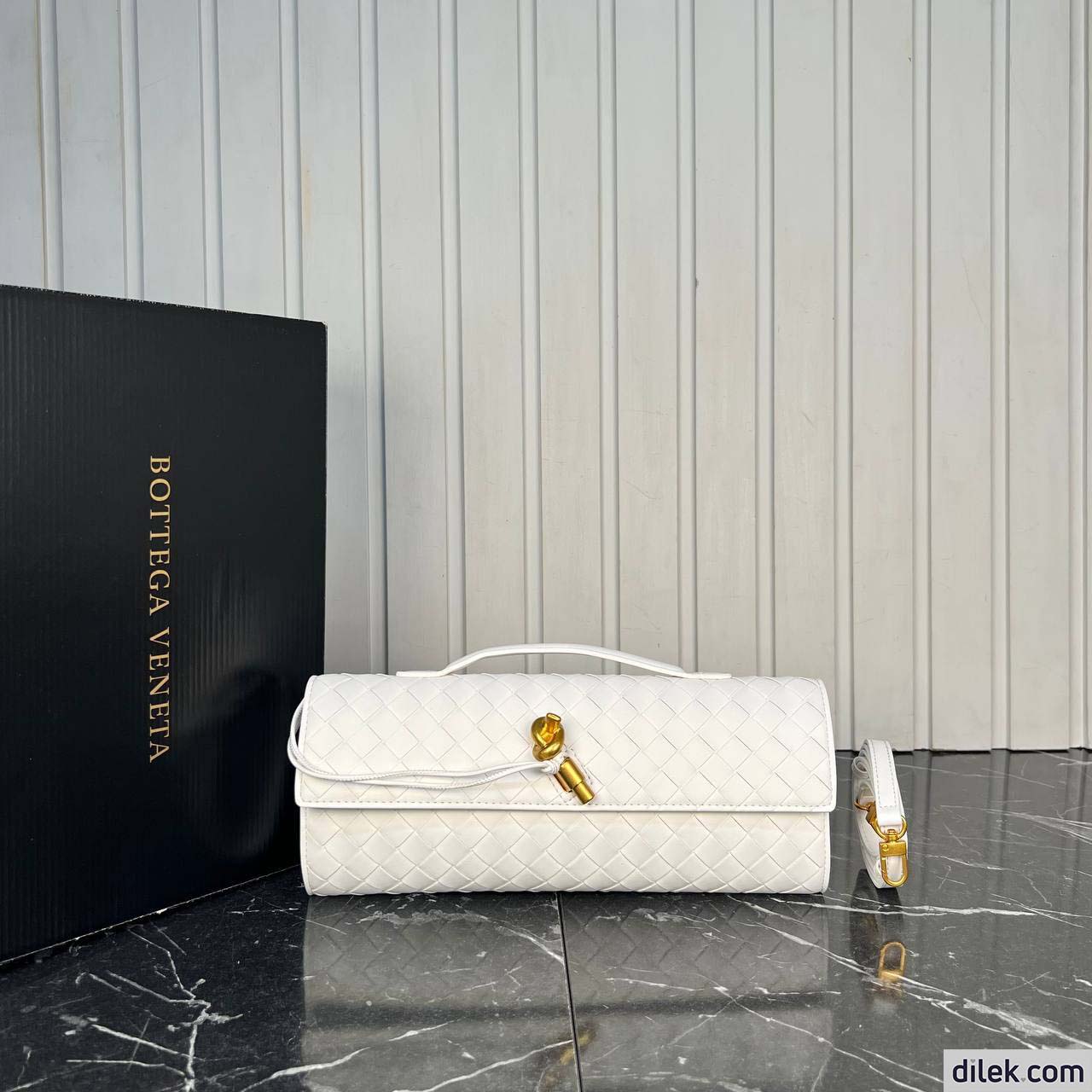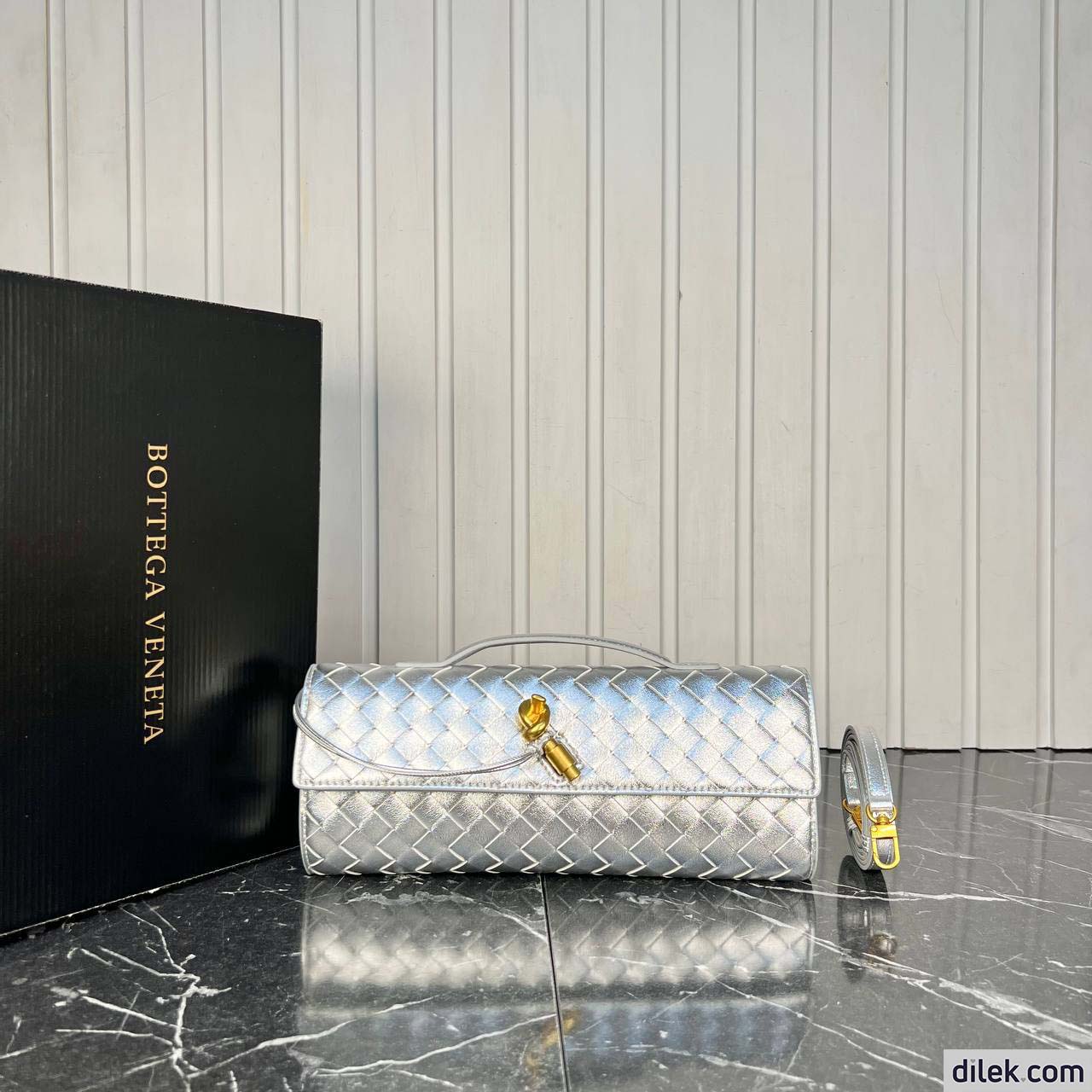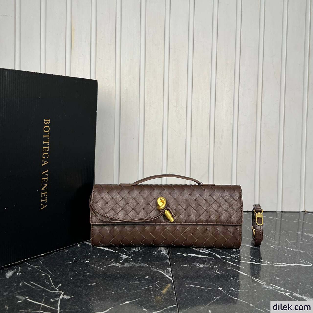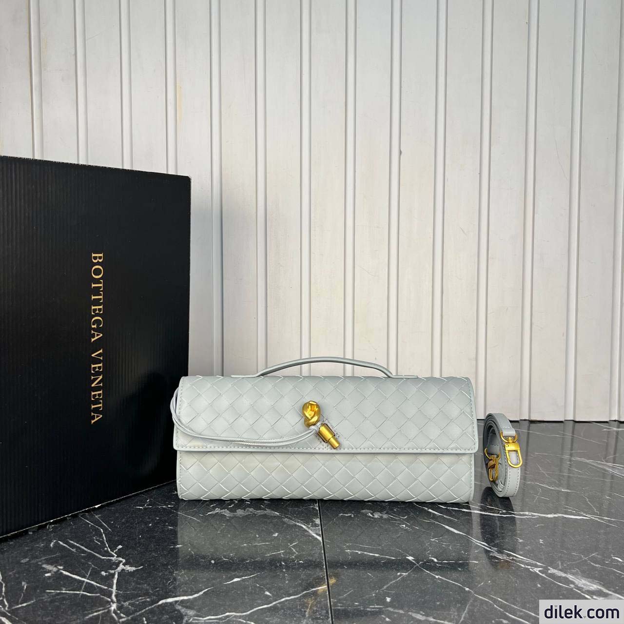 Top handle clutch in supple Intrecciato leather with signature knot closure.