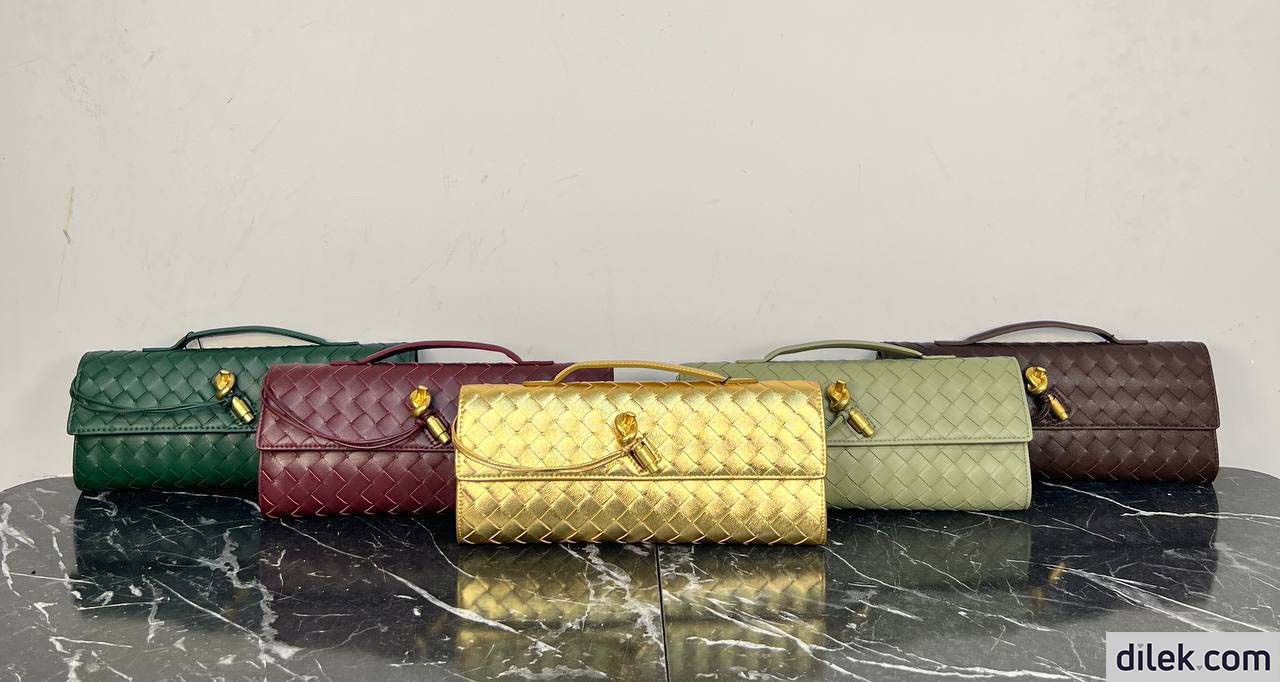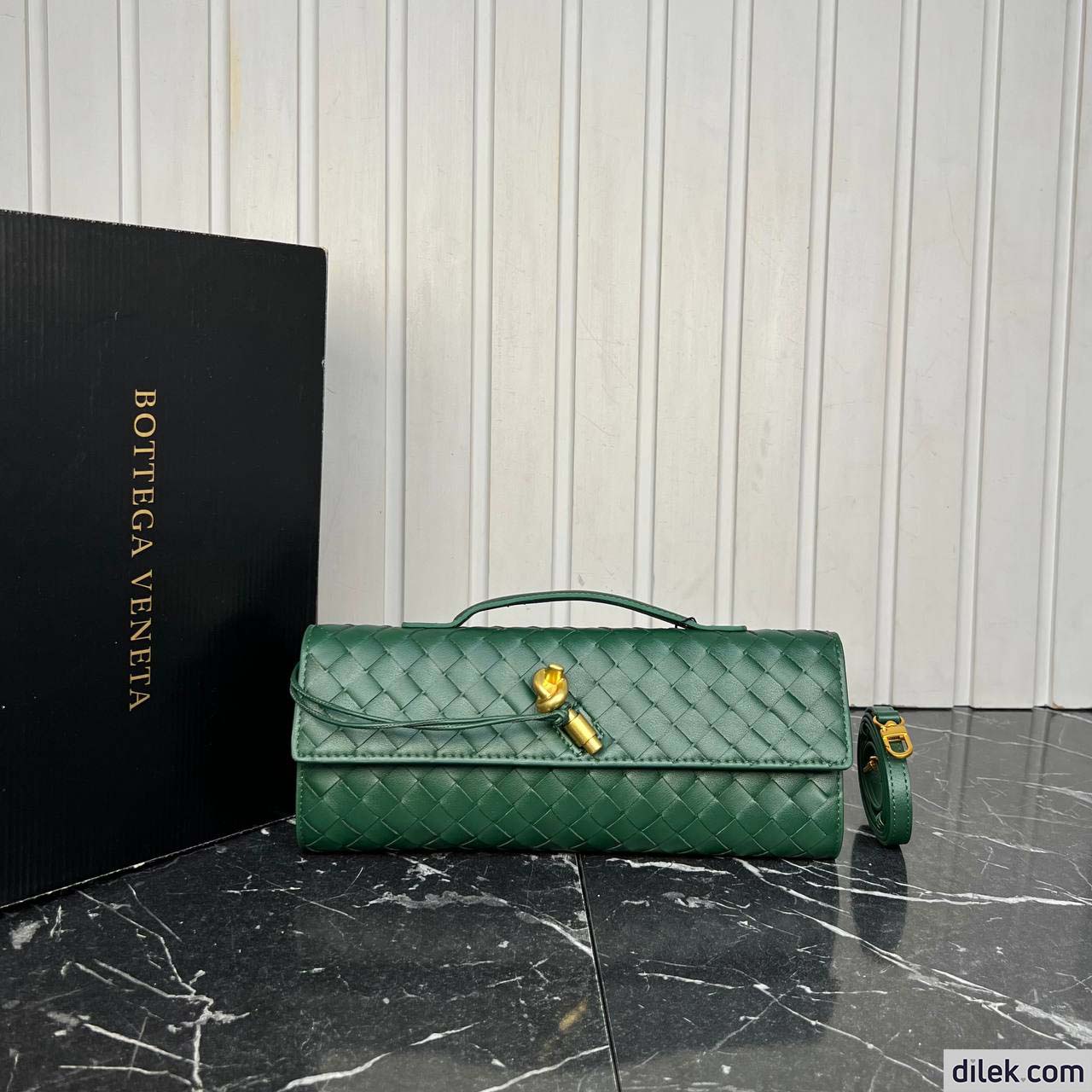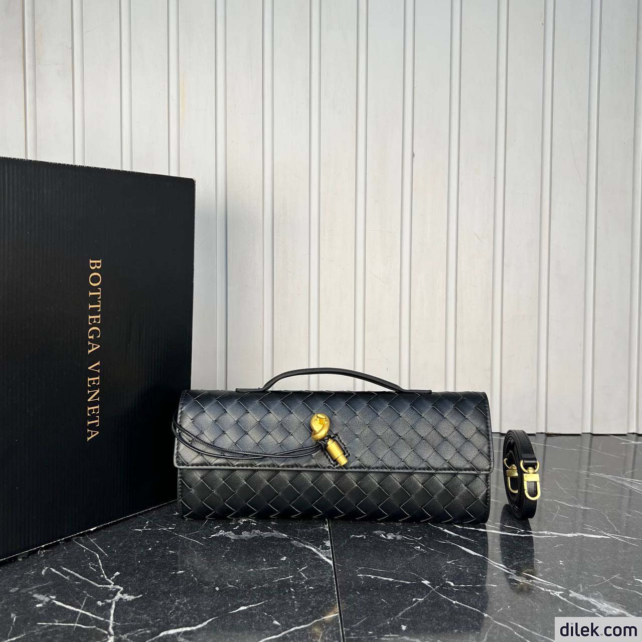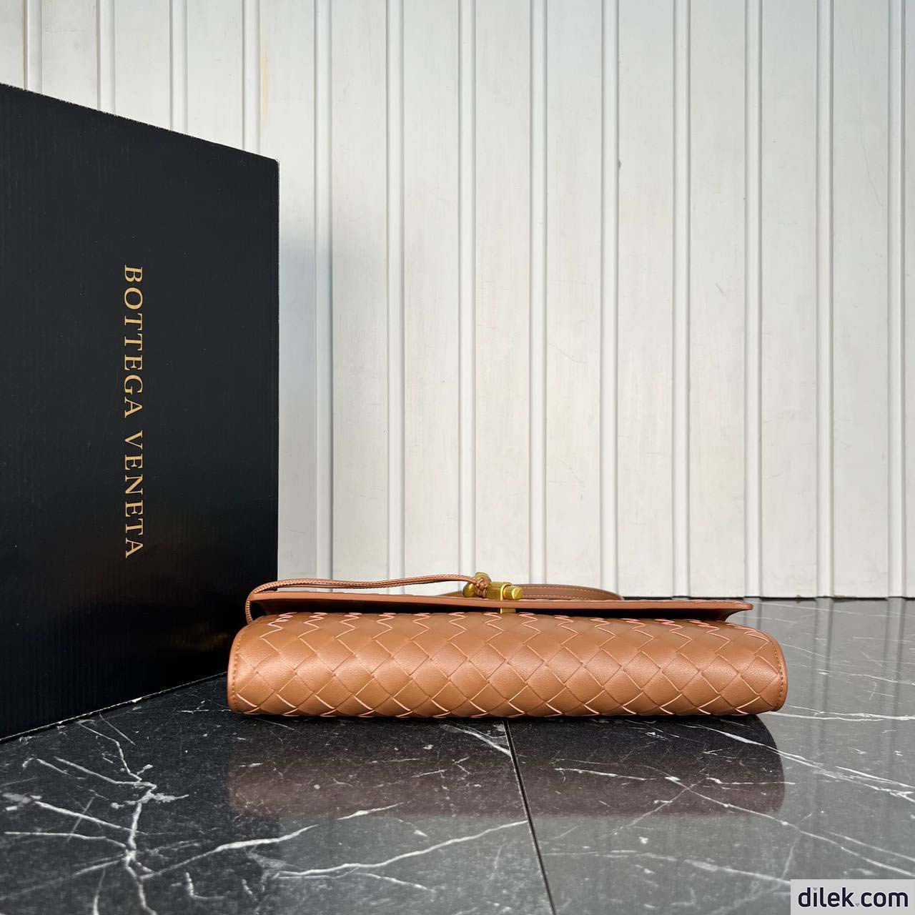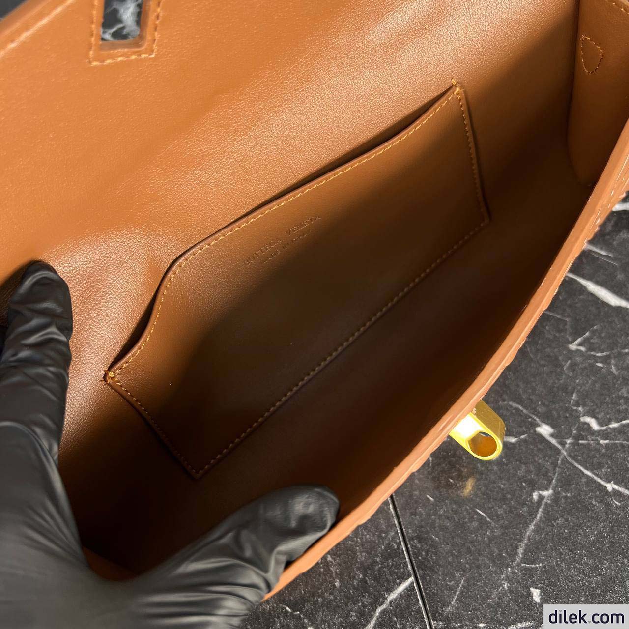 Top handle clutch in supple Intrecciato leather with signature knot closure.