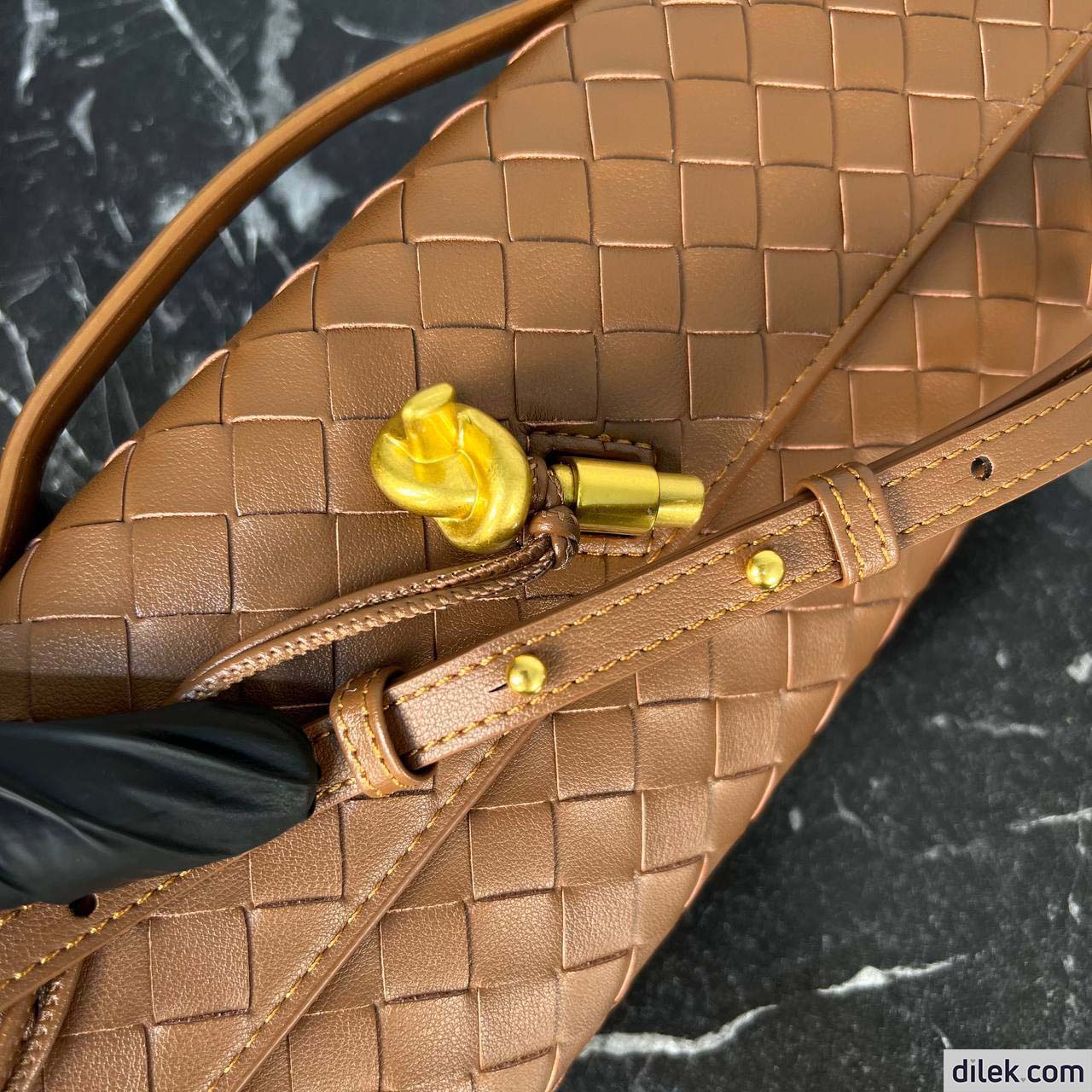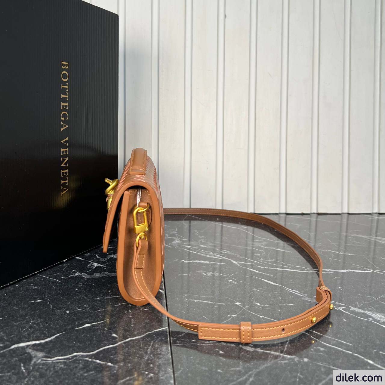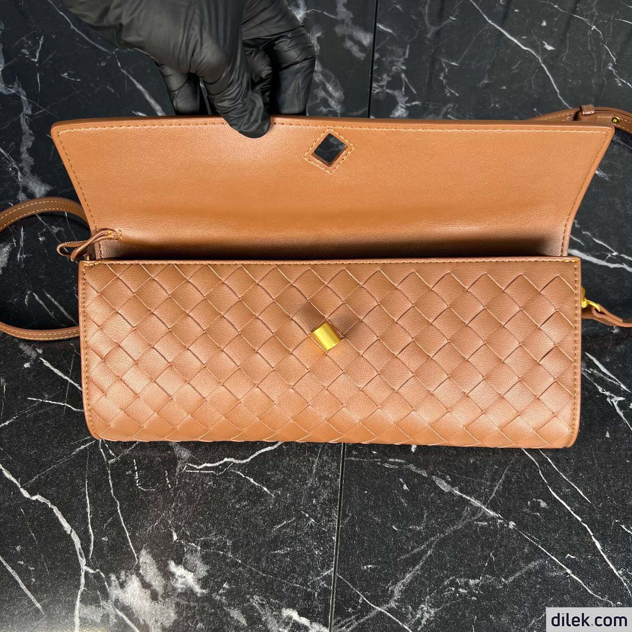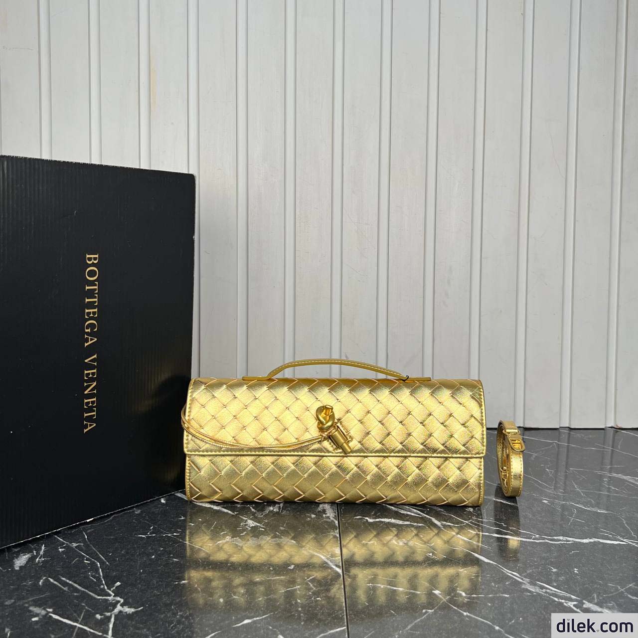 Top handle clutch in supple Intrecciato leather with signature knot closure.