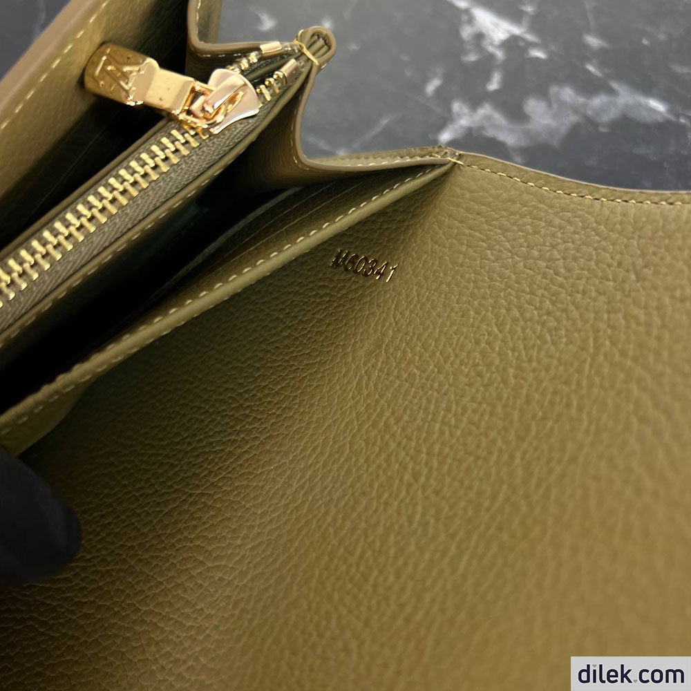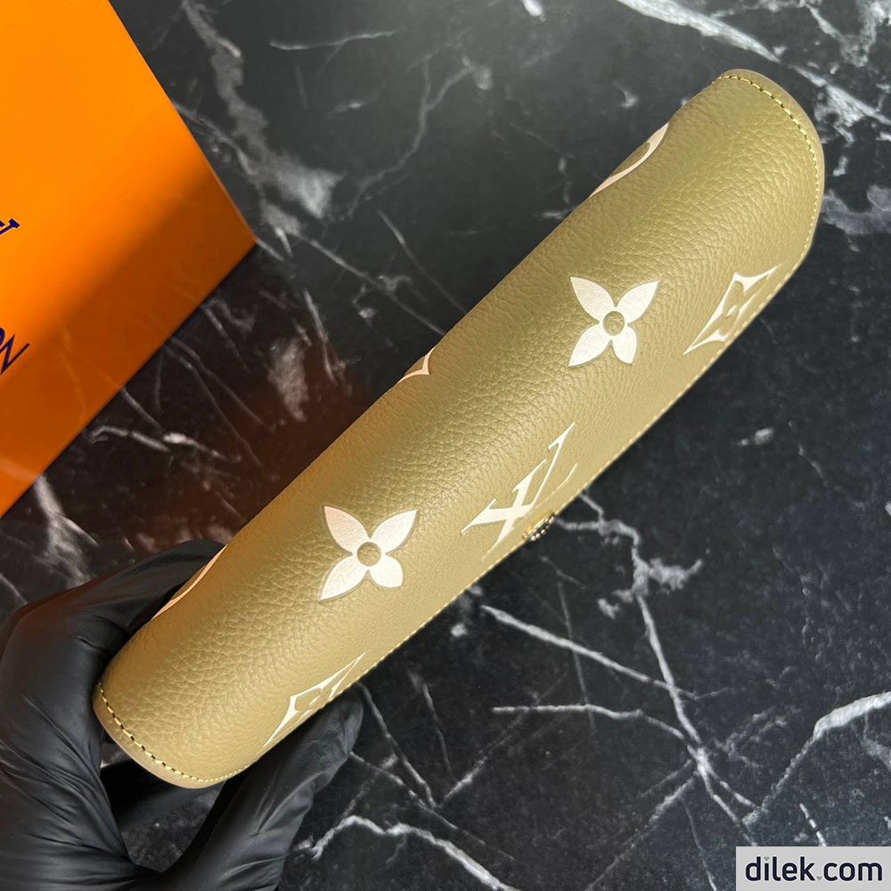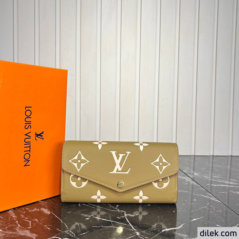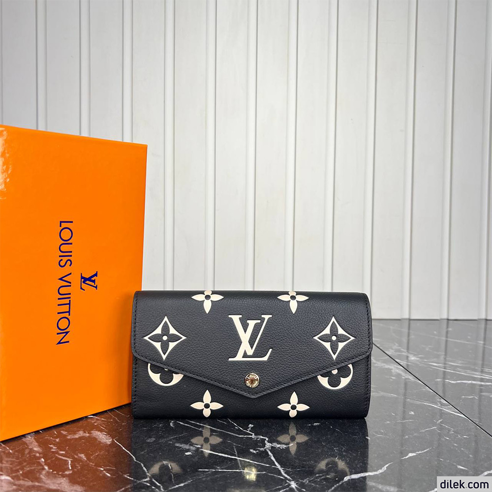 Louis Vuitton's classic Sarah wallet looks elegant in bicolor Monogram Empreinte leather, which is embossed with the signature Monogram pattern. The envelope-style flap, secured with a gold-tone press stud, opens to reveal a well-organized interior. In addition to two large compartments and several pockets, this wallet offers 16 card slots.
