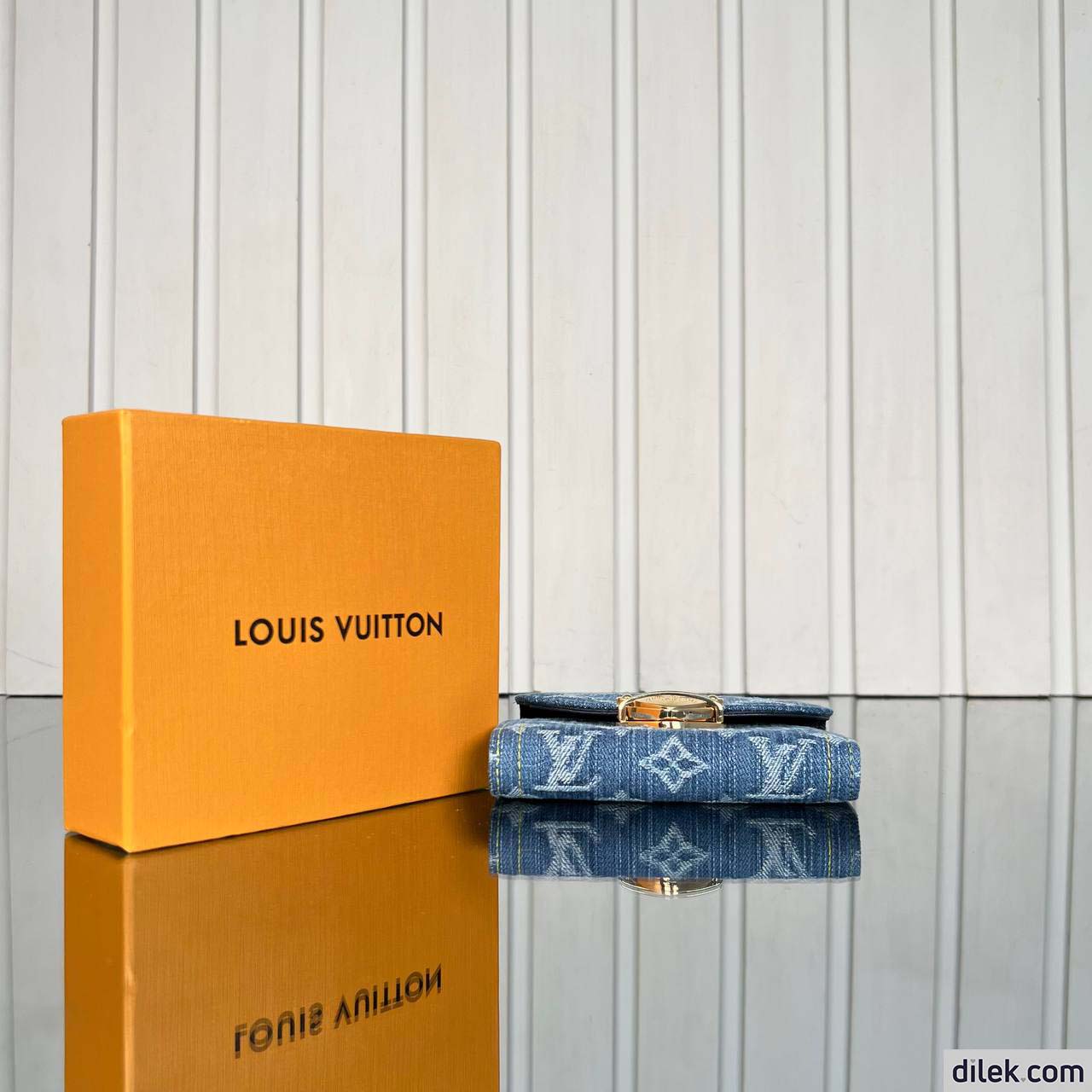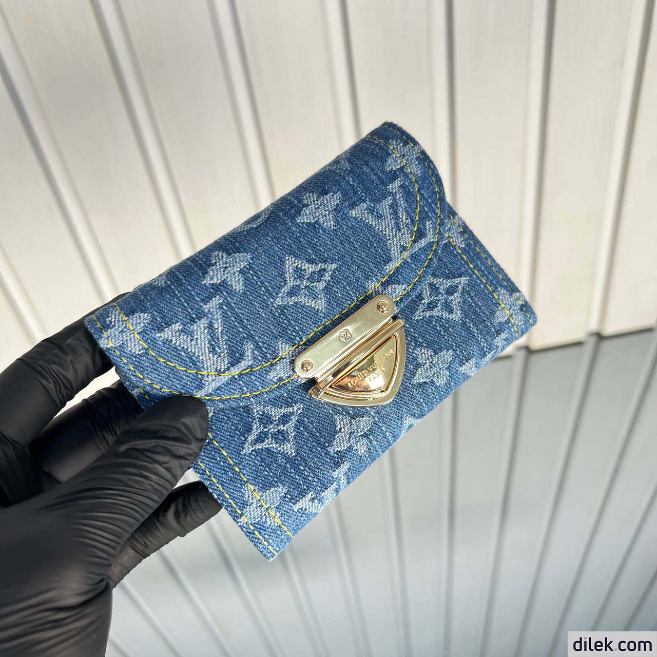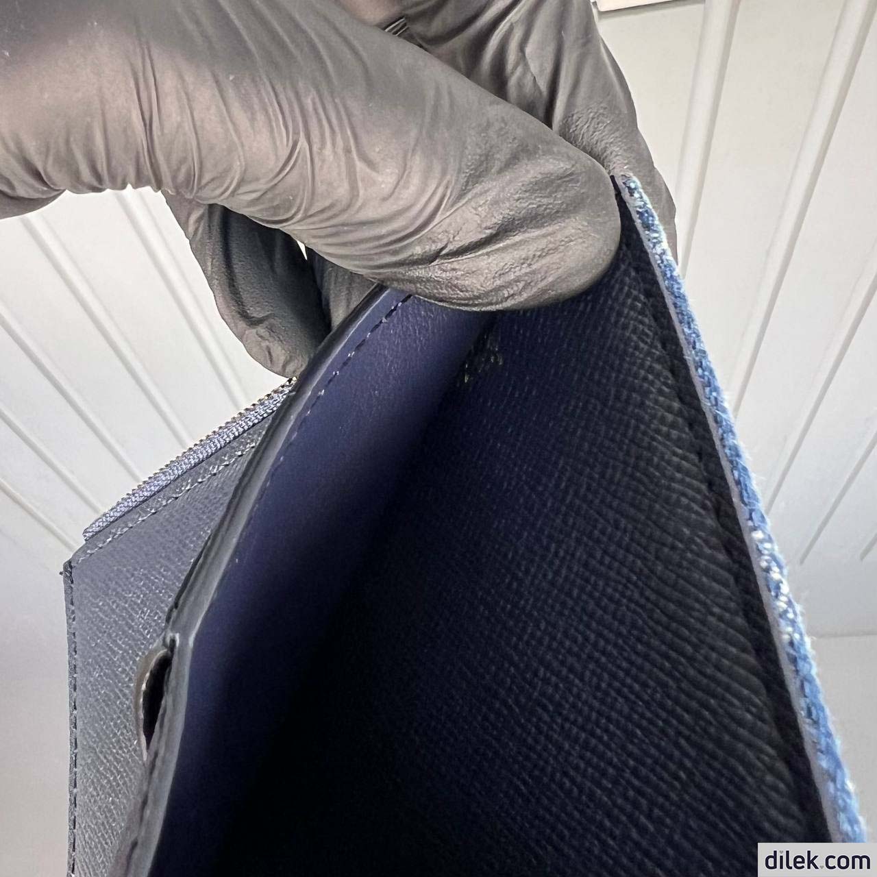 The stone-washed denim aspect of Monogram Denim canvas brings a casual feel to this Victorine Wallet. The flap is embellished with the House’s emblematic tuck lock in a gold color that perfectly complements the visible stitching. Its crafted interior includes a pocket for banknotes, a zipped coin purse, and six slots for cards.