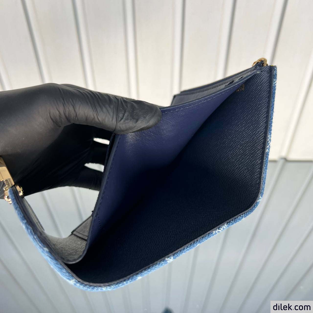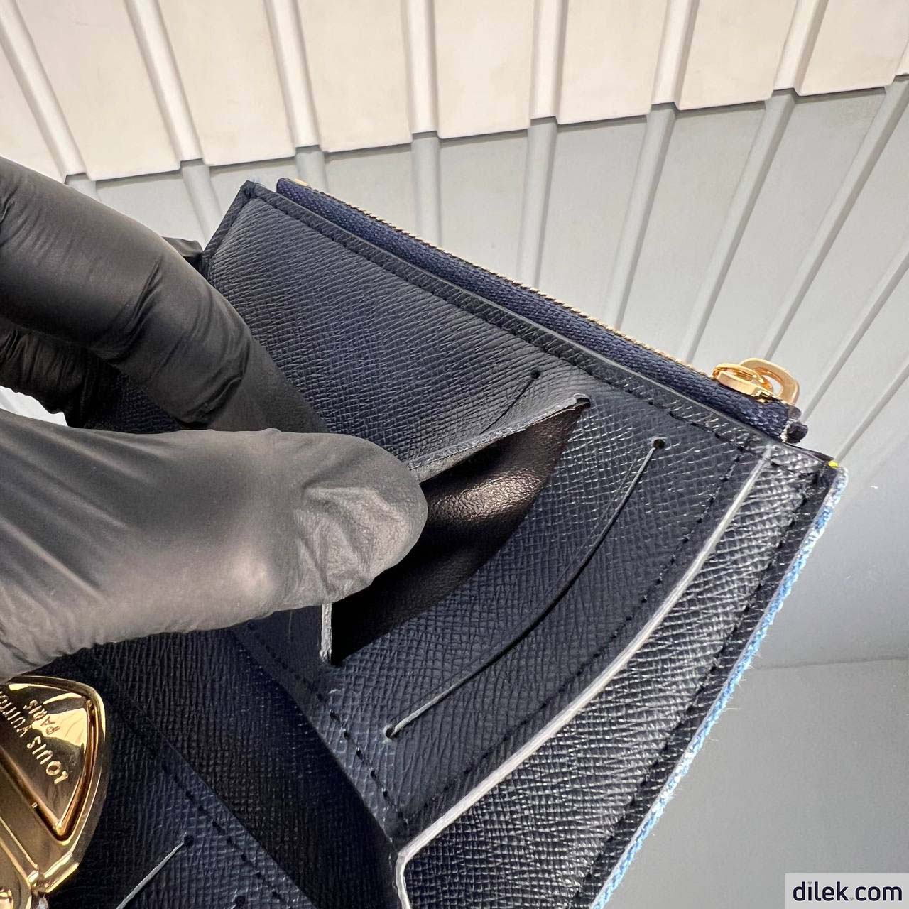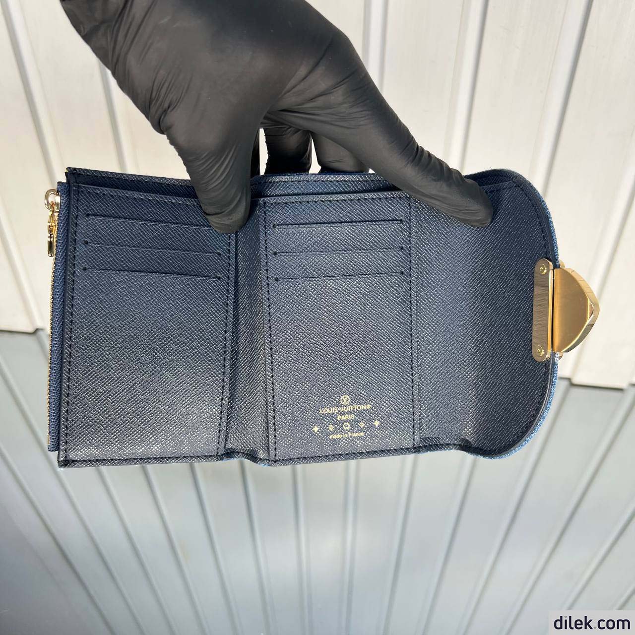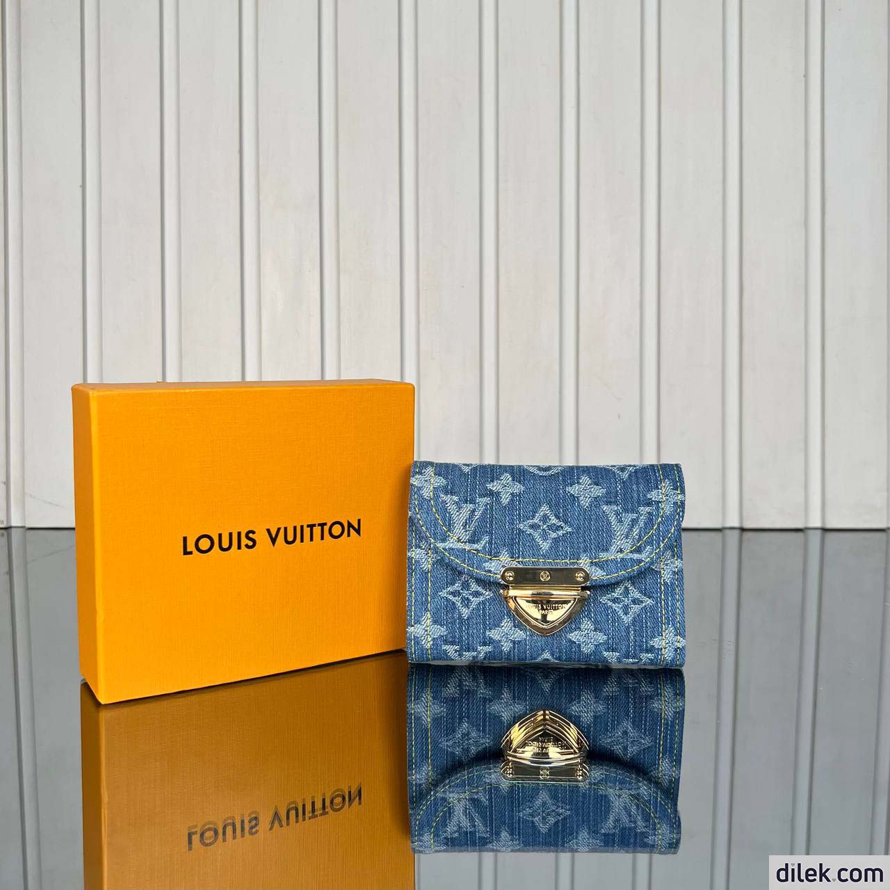 The stone-washed denim aspect of Monogram Denim canvas brings a casual feel to this Victorine Wallet. The flap is embellished with the House’s emblematic tuck lock in a gold color that perfectly complements the visible stitching. Its crafted interior includes a pocket for banknotes, a zipped coin purse, and six slots for cards.
