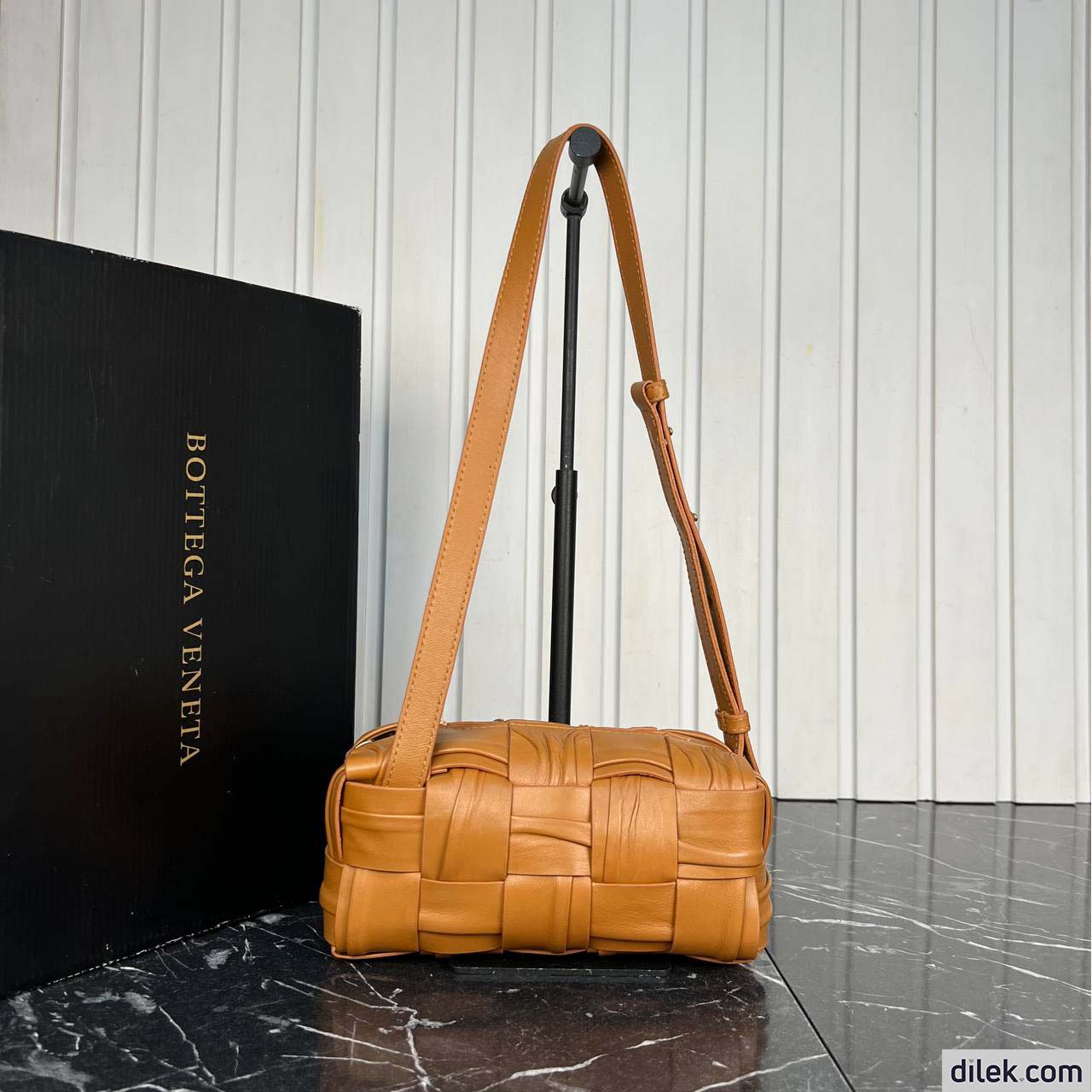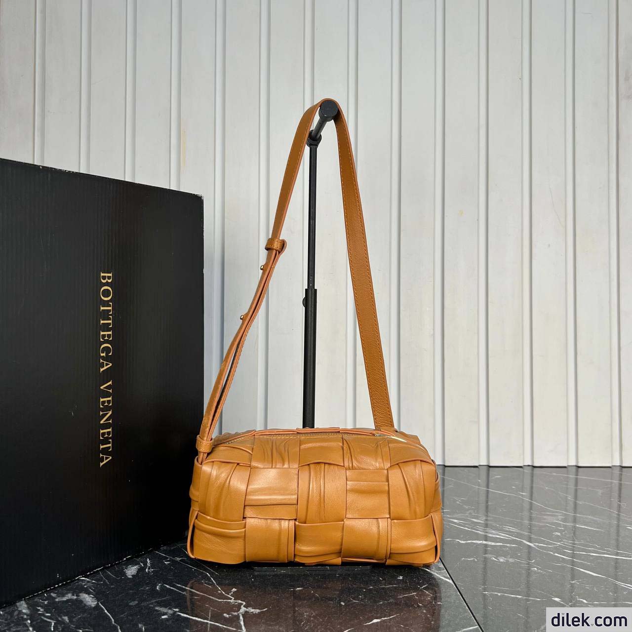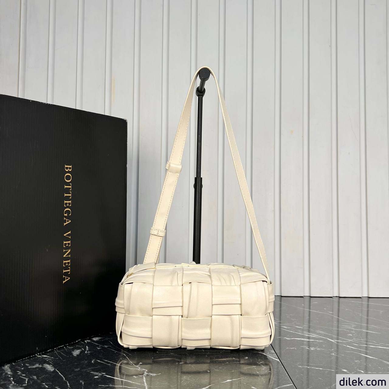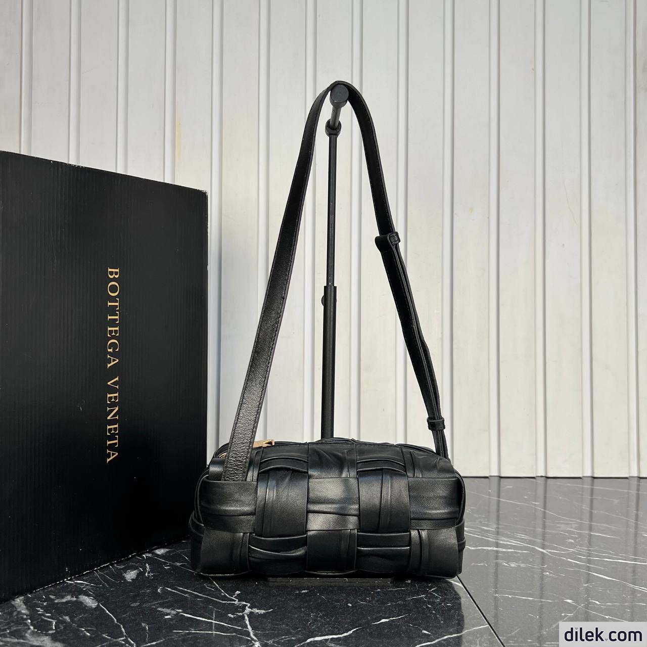 Shoulder bag with elongated brick silhouette realised with Intreccio craftsmanship in soft lambskin leather.