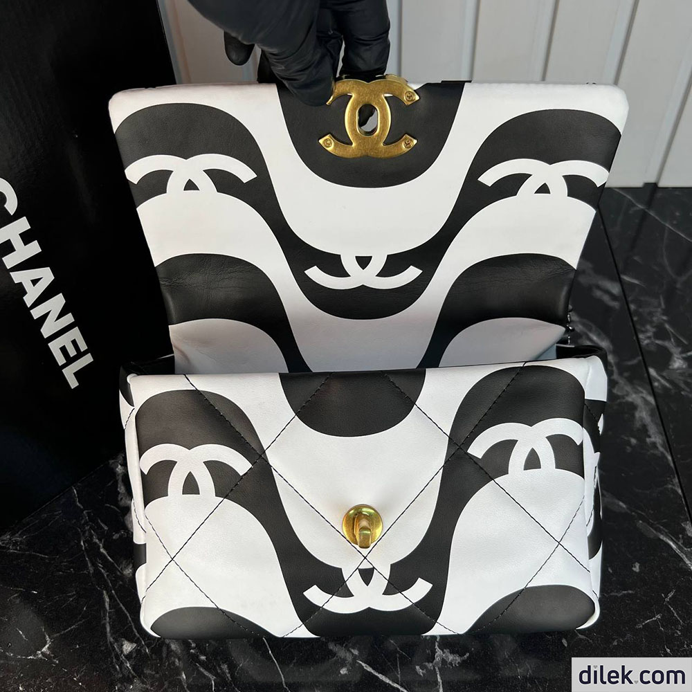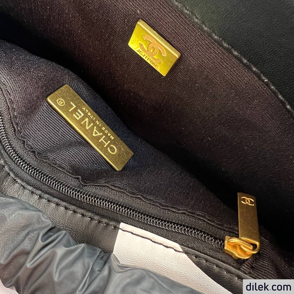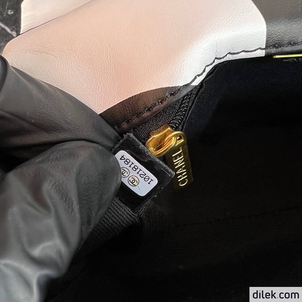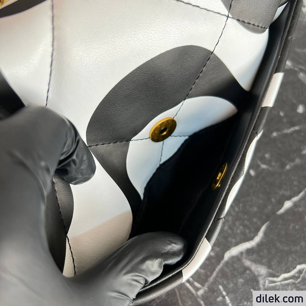 This pillowy soft shoulder bag is crafted of oversized quilted lambskin leather in black. The refined bag features an aged gold chain detail CC turn-lock on the flap, a magnetic snap pocket at the rear, and a leather threaded aged gold, ruthenium, and dark silver chain-link shoulder strap with a leather shoulder pad. The front flap opens to a red fabric interior with a zipper pocket.