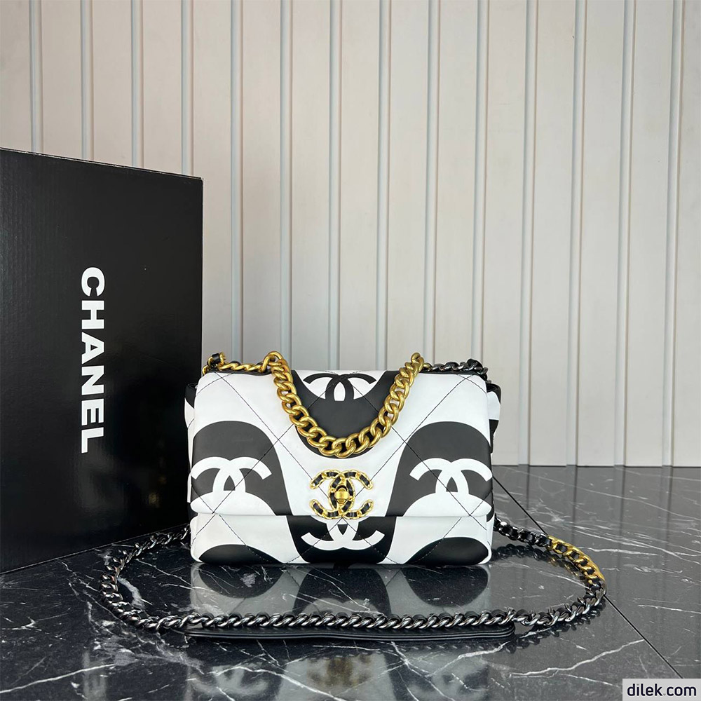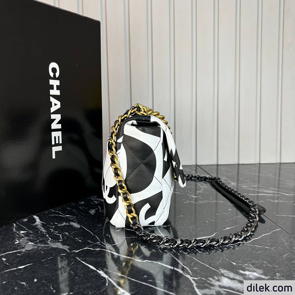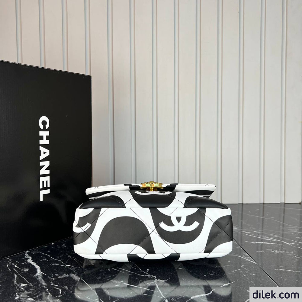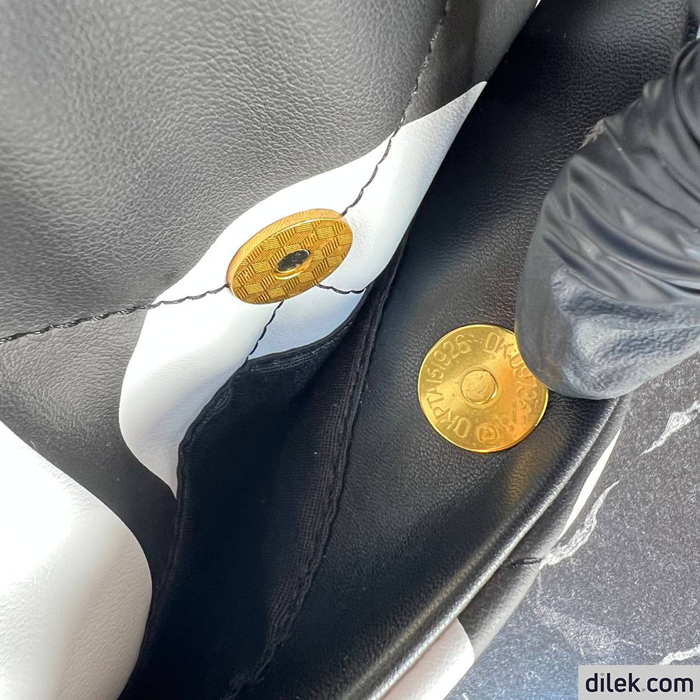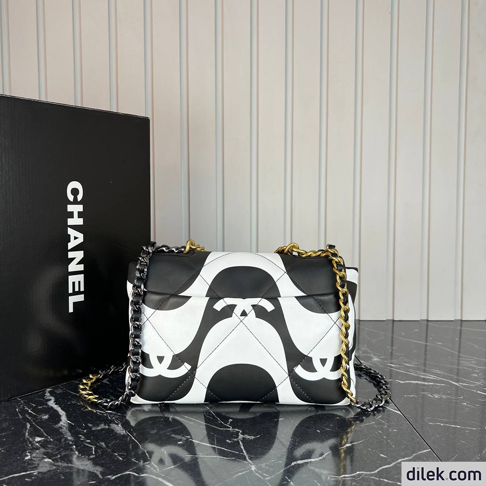 This pillowy soft shoulder bag is crafted of oversized quilted lambskin leather in black. The refined bag features an aged gold chain detail CC turn-lock on the flap, a magnetic snap pocket at the rear, and a leather threaded aged gold, ruthenium, and dark silver chain-link shoulder strap with a leather shoulder pad. The front flap opens to a red fabric interior with a zipper pocket.