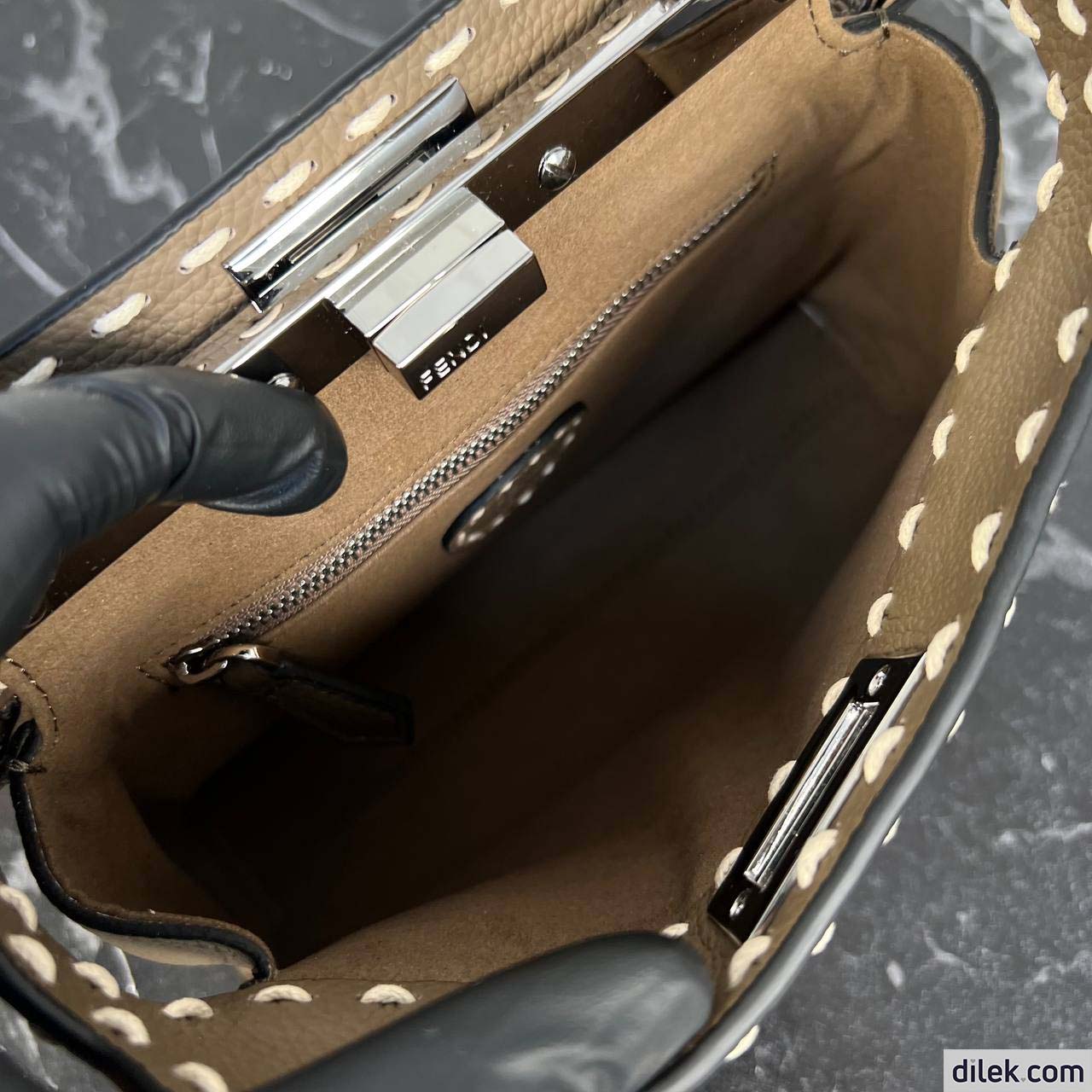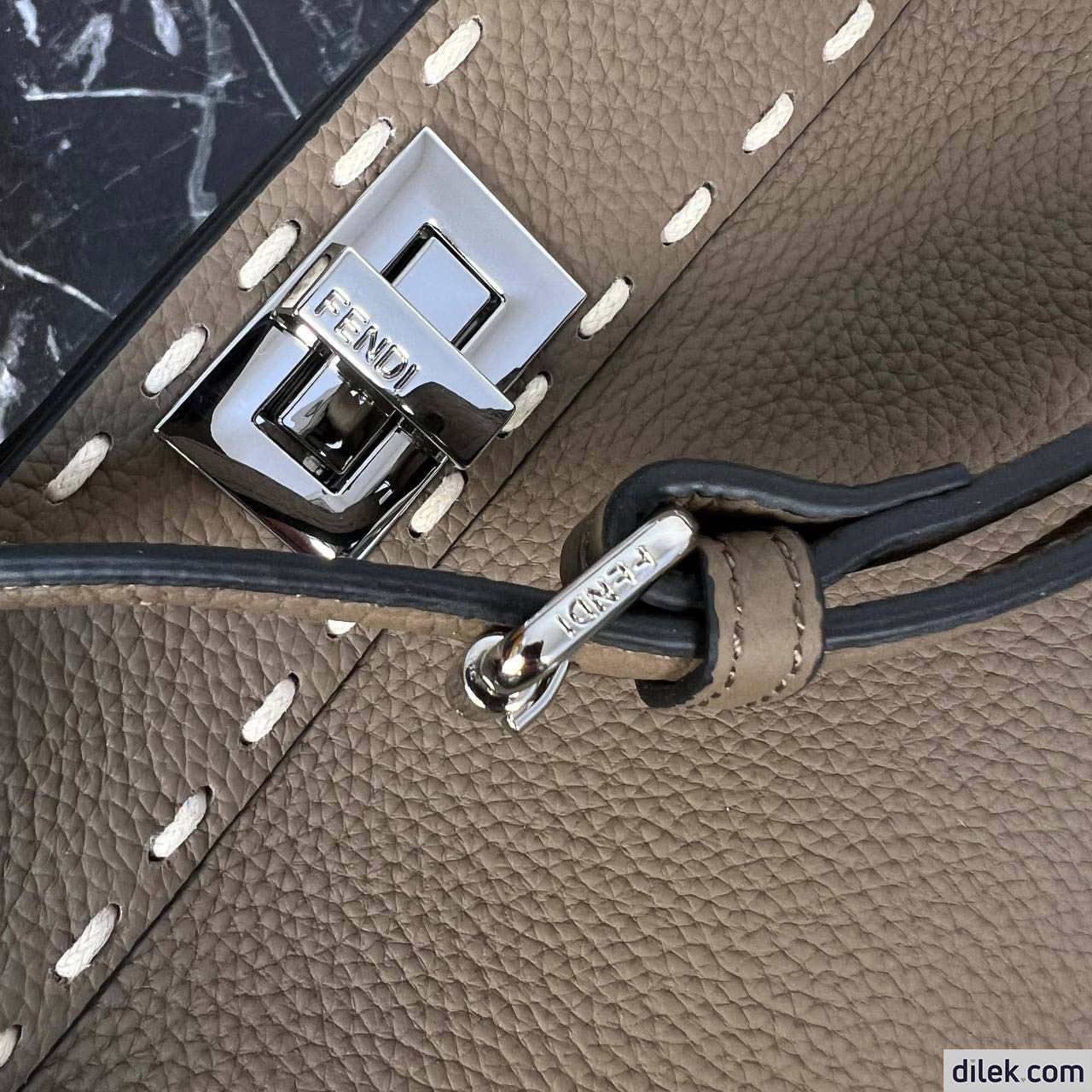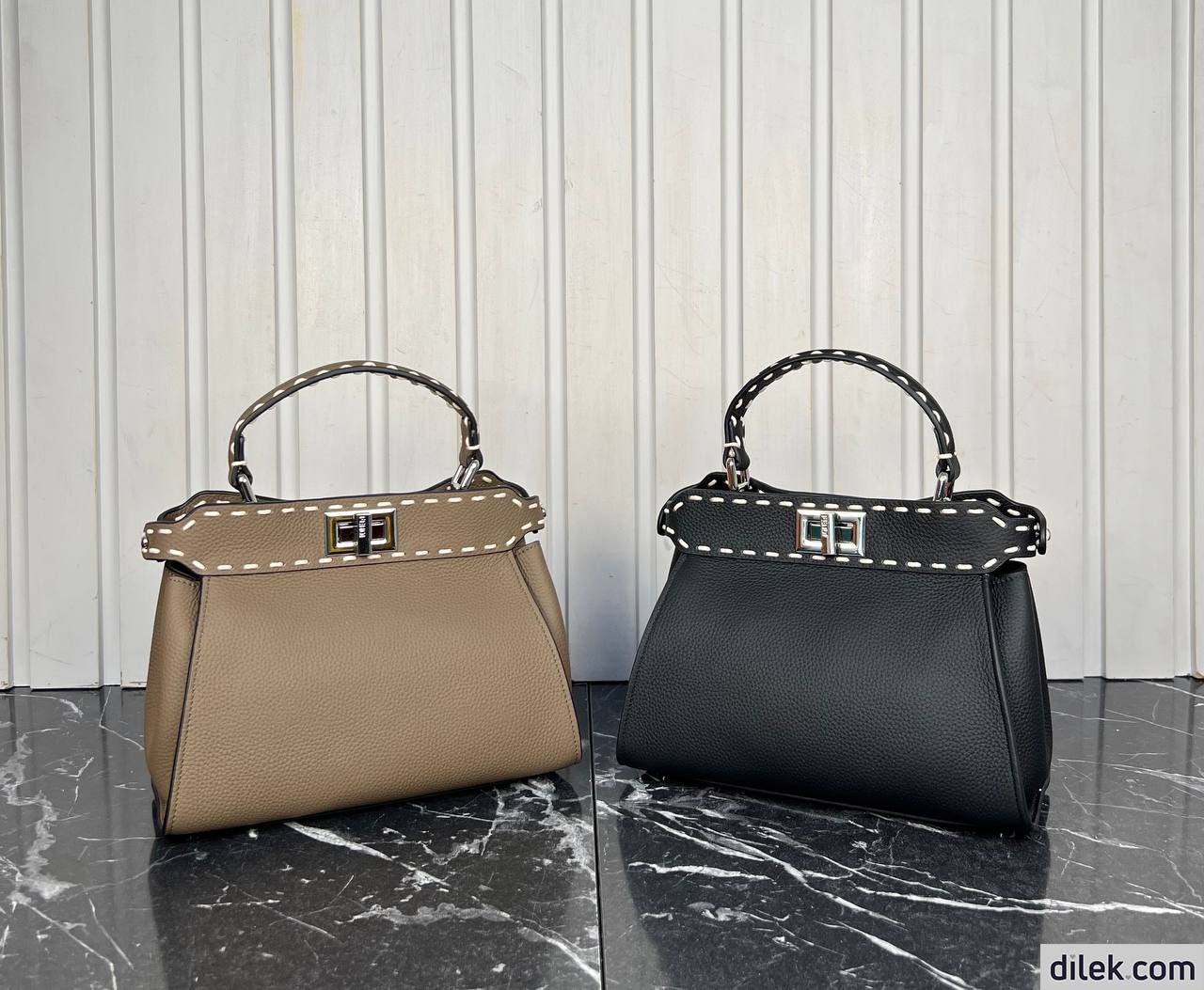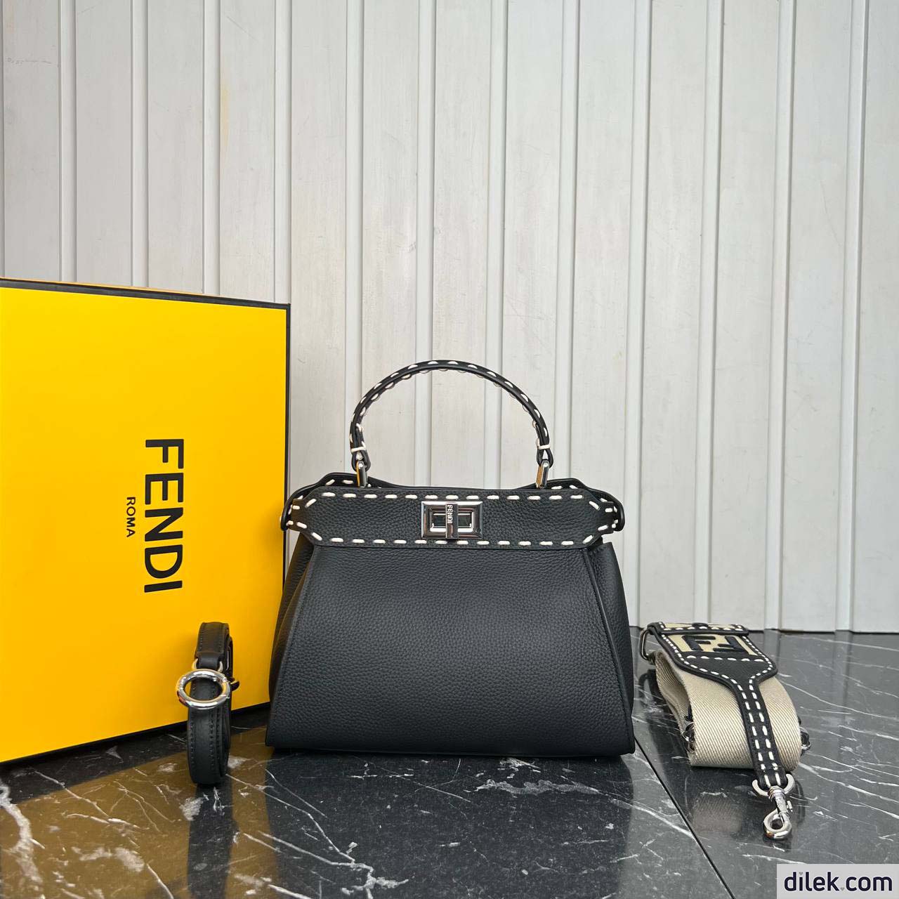 Iconic small Peekaboo bag made of soft black leather and embellished with the classic twist lock on both sides. Features a tone-on-tone nappa leather lining with two compartments separated by a stiff partition, an inner zipper pocket and gold-finish metalware. The bag can be carried by hand or worn either on the shoulder or cross-body thanks to the handle and adjustable, detachable shoulder strap.