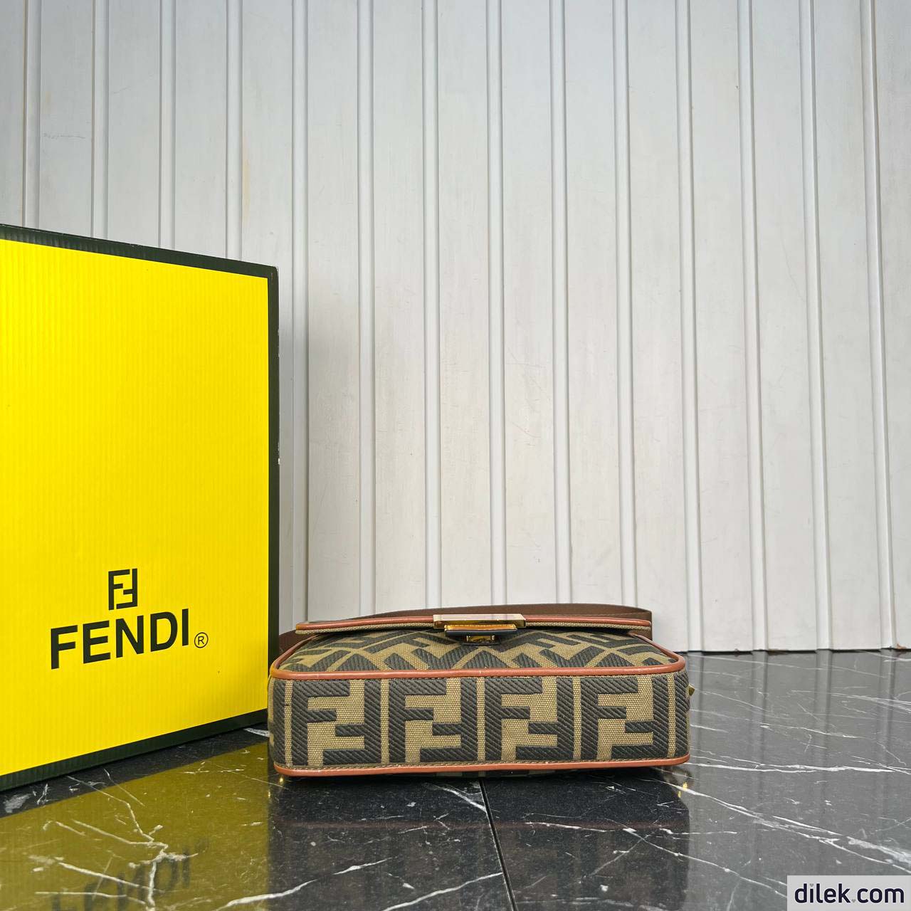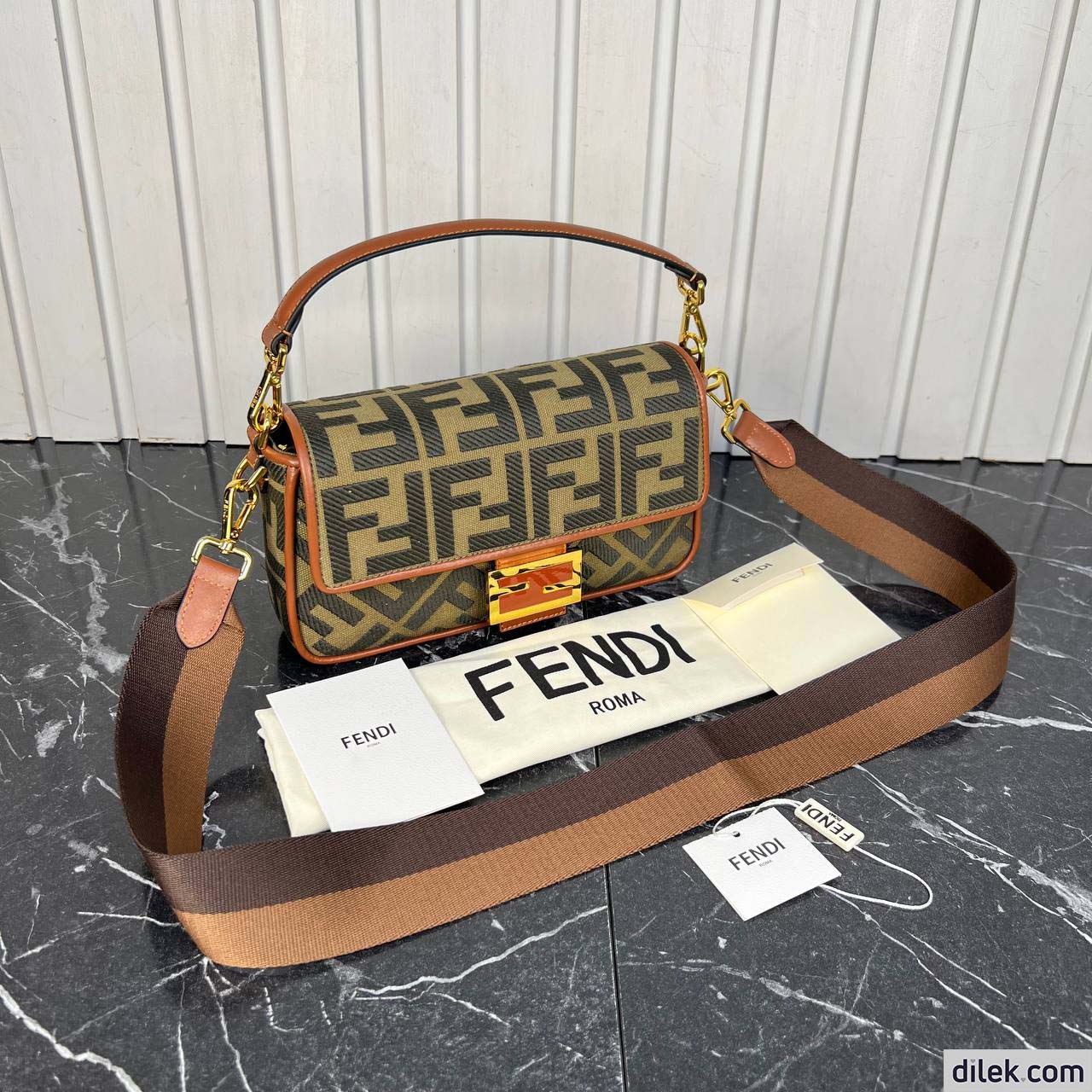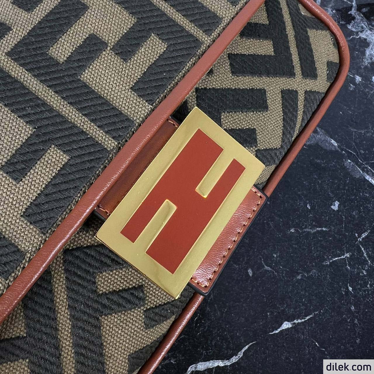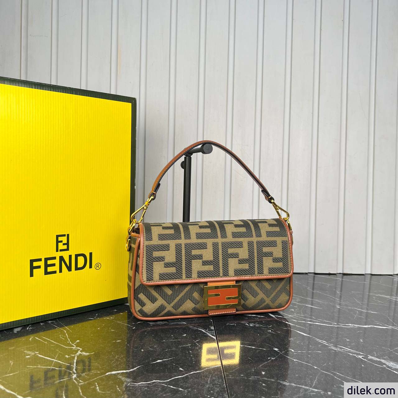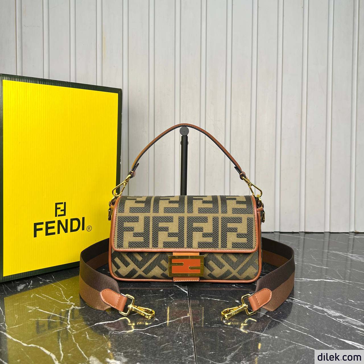Iconic medium Baguette bag, created in 1997 which went on to become the first It bag. Versatile and with timeless appeal, it features the iconic underarm design inspired by the French Baguette bread from which it takes its name. Made of jacquard fabric with the iconic FF motif in brown, decorated with an FF clasp and trimmed with black embroidery.