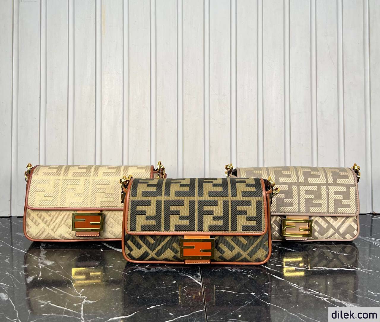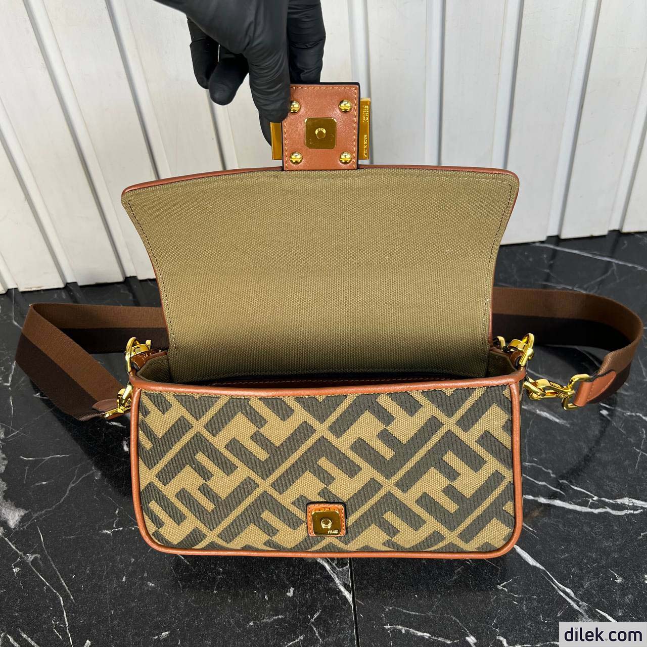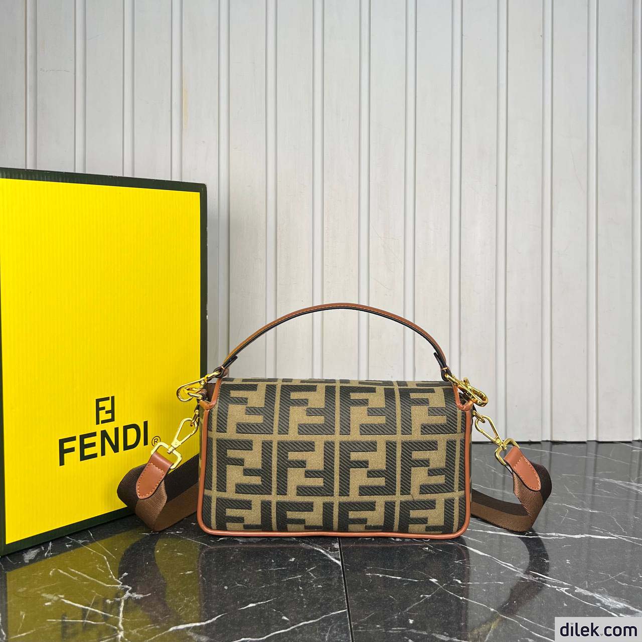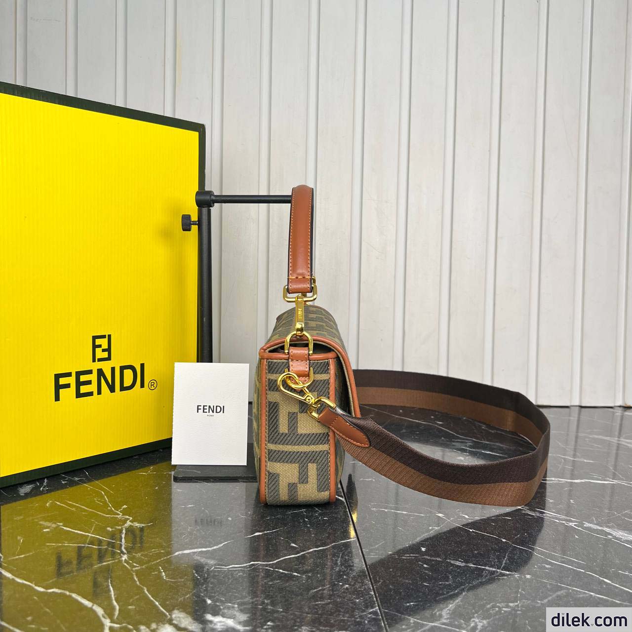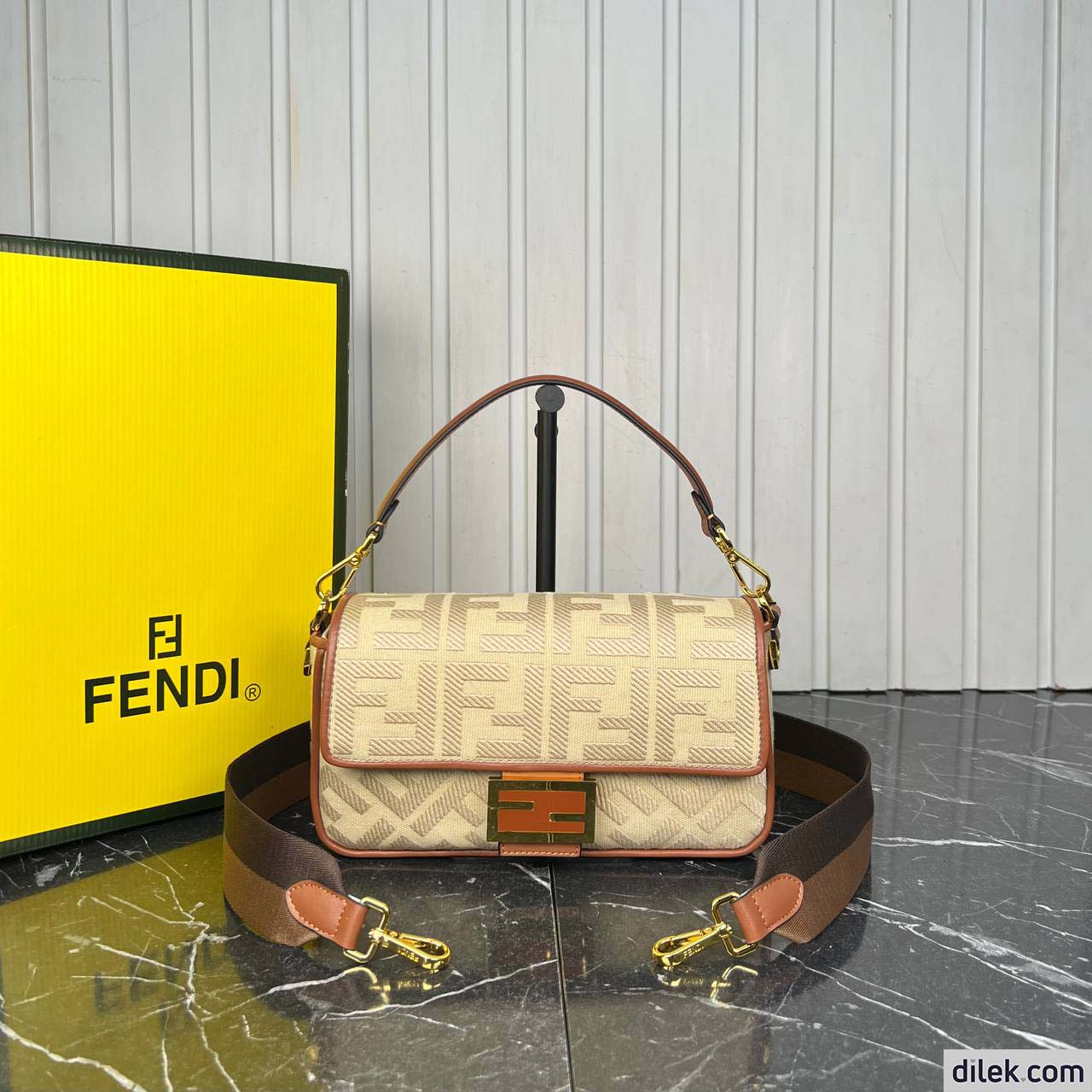 Iconic medium Baguette bag, created in 1997 which went on to become the first It bag. Versatile and with timeless appeal, it features the iconic underarm design inspired by the French Baguette bread from which it takes its name. Made of jacquard fabric with the iconic FF motif in brown, decorated with an FF clasp and trimmed with black embroidery.