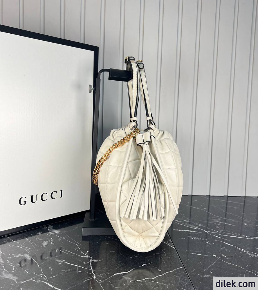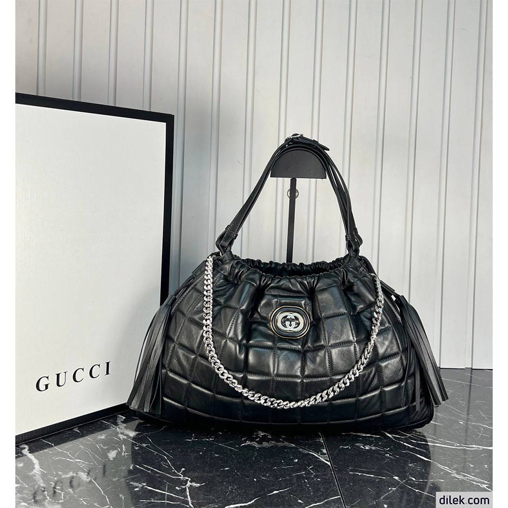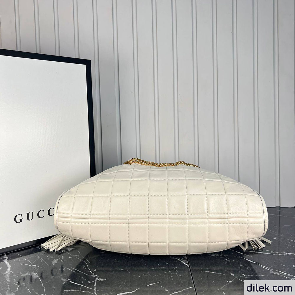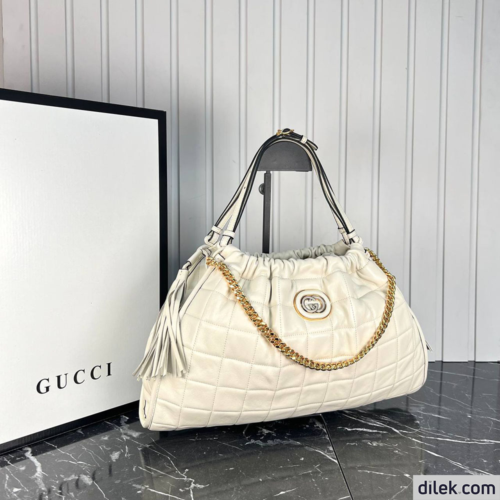 Heritage and innovation combine in this elevated version of the everyday tote. Designed with a relaxed silhouette, the new Gucci tote bag combines quilted materials with a chain strap and a roomy structure, providing style, versatility and practicality.