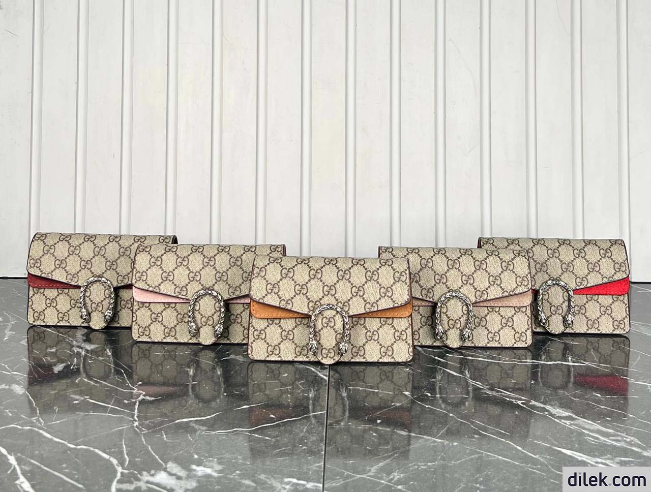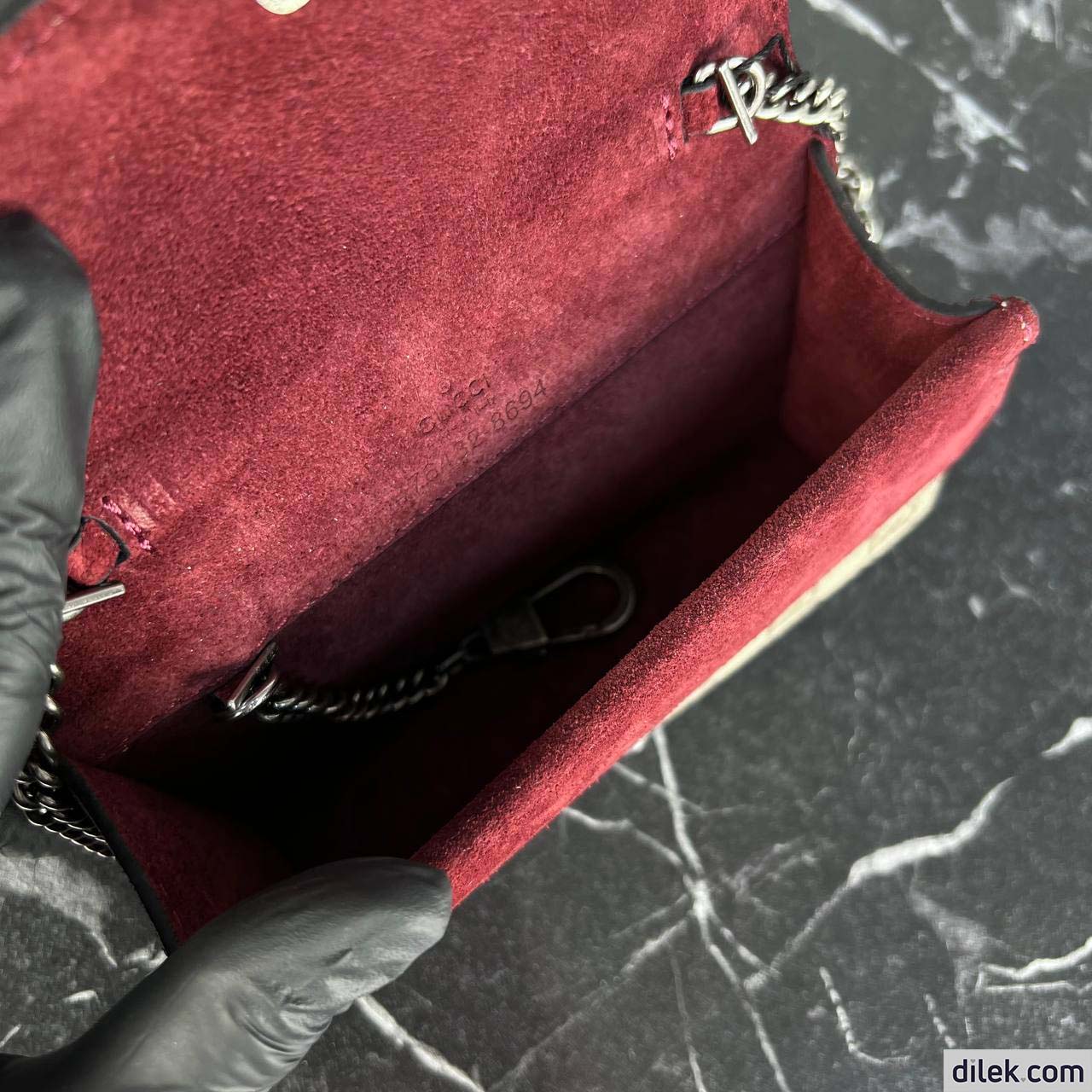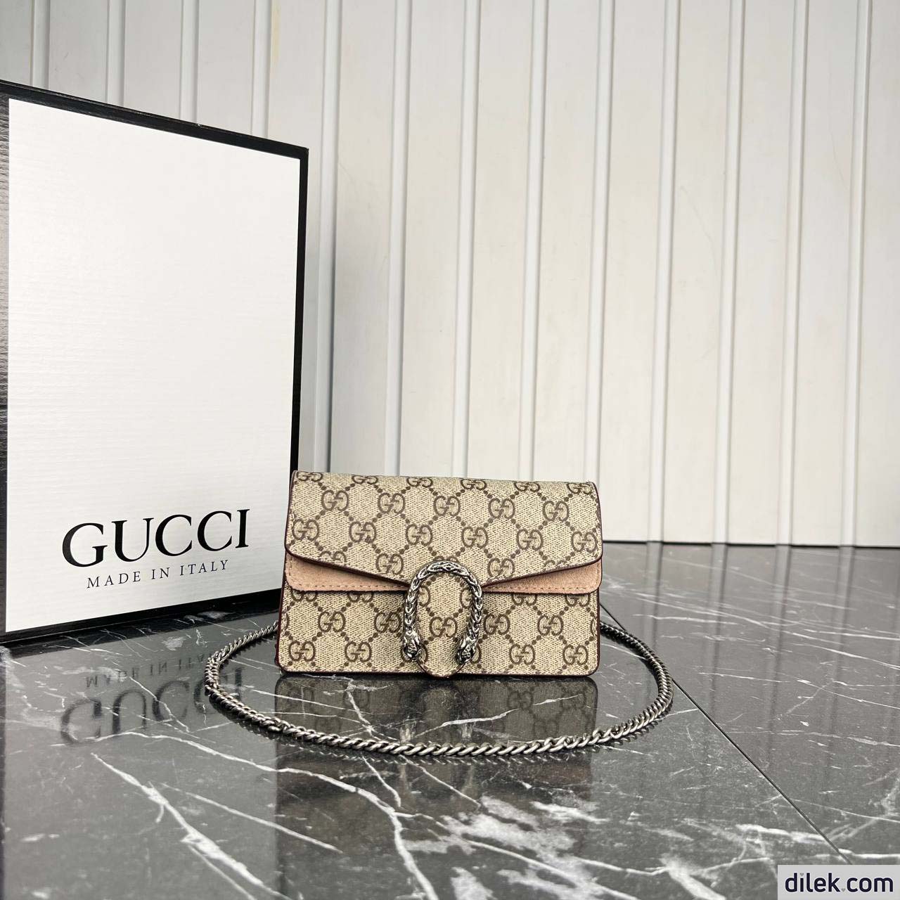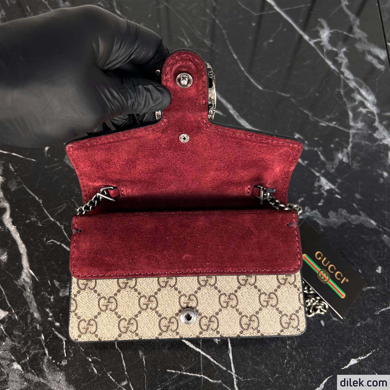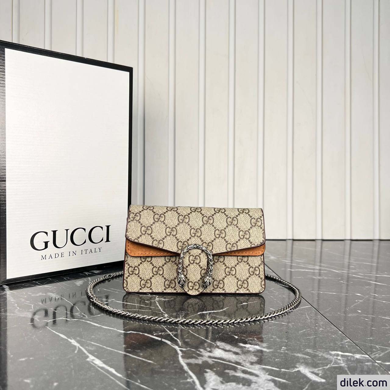 A structured GG Supreme canvas chain super mini shoulder bag with a key ring that can be used to attach this bag to a separate larger bag. The closure has the textured tiger head spur closure-a unique detail referencing the Greek god Dionysus, who in myth is said to have crossed the river Tigris on a tiger sent to him by Zeus. The accessory can also be worn as a crossbody bag.