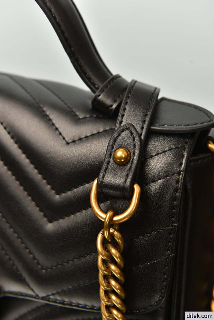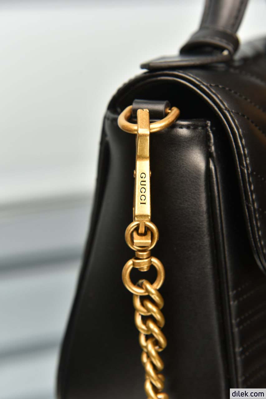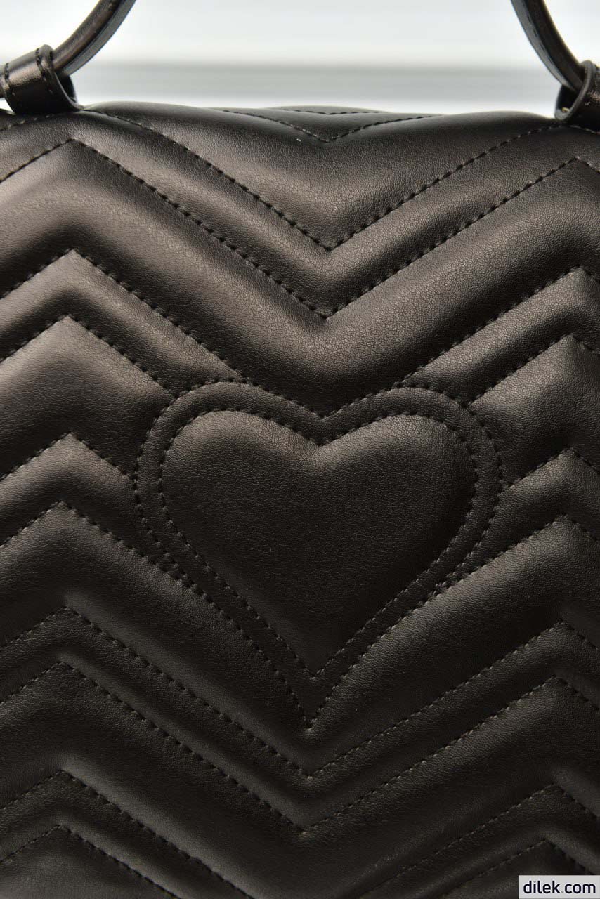 The small GG Marmont top handle bag has a softly structured shape and an oversized flap closure with Double G hardware. Made in matelassé chevron leather with a heart on the back.