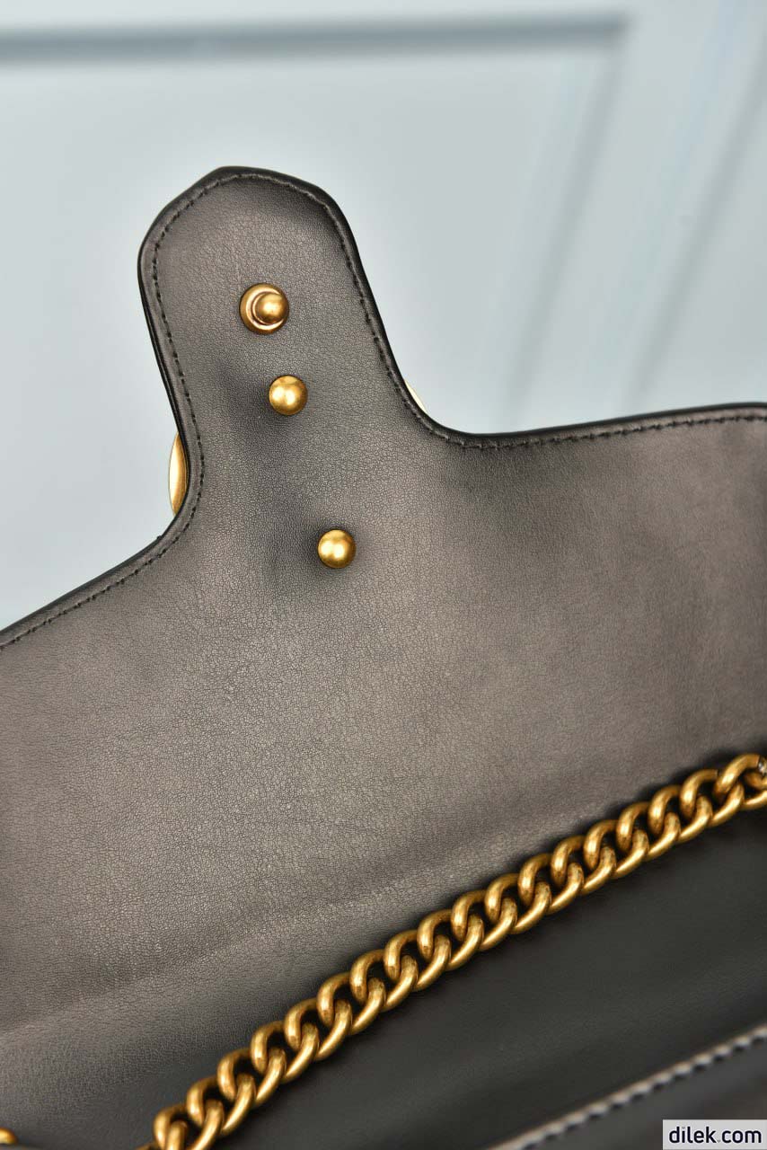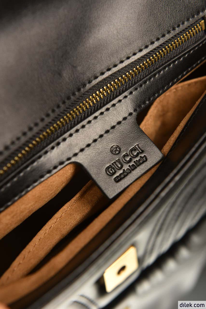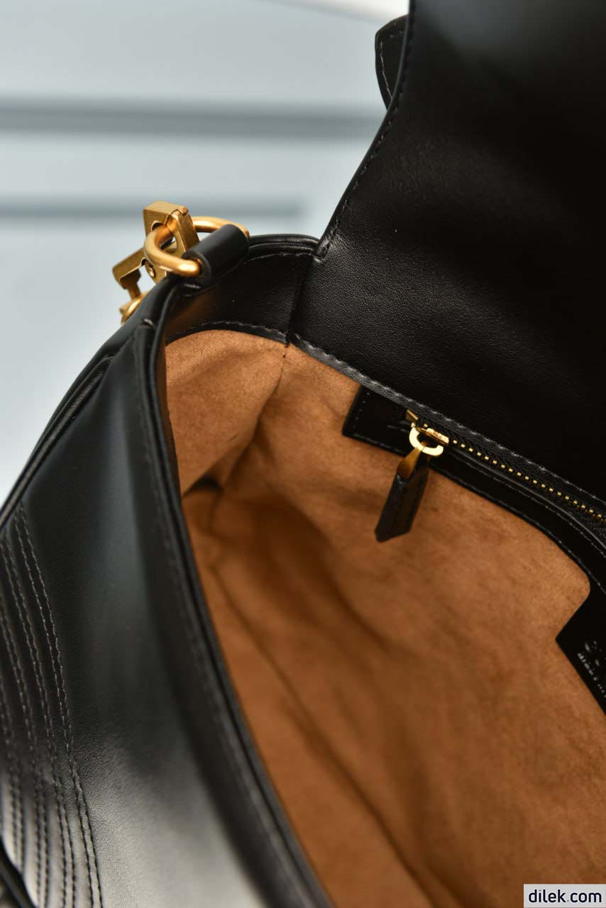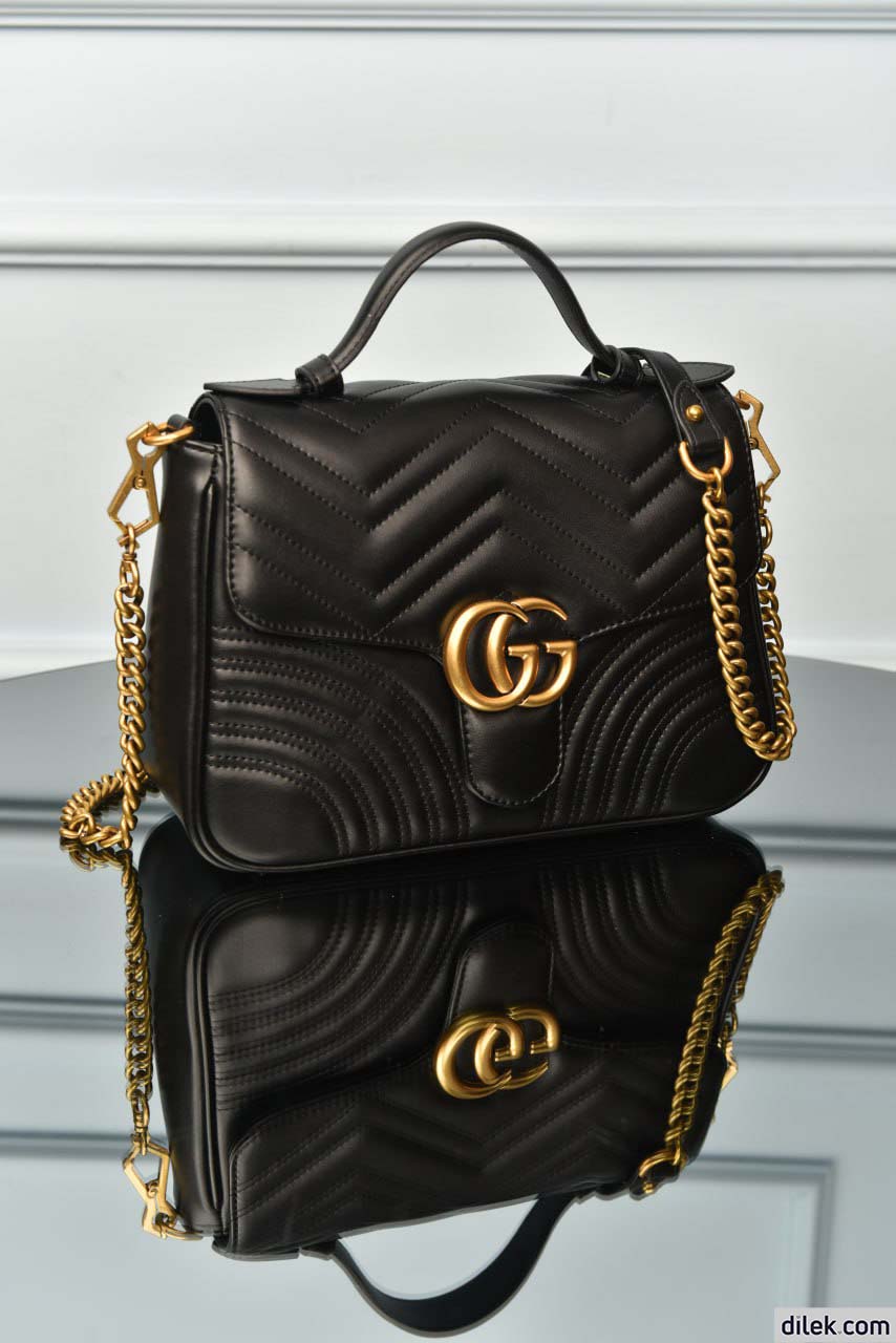 The small GG Marmont top handle bag has a softly structured shape and an oversized flap closure with Double G hardware. Made in matelassé chevron leather with a heart on the back.