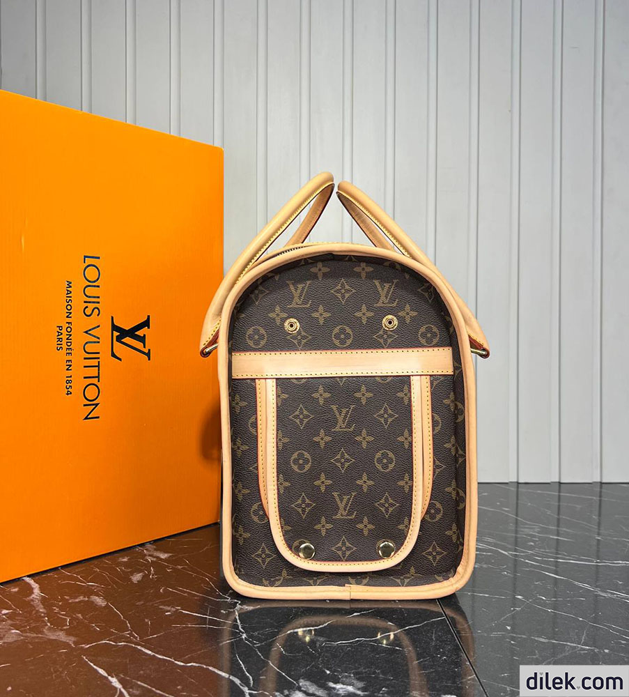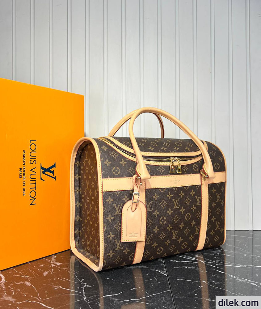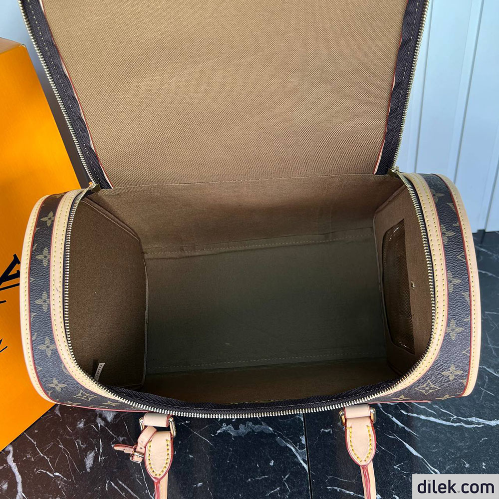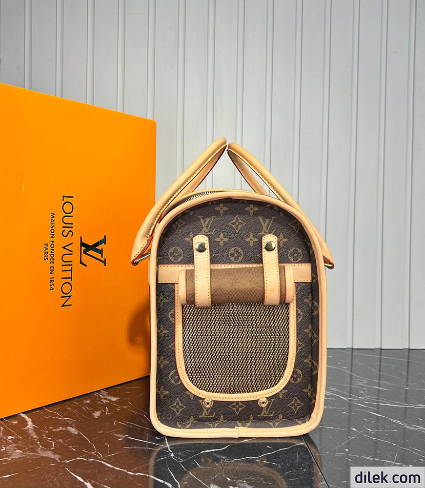 Louis Vuitton’s classic Dog Carrier has been updated with a sleek design and handy new functions. Styled in Monogram canvas with natural cowhide trim like the historic version, it’s designed for comfort with plush carpet and a soft ventilation net. Easy to carry with its adjustable shoulder strap, it’s the stylish, practical way to travel with a pet.