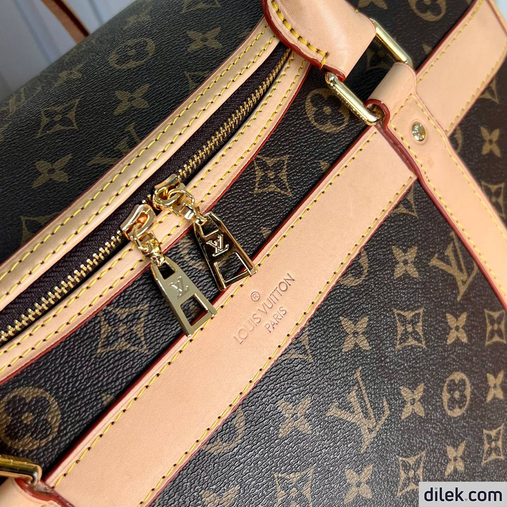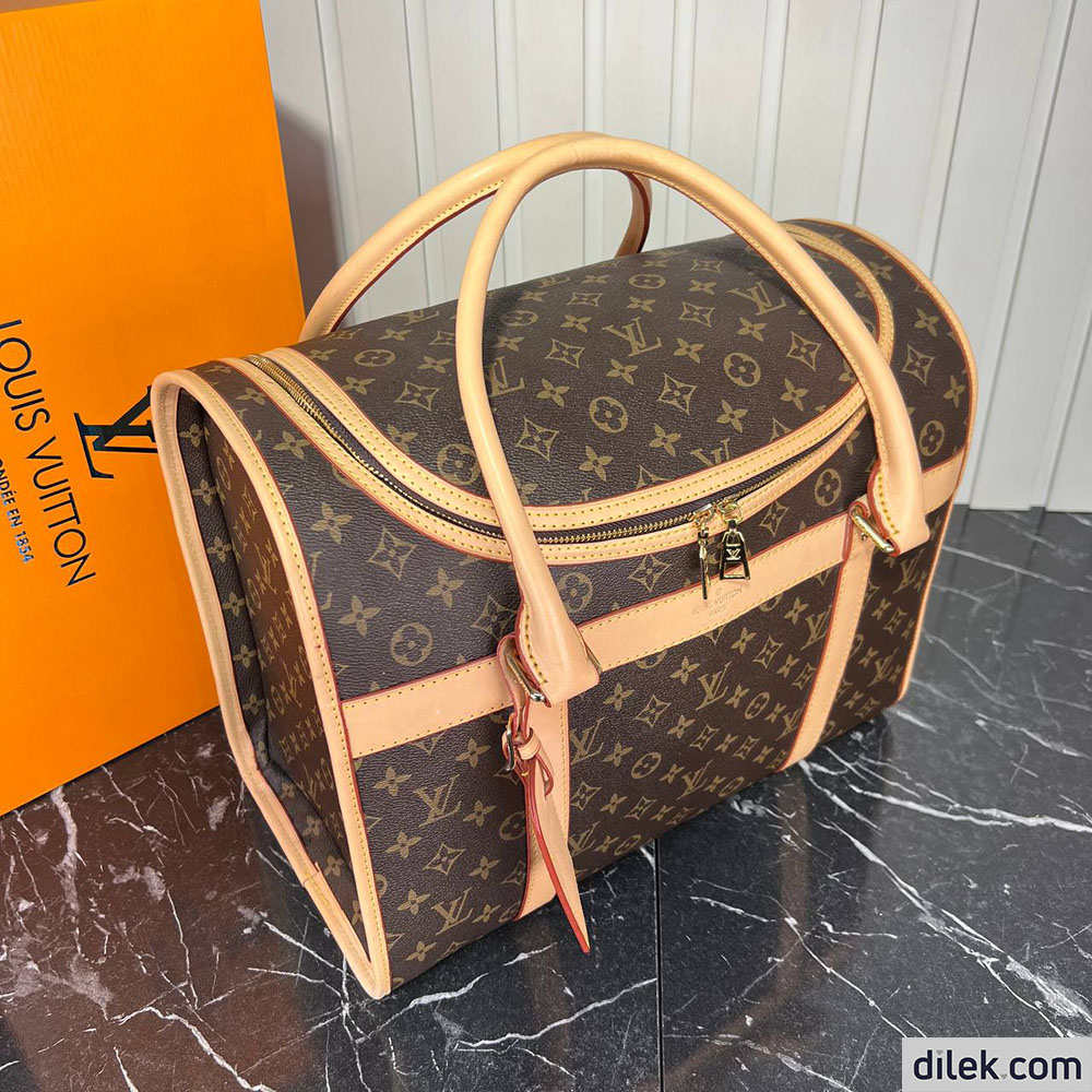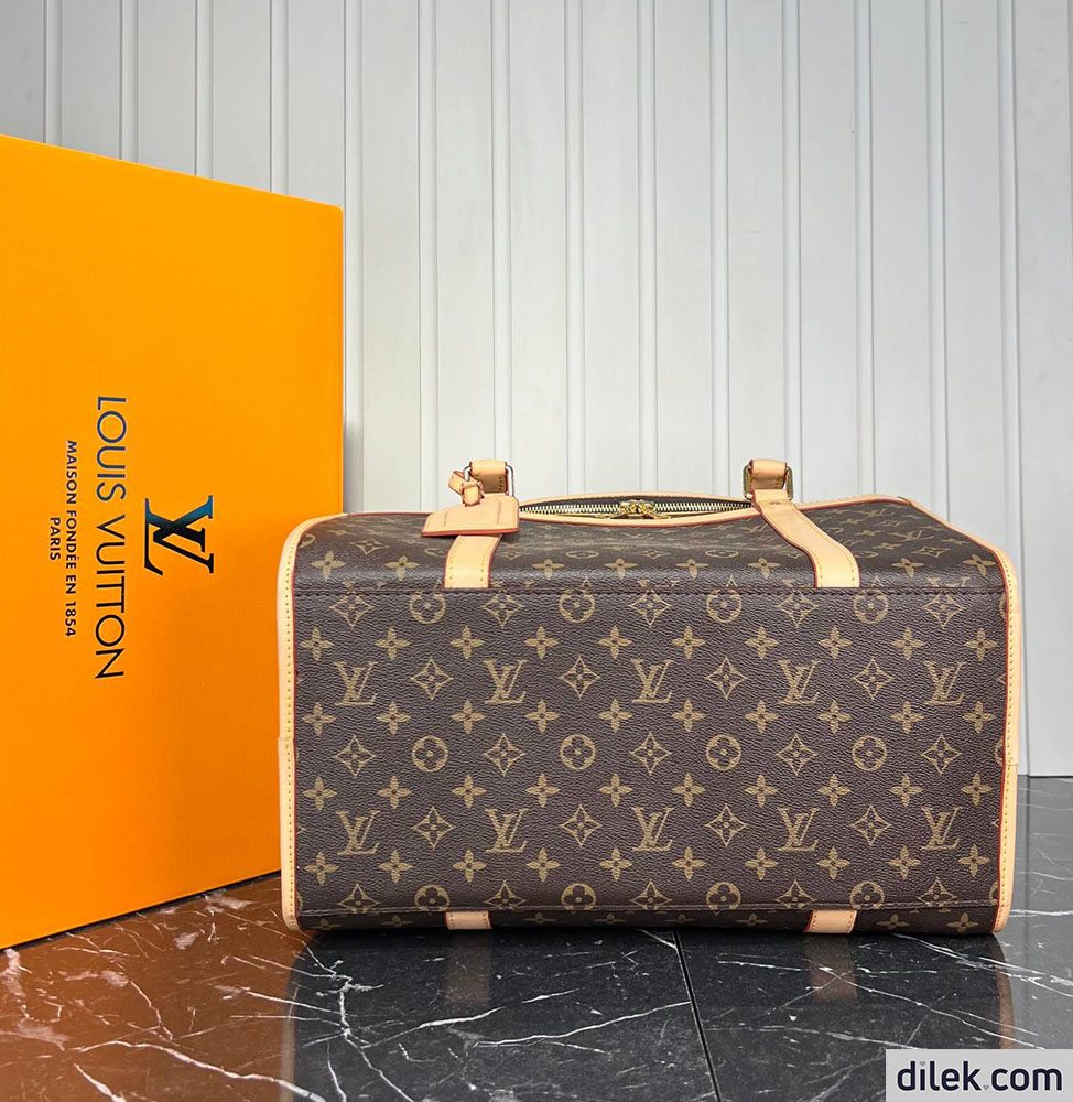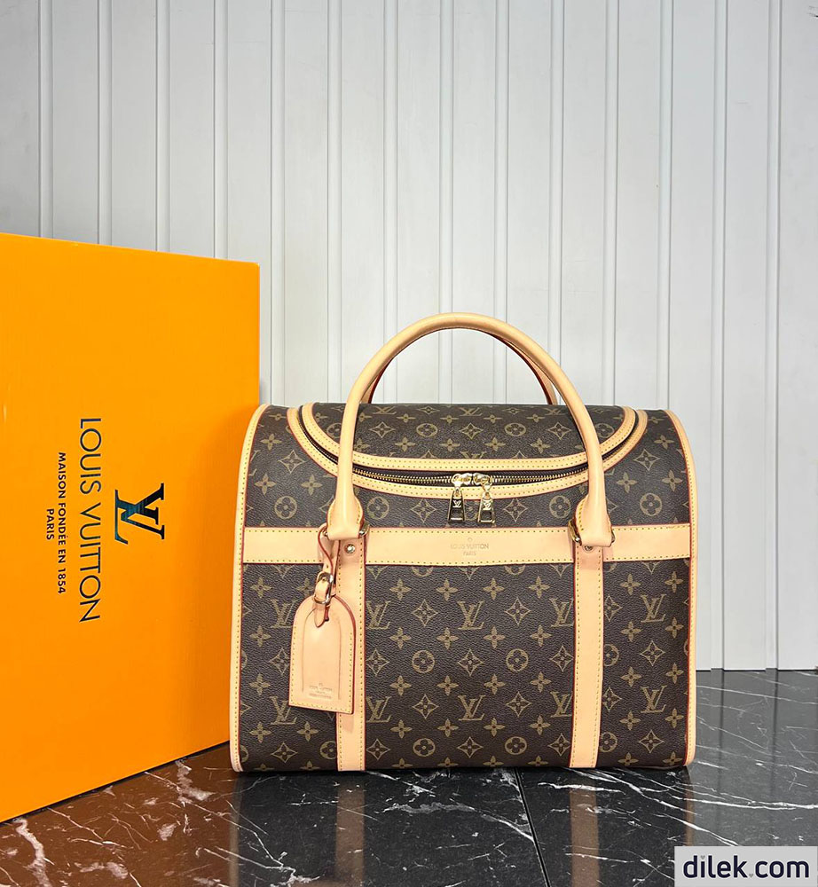 Louis Vuitton’s classic Dog Carrier has been updated with a sleek design and handy new functions. Styled in Monogram canvas with natural cowhide trim like the historic version, it’s designed for comfort with plush carpet and a soft ventilation net. Easy to carry with its adjustable shoulder strap, it’s the stylish, practical way to travel with a pet.