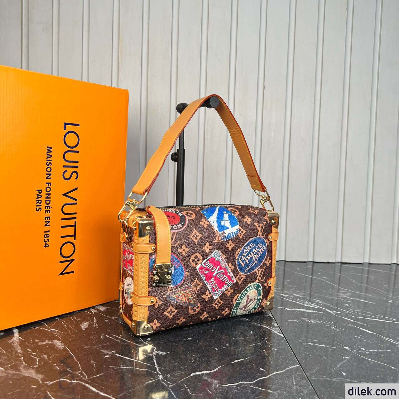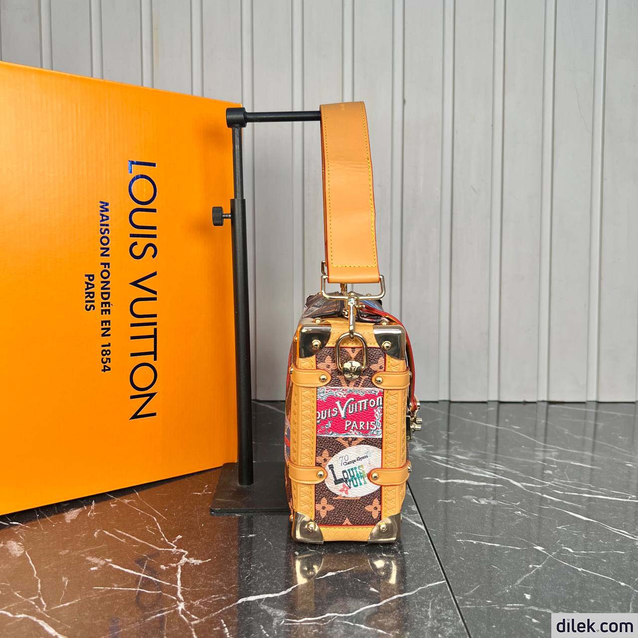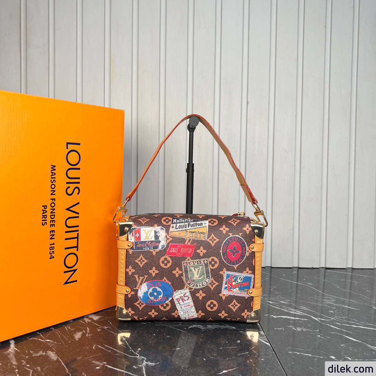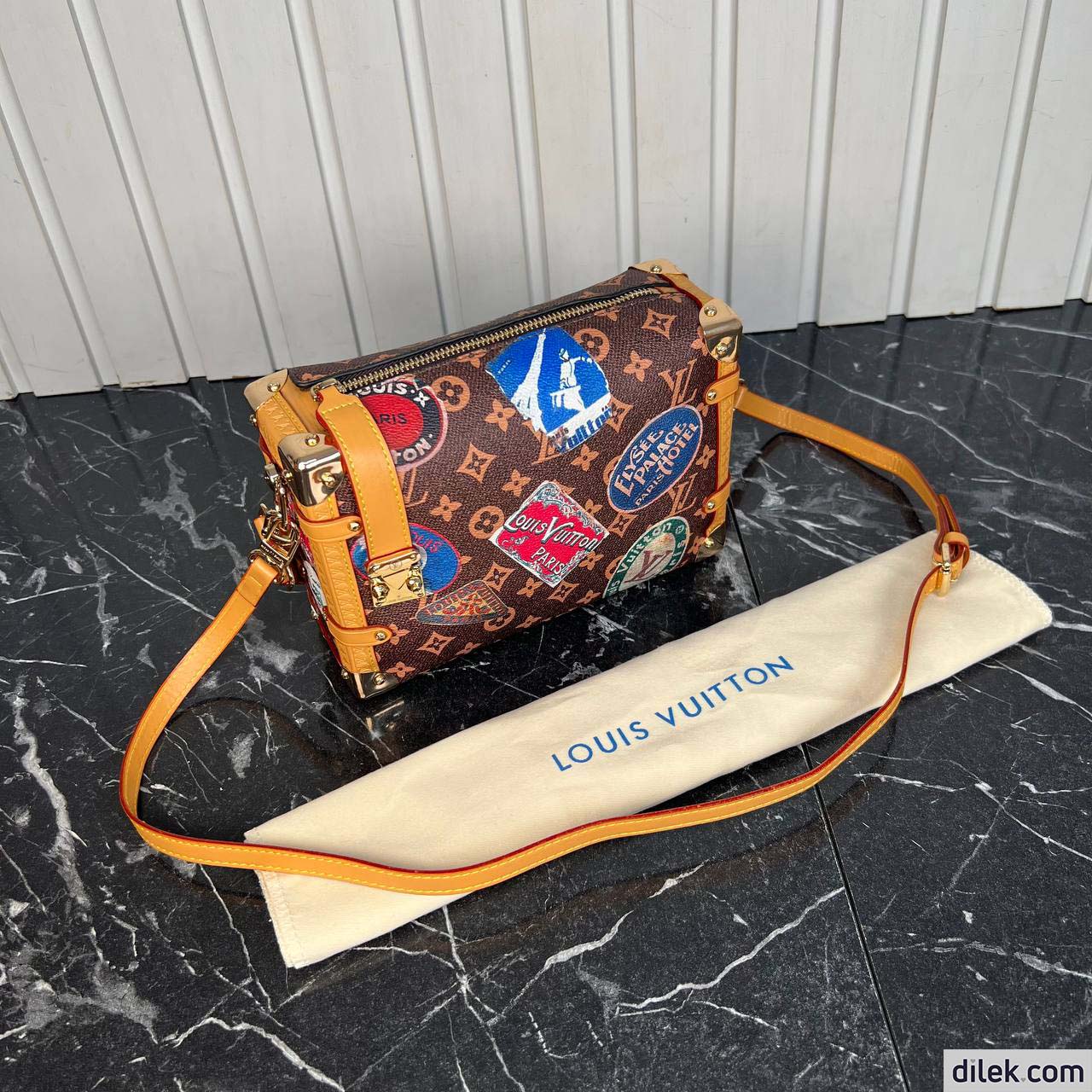 From the Spring-Summer 2024 show comes this Side Trunk MM handbag. It is inspired by the Maison’s archive-trunk Monogram canvas, made of a blend of cotton and linen glazed with resin for a superbly soft hand. Decorated with hotel labels that pay tribute to Gaston-Louis Vuitton’s fabulous collection, the bag is trimmed in heritage natural cowhide-leather. Both handle and strap are removable.