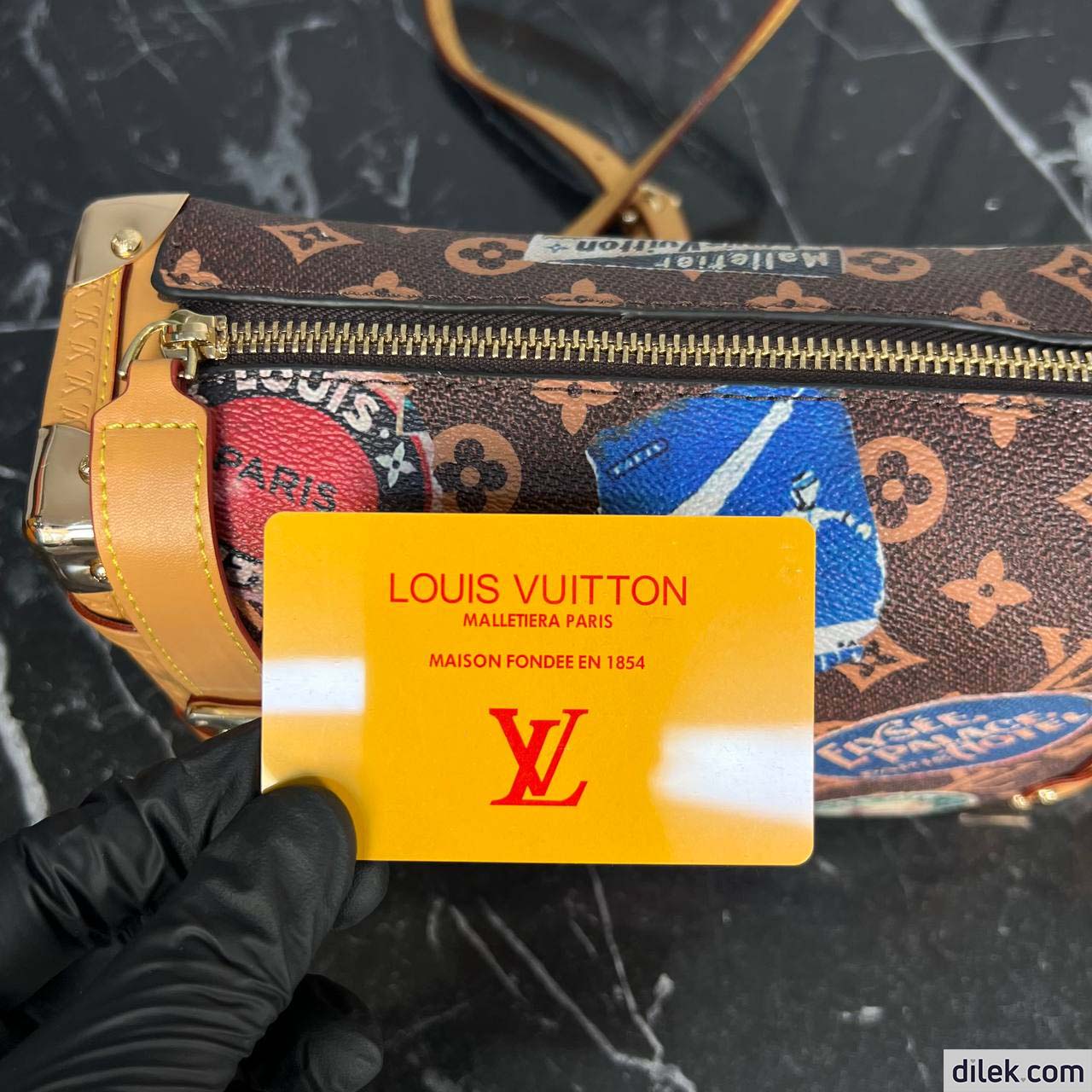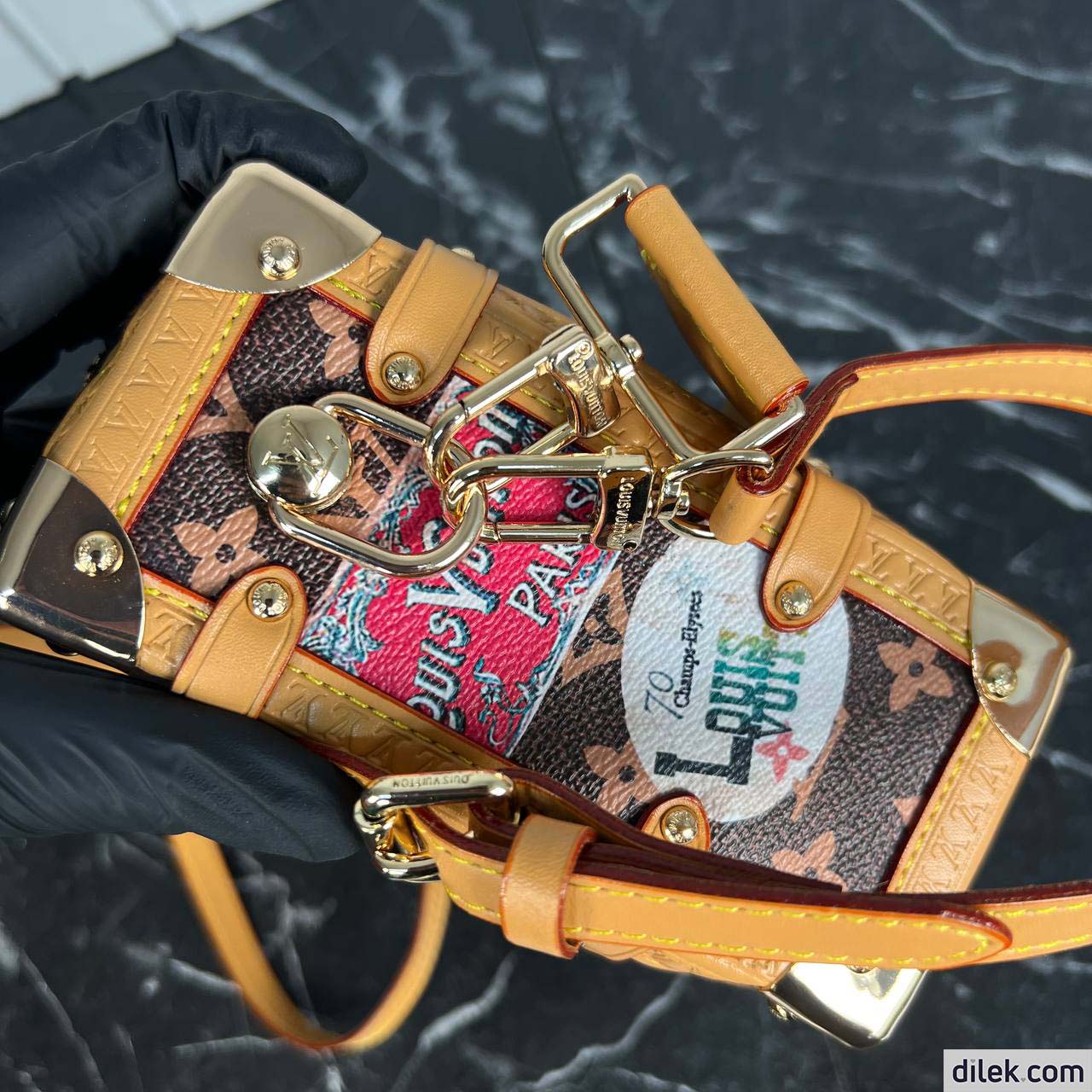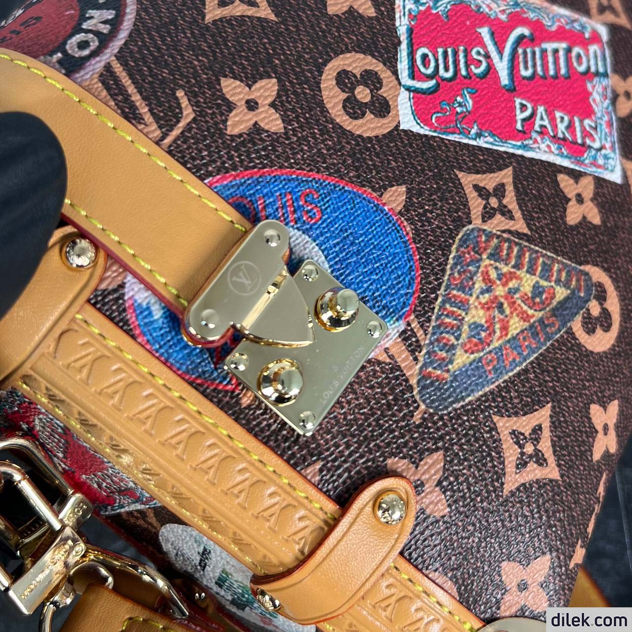 From the Spring-Summer 2024 show comes this Side Trunk MM handbag. It is inspired by the Maison’s archive-trunk Monogram canvas, made of a blend of cotton and linen glazed with resin for a superbly soft hand. Decorated with hotel labels that pay tribute to Gaston-Louis Vuitton’s fabulous collection, the bag is trimmed in heritage natural cowhide-leather. Both handle and strap are removable.