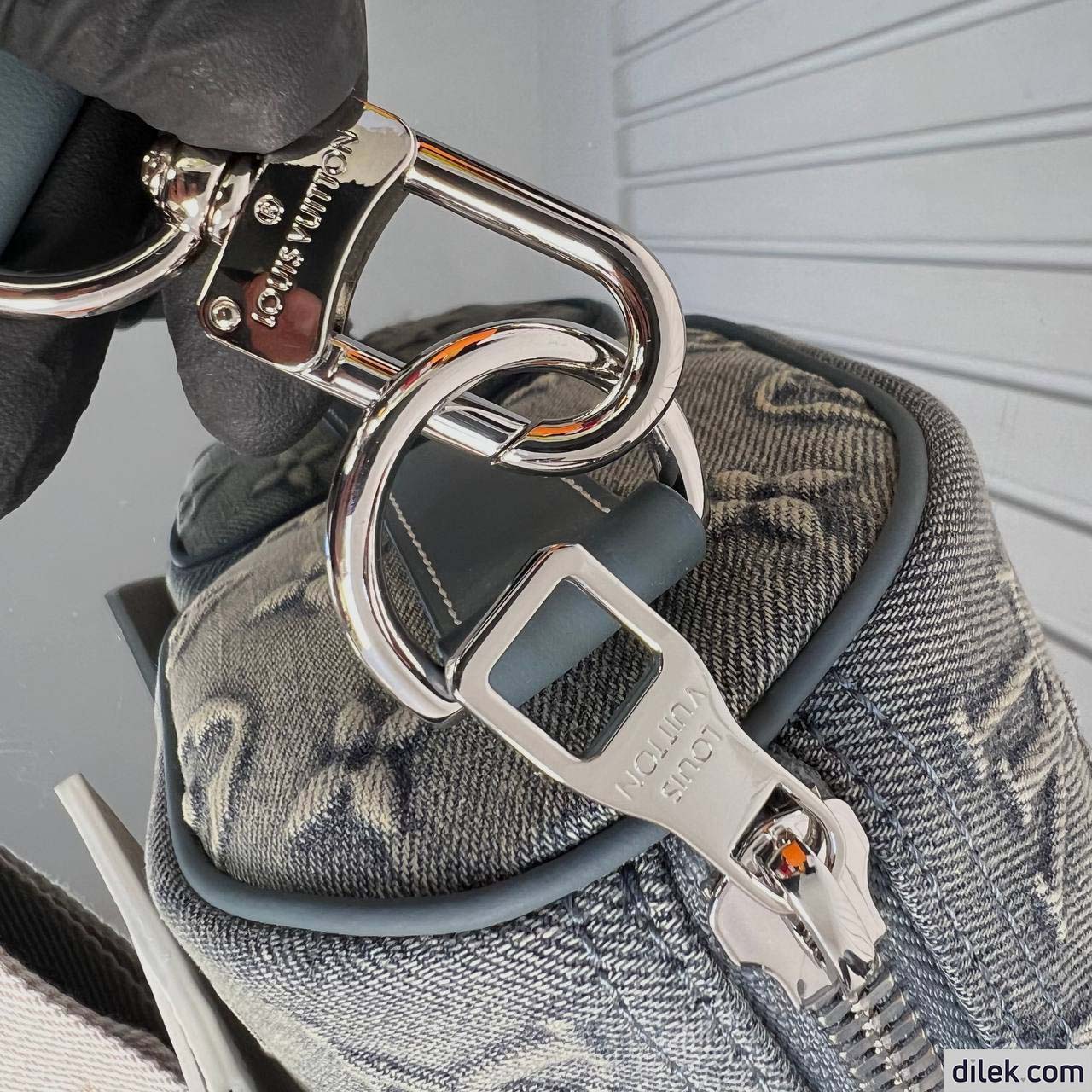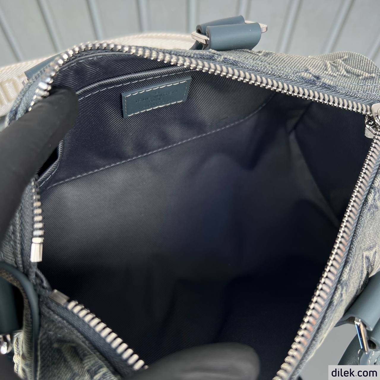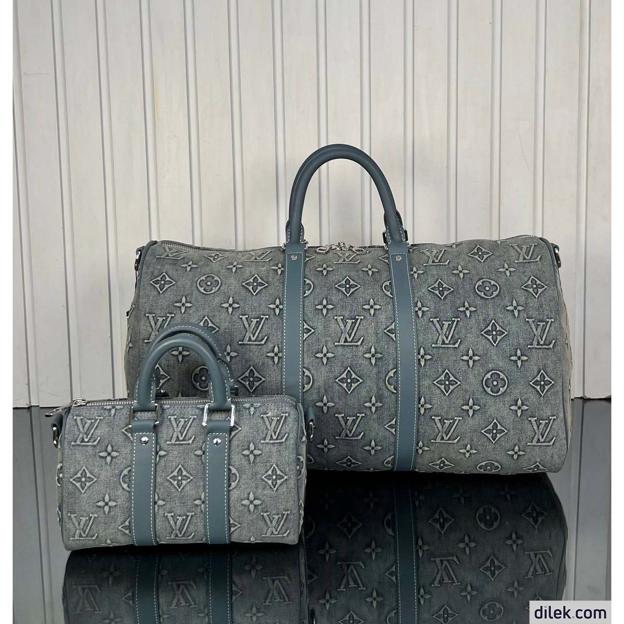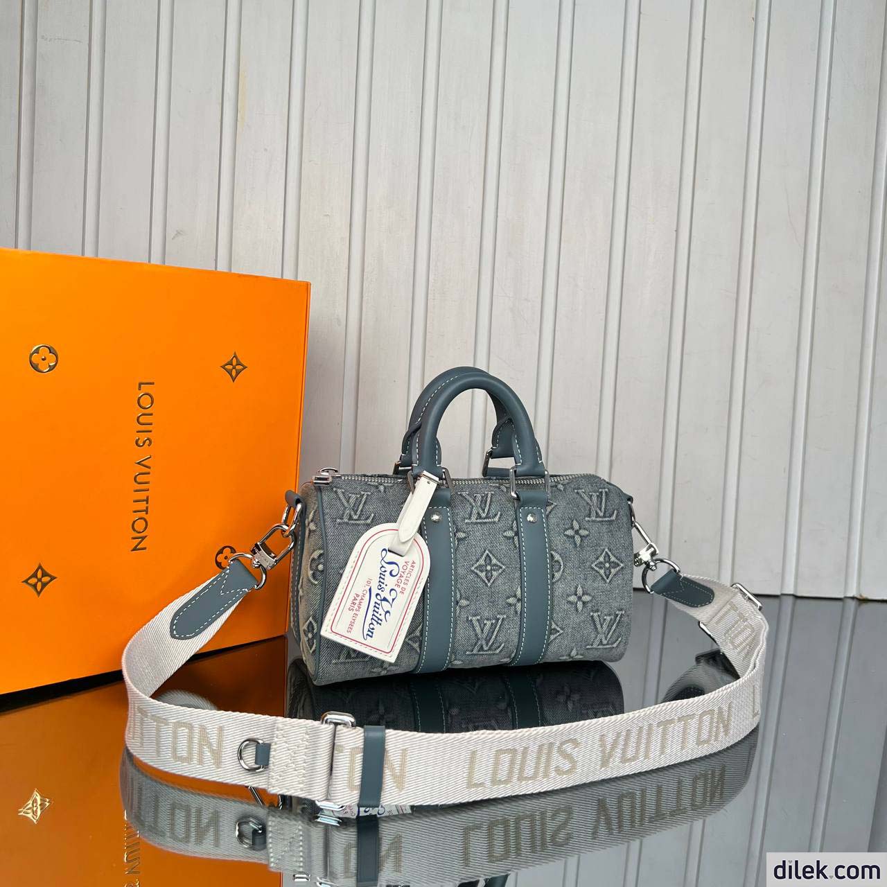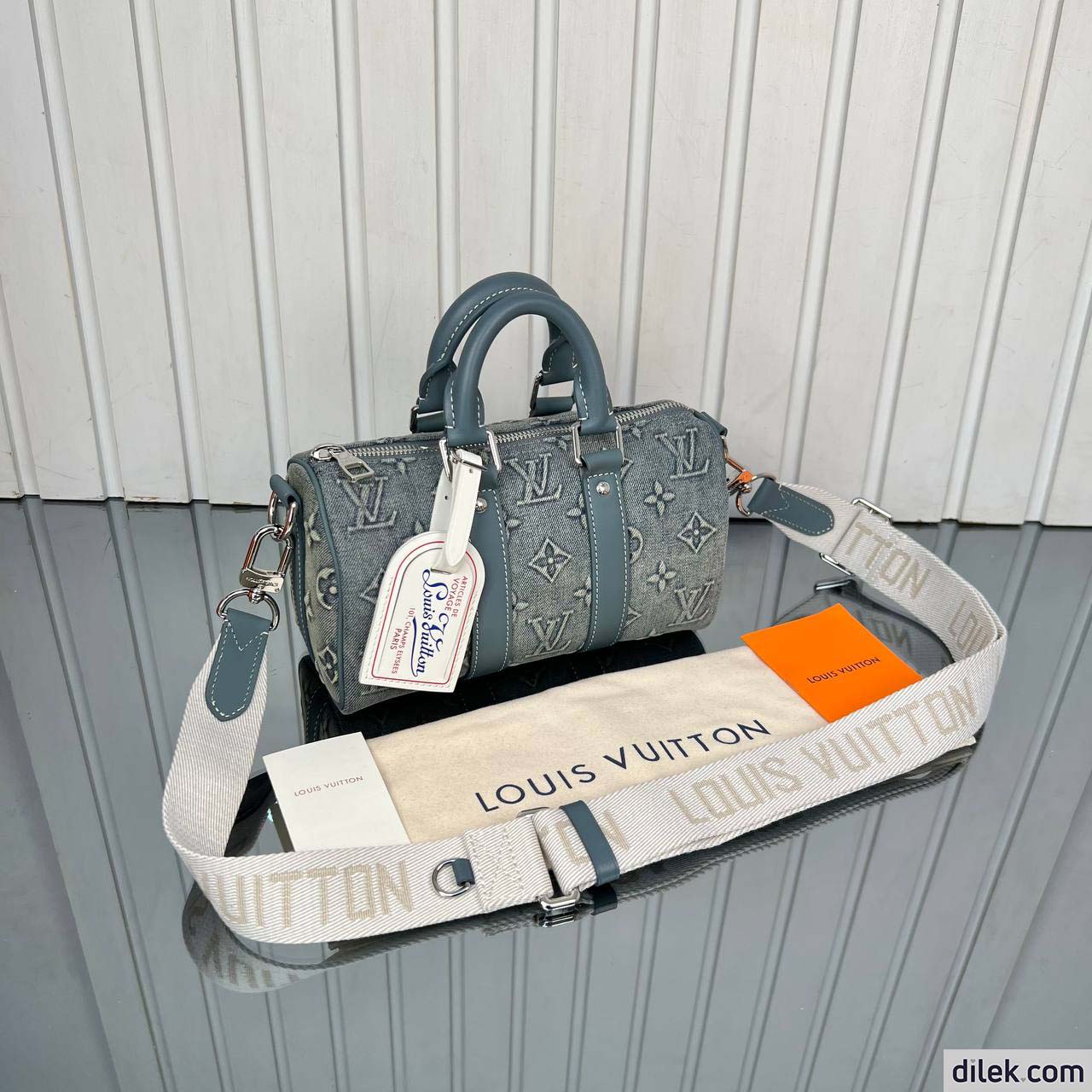 The Keepall Bandoulière 25 bag takes on a vintage feel in Monogram Washed Denim canvas, with its slightly worn, faded denim look. The Monogram is debossed into the fabric which is then hand-sprayed to emphasize the Monogram Flowers and LVs. The bag features a retro-style name tag and a detachable and adjustable strap for shoulder carry.