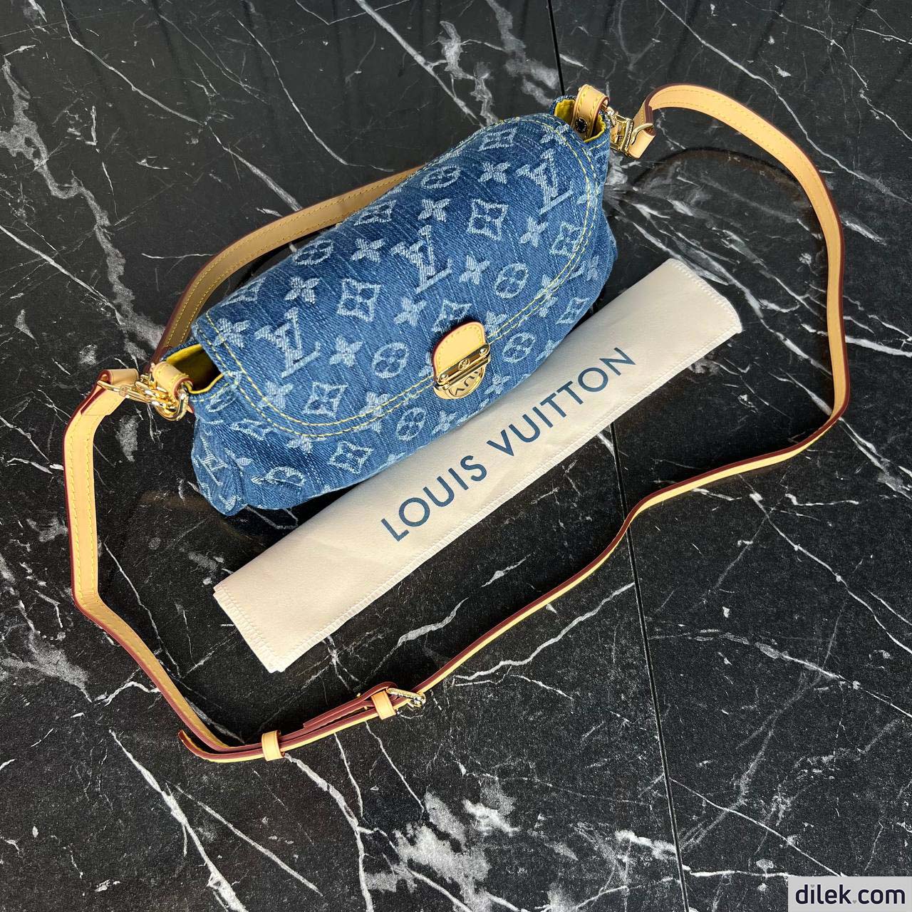 LOUIS VUITTON Monogram Denim Mini Pleaty in Blue. This chic baguette is crafted of Louis Vuitton monogram denim. The bag features a vachetta cowhide leather shoulder strap with polished brass hardware and a frontal flap with a brass press lock. This opens to a bright mango microfiber interior with a patch pocket. This is the perfect versatile compact casual bag from Louis Vuitton!