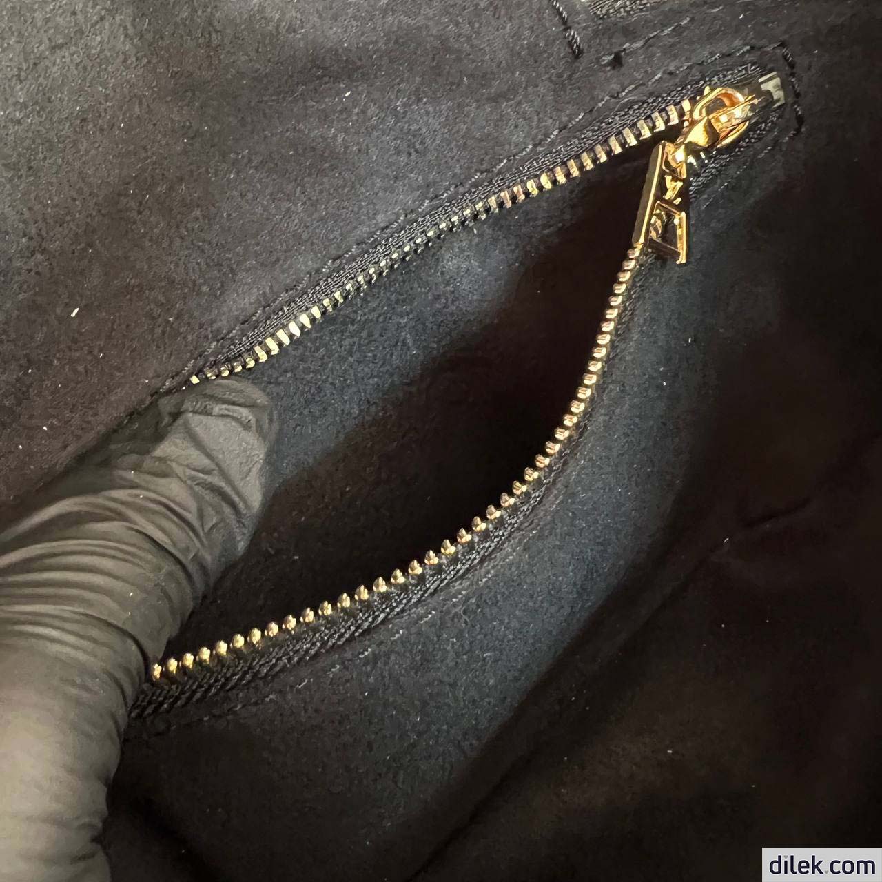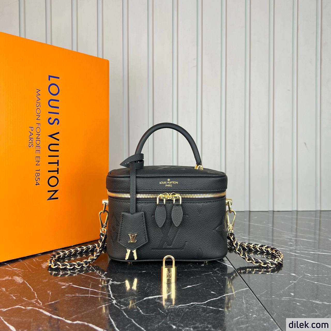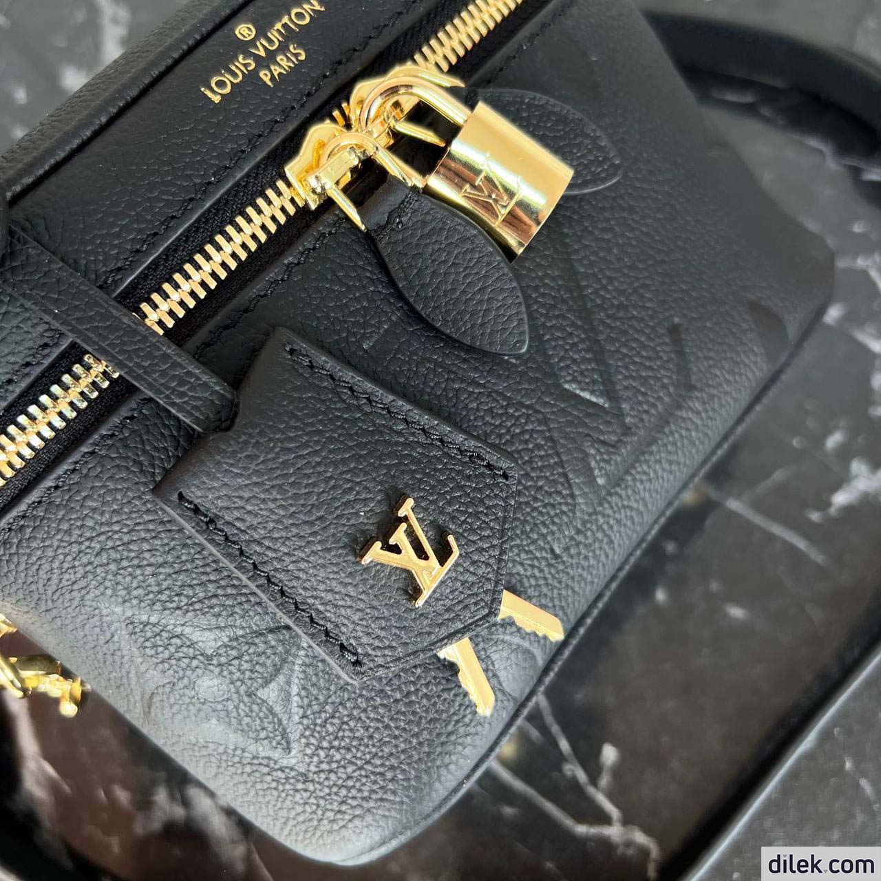 This Ink Vanity PM bag is of black leather with golden brass hardware and features monogram embossed black leather, black leather trim, a zip closure, a removable leather and chain strap, removable key clochette and top handle.
